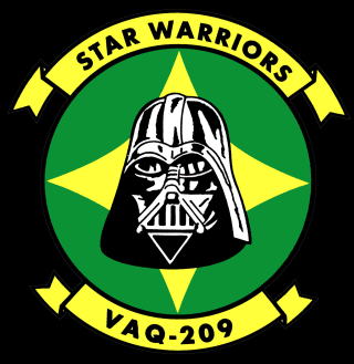 映画スタ−ウォーズの悪役ダースベーダーを部隊マークにした変わり物の飛行隊。米海軍も既存の部隊があらゆる固有名詞を使いまくってきたので、部隊名のネタが無いのであろう。しかし、この映画も第1作がもう30年以上前に作られているから古い映画に数えられる様になったんですな・・海軍予備役飛行隊の一つでCVWR-20に属し、以前は2つしかなかったEA-6A(EA-6Bではない)を所有する電子戦専門飛行隊だった。一昔ならこの部隊が日本で撮影できるなんて有り得なかったが、電子戦専用の飛行隊に限っては、様々な部隊がローテーションで岩国に配備されるようになったので、こんなレアな部隊まで撮れるチャンスが訪れた。CVWR-20はジョージア州アトランタを本拠地にするが,VAQ-209はNAFワシントンに部隊を置いている。(2006年2月 記)