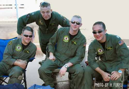 ↑ 上写真は、2004年9月の三沢Openhouse時に撮影したVAW-115の面々、久々にCVW-5のメンバーに会うことができたが、同行の友人は私のHPの為に、わざわざデジカメ持参で撮ってくれた。パイロットのヘルメットも部隊マーク入りのしゃれたものである。