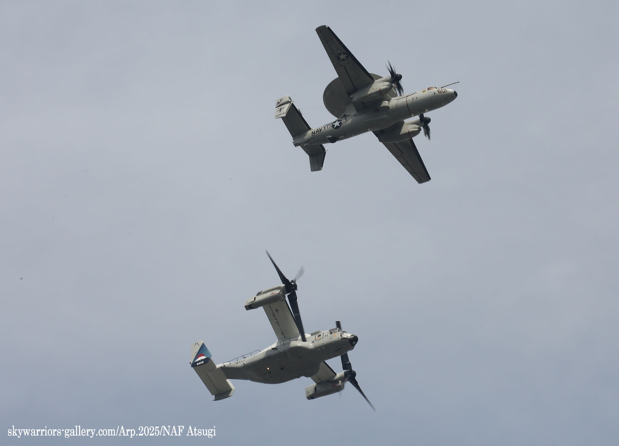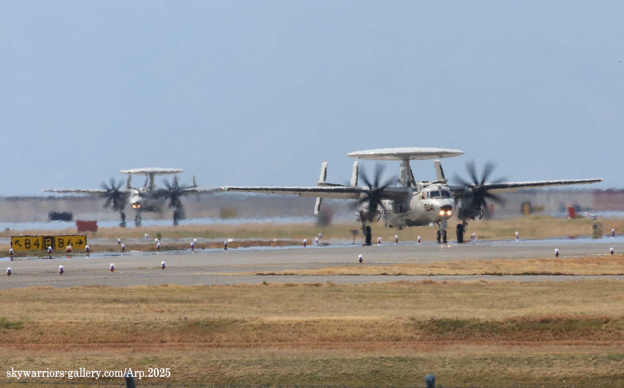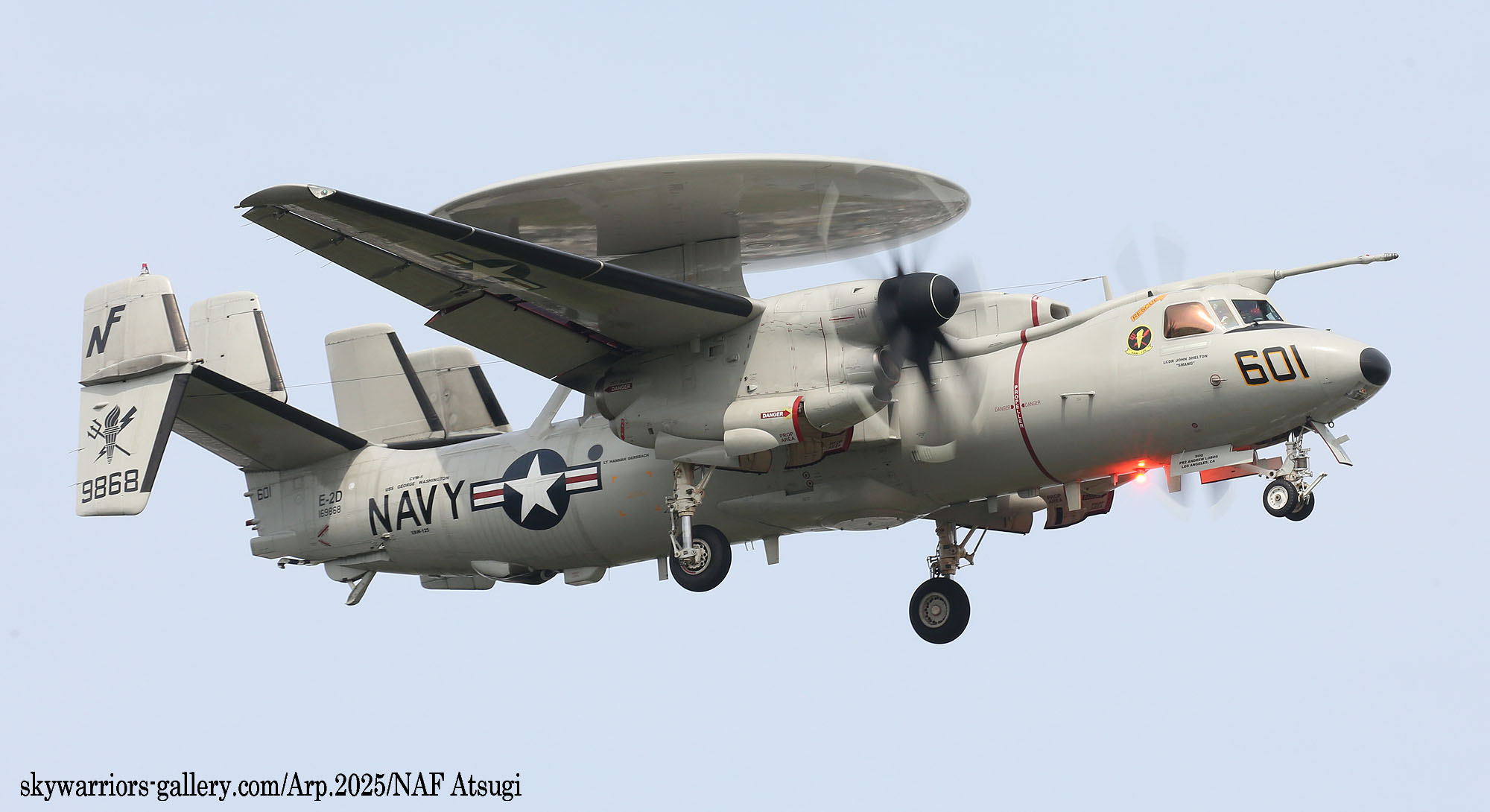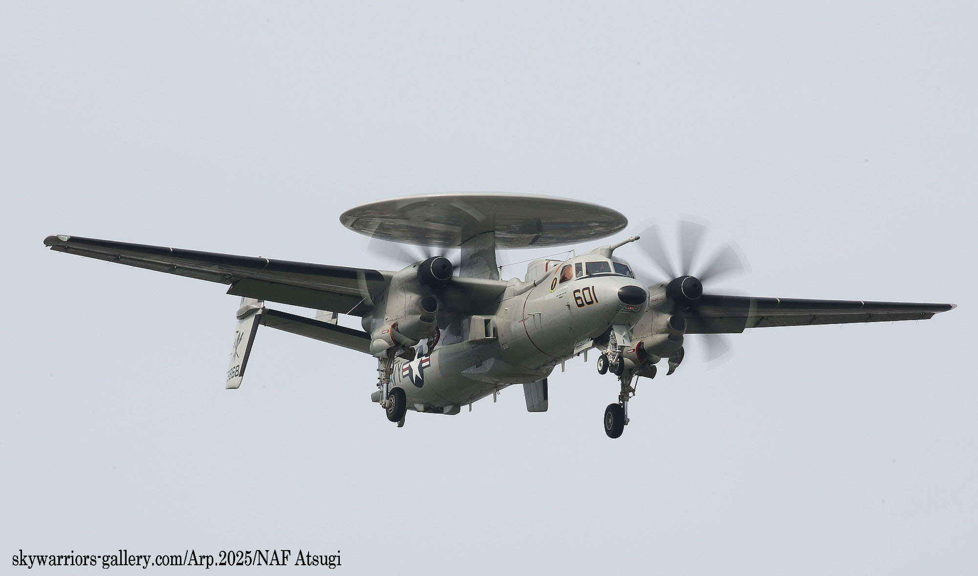 ↑ 2025年4月18日金曜日 厚木基地に飛来したVAW-125のE-2D/NF-601。CVW-5傘下の飛行隊で唯一国籍マークからフルカラーの航空機で美しい。翌日開催される厚木基地の航空祭に展示される予定で岩国から計11機の航空機が飛来した。