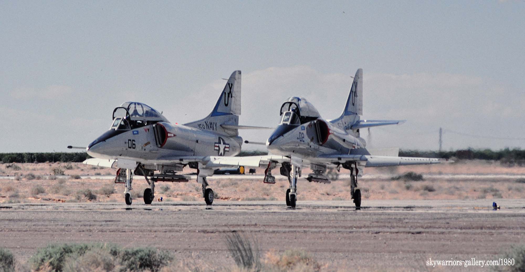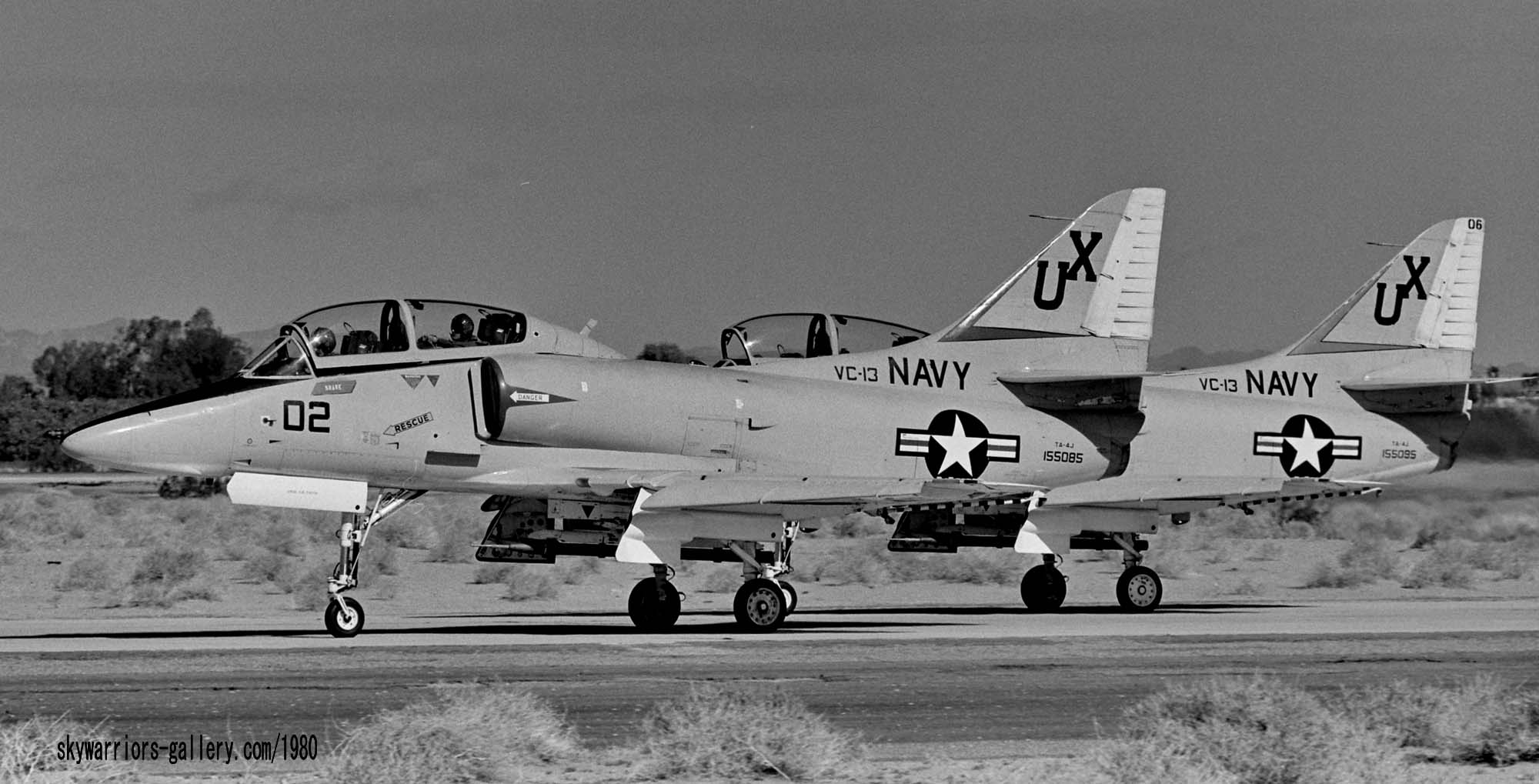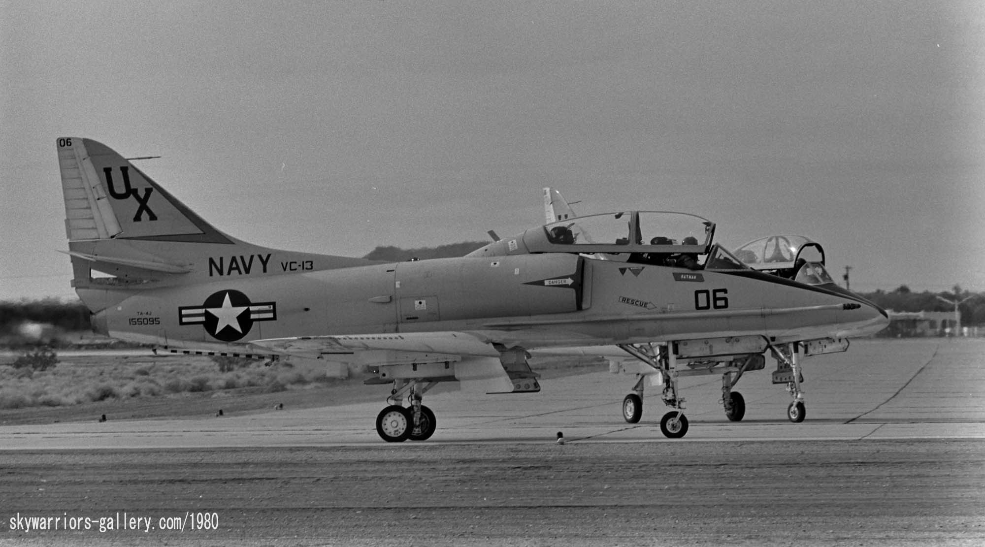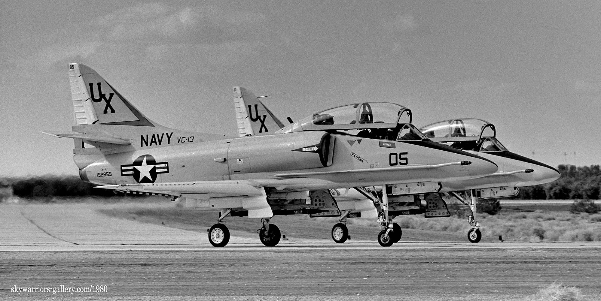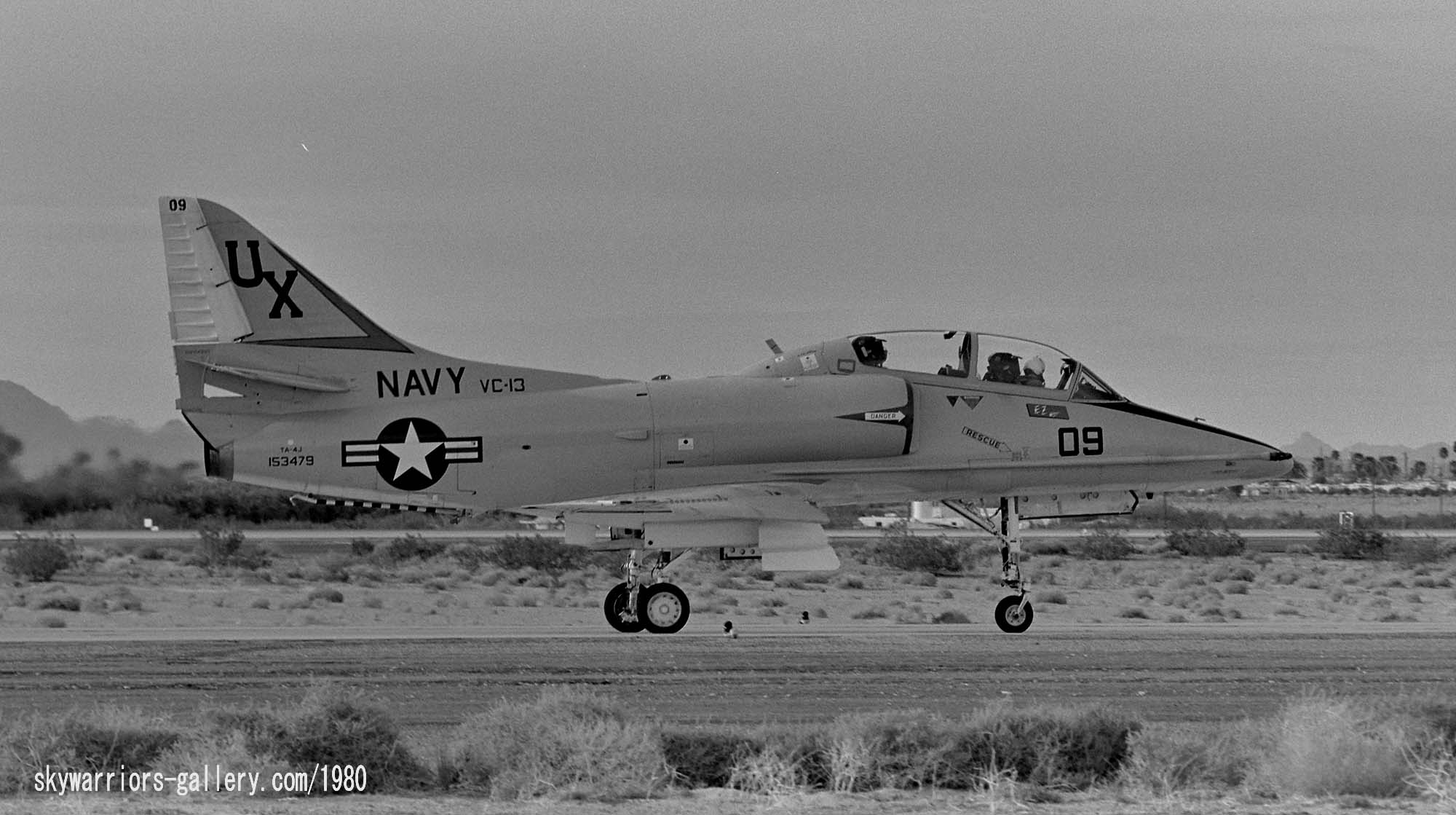 MCAS YUMAをタキシングするVC-13の面々、1976年に受領したTA-4Jは、7年間も使い続けられ A-4Eに交換された。この部隊最初にA-4Lを受け取ってから 最後にA-4Fを手放すまで おおよそ20年間もスカイホークシリーズを使い続けた部隊であった。軽量、単発で小型、(デルタ翼は、外板が薄くても構造上丈夫な為 軽量化には有利 しかも加速がしやすい特性がある)しかも 急降下爆撃から各種任務何でもこなせた”小さな巨人”であったから 艦隊支援など飛行隊の使命にはもってこいであったのだろう。空軍で言えばF-5やT-38に相当する機体である。