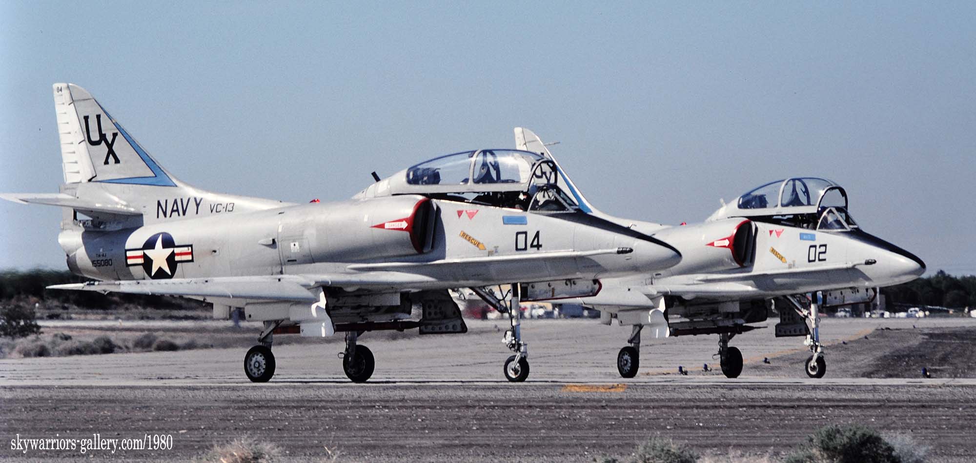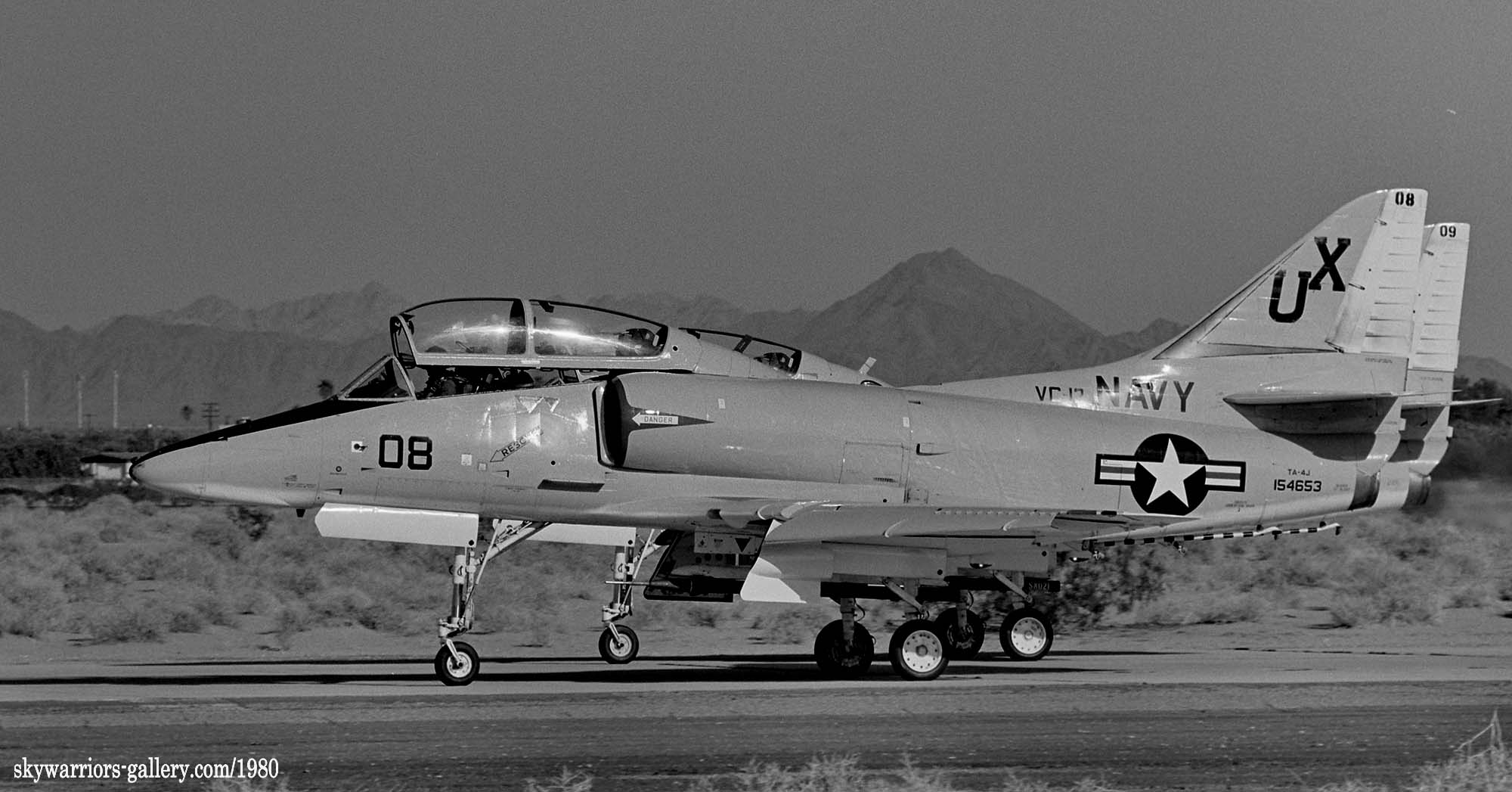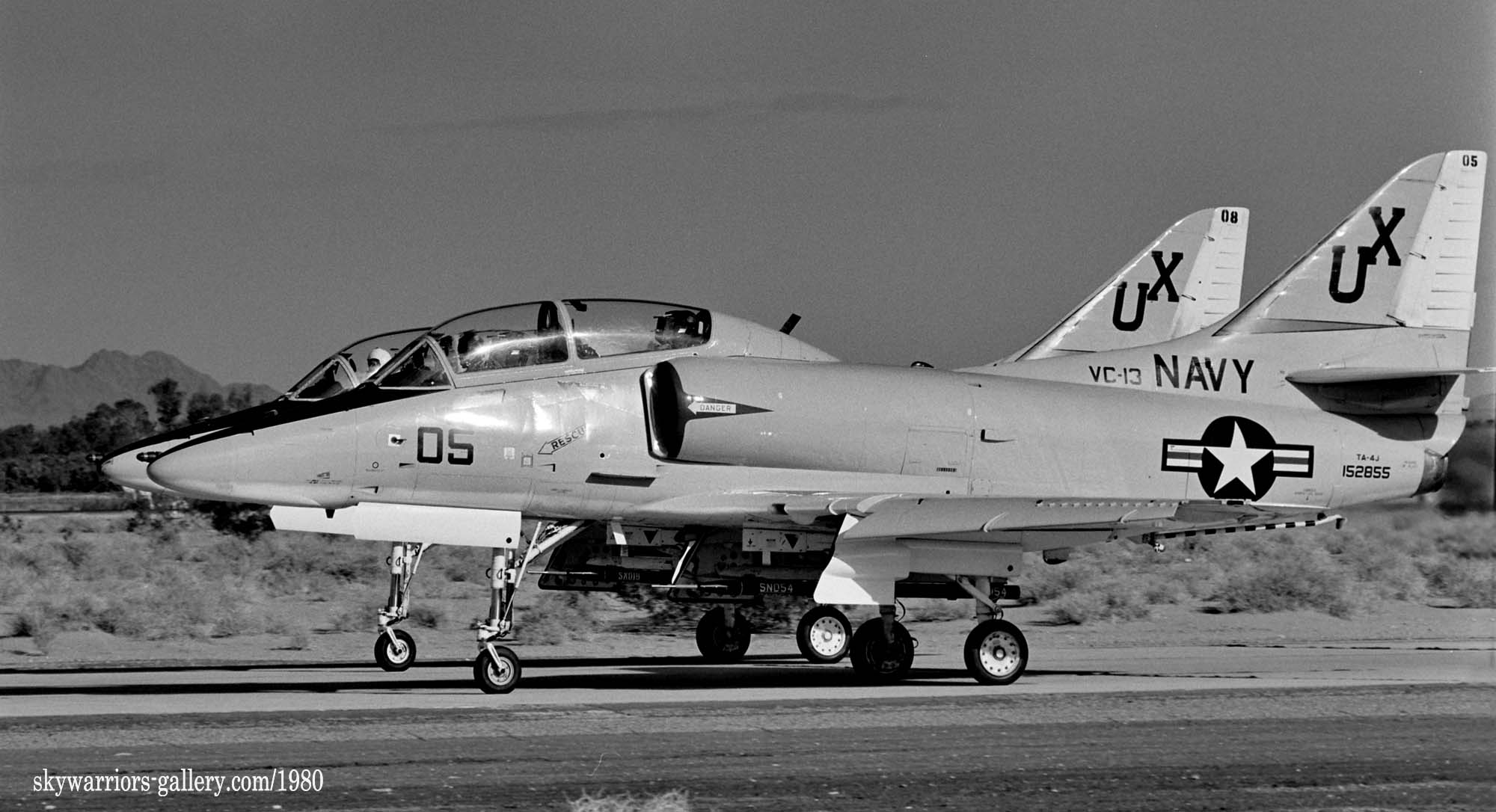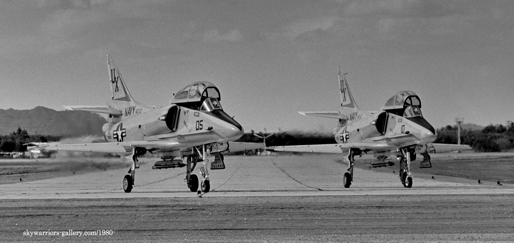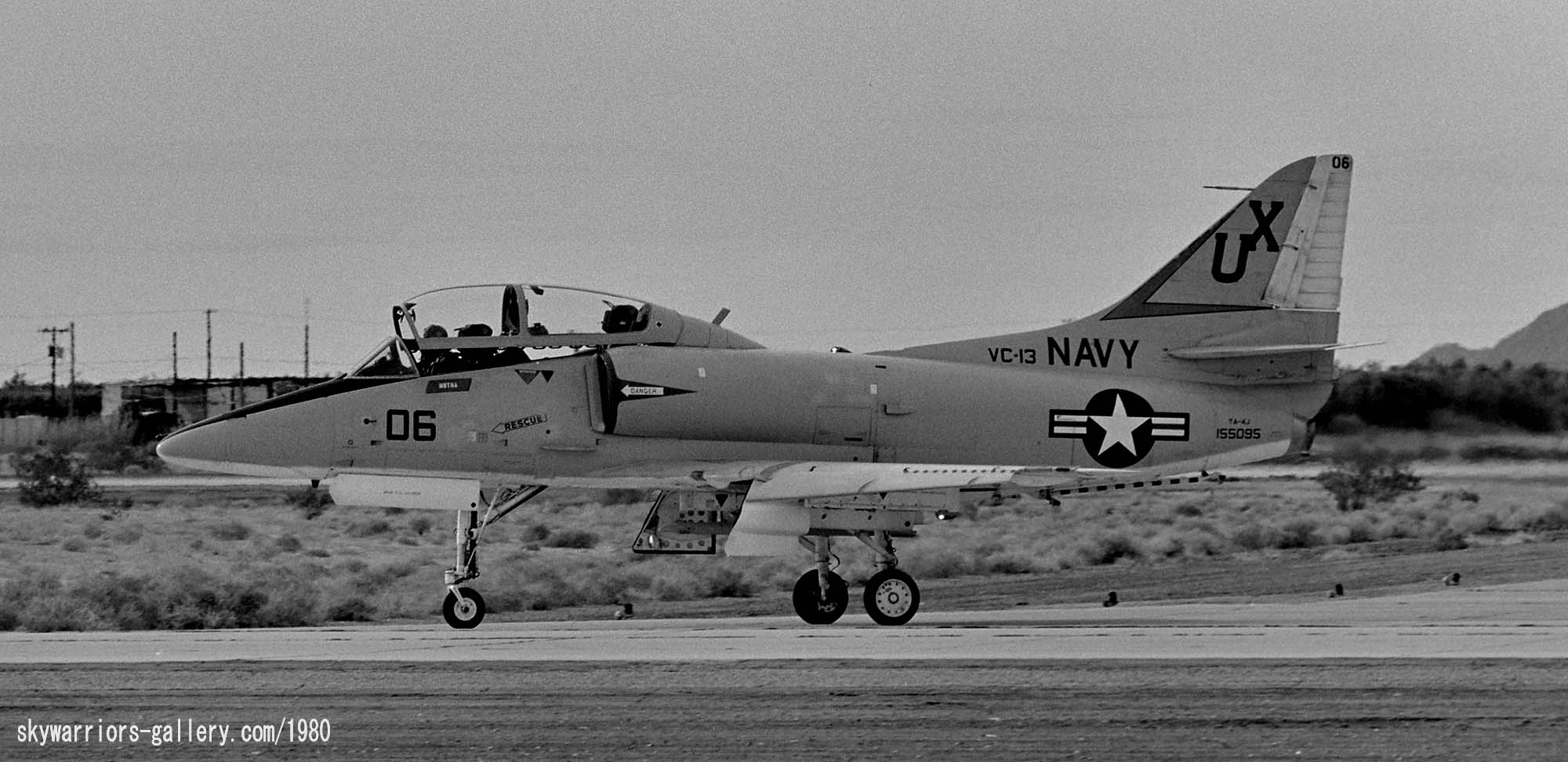 MCAS YUMAをタキシングするVC-13の面々、1976年に受領したTA-4Jは、7年間も使い続けられ A-4Eに交換された。この部隊最初にA-4Lを受け取ってから 最後にA-4Fを手放すまで おおよそ20年間もスカイホークシリーズを使い続けた部隊であった。軽量、単発で小型、(デルタ翼は、外板が薄くても構造上丈夫な為 軽量化には有利 しかも加速がしやすい特性がある)しかも 急降下爆撃から各種任務何でもこなせた”小さな巨人”であったから 艦隊支援など飛行隊の使命にはもってこいであったのだろう。空軍で言えばF-5やT-38に相当する機体である。