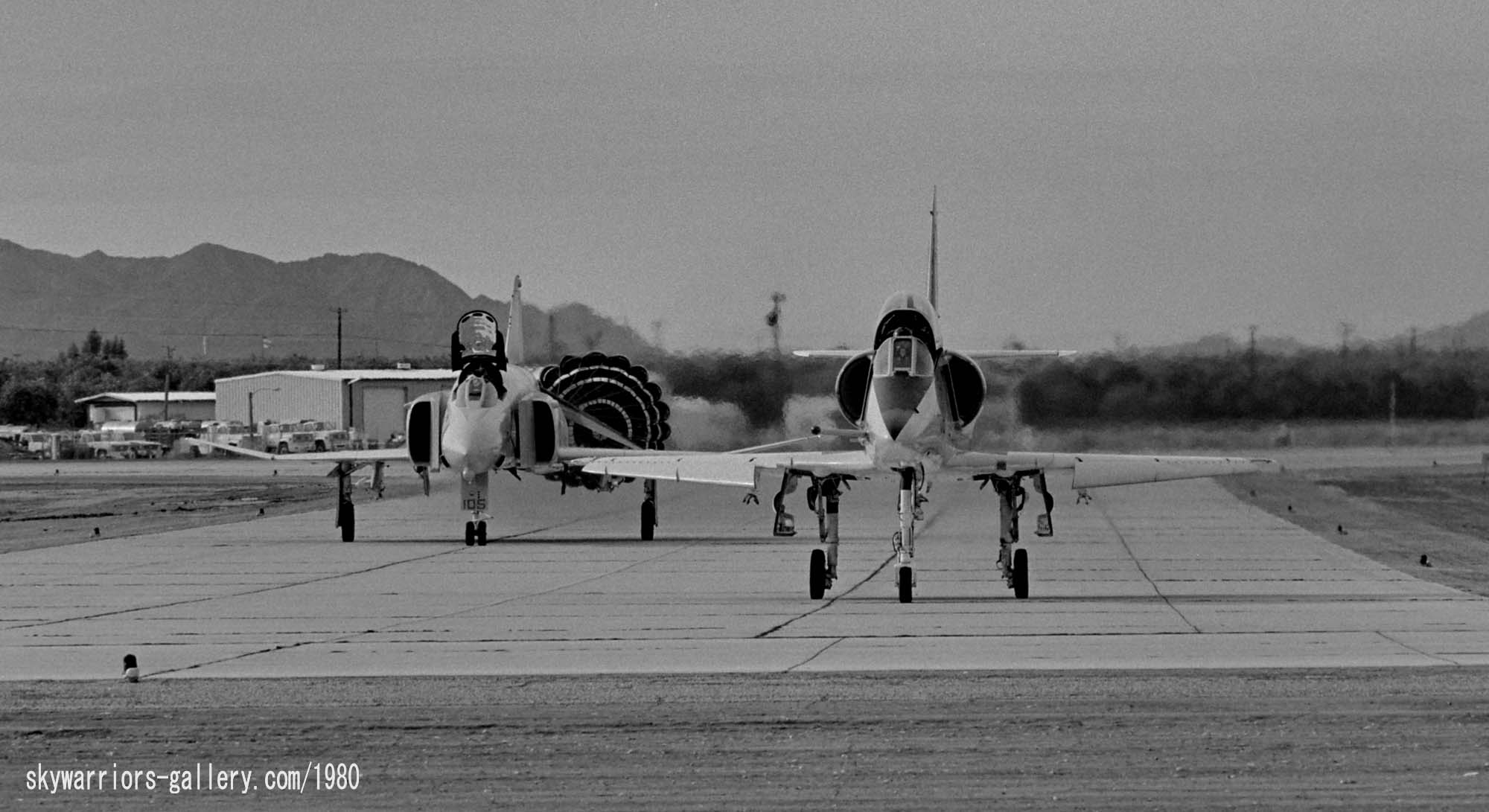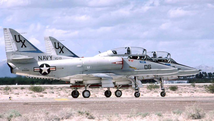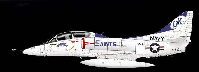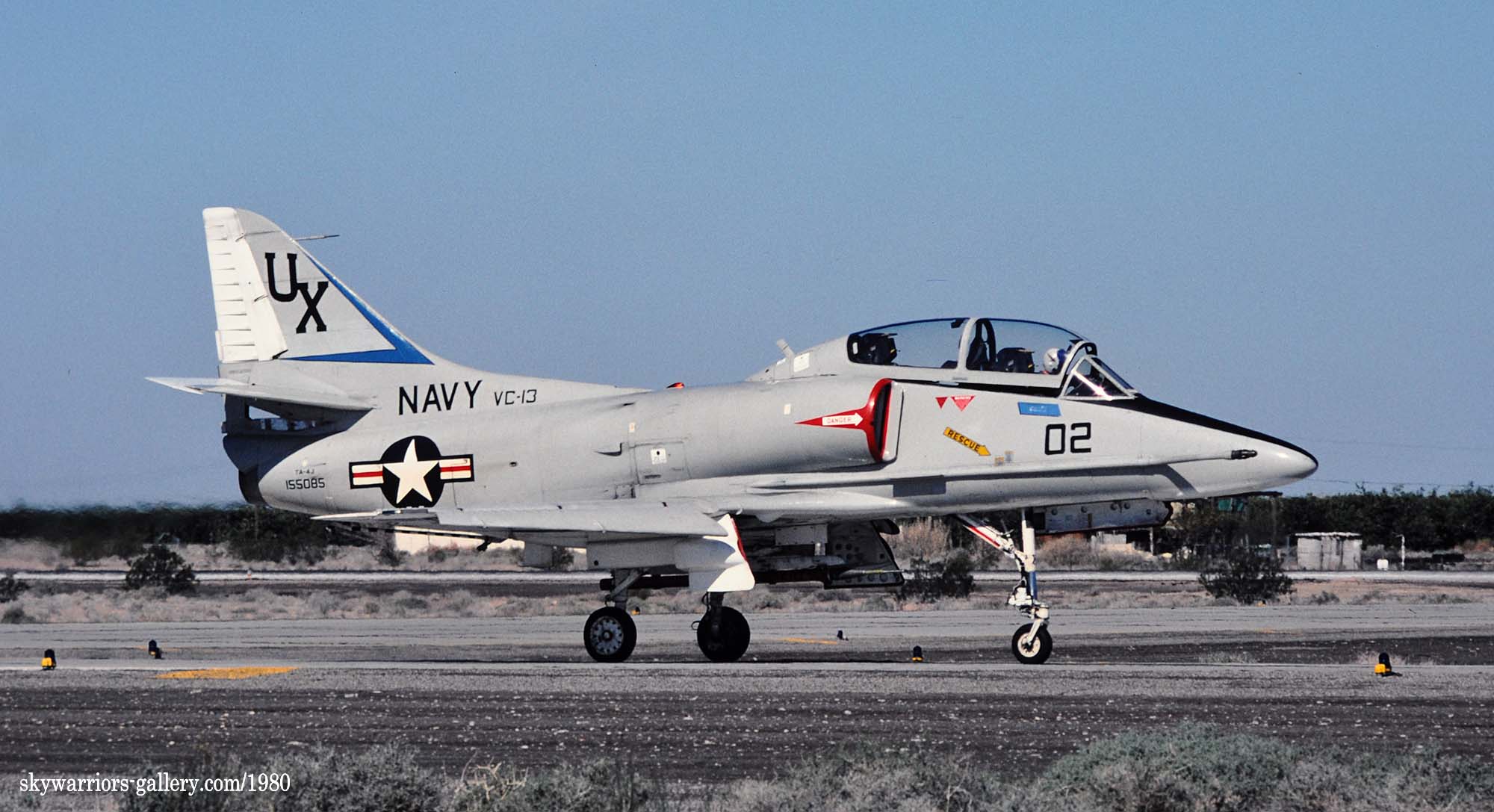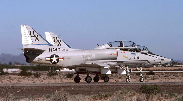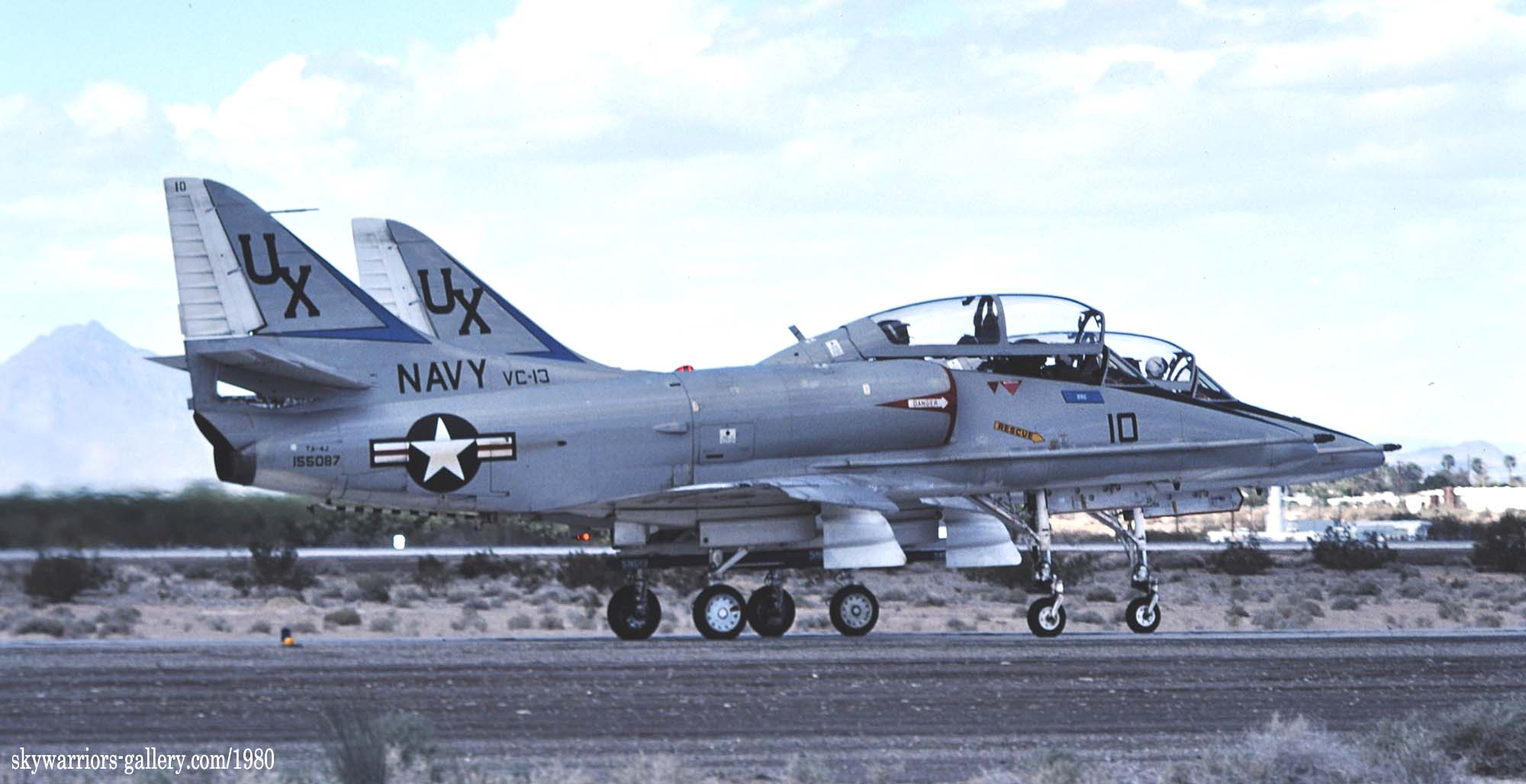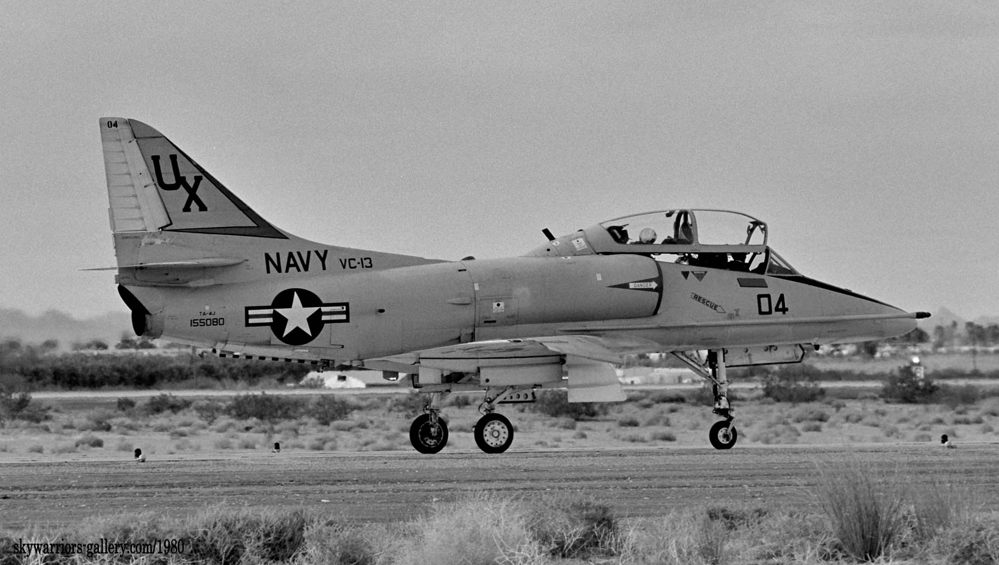 MCAS YUMAをタキシングするVC-13の面々、1976年に受領したTA-4Jは、7年間も使い続けられ A-4Eに交換された。この部隊最初にA-4Lを受け取ってから 最後にA-4Fを手放すまで おおよそ20年間もスカイホークシリーズを使い続けた部隊であった。軽量、単発で小型、(デルタ翼は、外板が薄くても構造上丈夫な為 軽量化には有利 しかも加速がしやすい特性がある)しかも 急降下爆撃から各種任務何でもこなせた”小さな巨人”であったから 艦隊支援など飛行隊の使命にはもってこいであったのだろう。空軍で言えばF-5やT-38に相当する機体である。