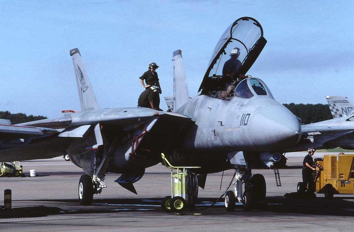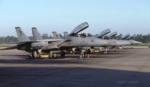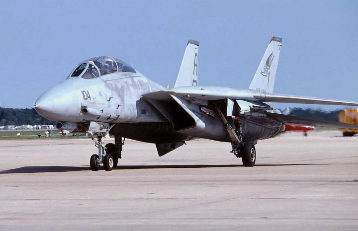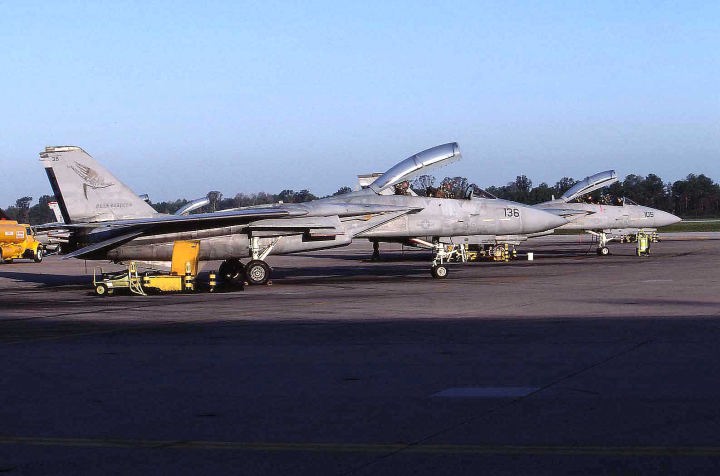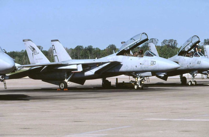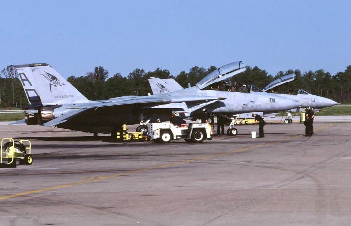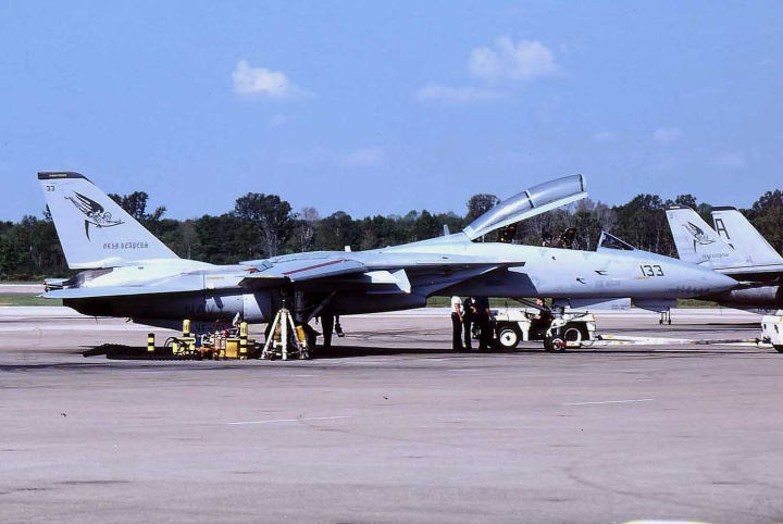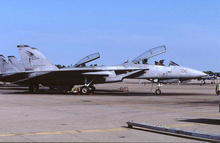 ↑ 1988年にオシアナの公開で展示された司令官指定機トリプルナッツ。部隊を代表する機体として1986年からアメリカ各地の航空祭に展示されていた。以前までVF-84のCAG機として手使われた機体で当時しては新しいA型後期の機体だった。F-14A/Bu.No.162688