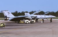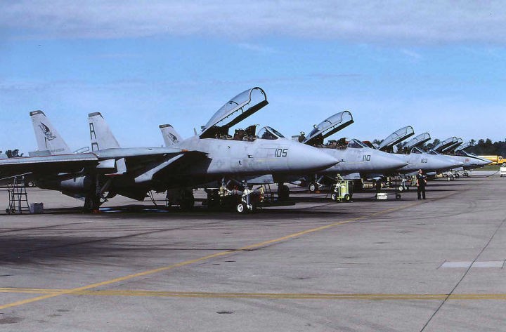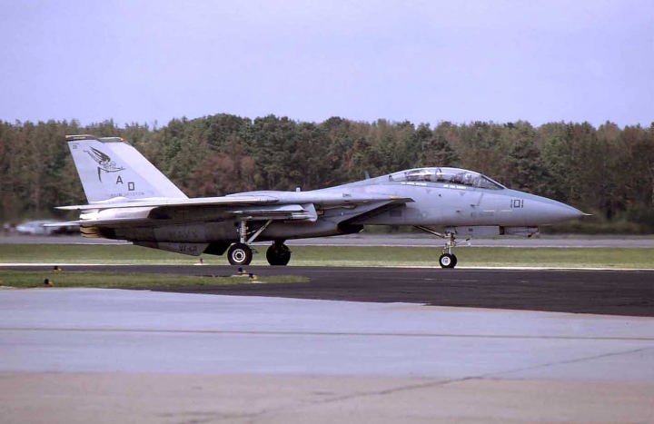 太平洋方面の転換訓練飛行隊VF-124が1994年9月に解散した後、唯一F-14転換訓練の部隊となったVF-101。FA-18E/Fが配備されるまではオシアナ海軍航空基地の”主”でもあり、オシアナOHでは必ず見ることが出来る部隊だった。当時任務の性格上F-14のA.B.D型等全てのタイプを所有しており、Modexも100番代と200番代を持っていた。私の見たVF-101のF-14ではAD-165、AD-261と言う番号があったので相当数のF-14を所有していたはずだ。2000年以降特に 実戦部隊のF-14のリタイアーに伴い保有機数を減らしはじめたが,、2005年に解散するまで海軍唯一のF-14転換訓練部隊として活躍した。