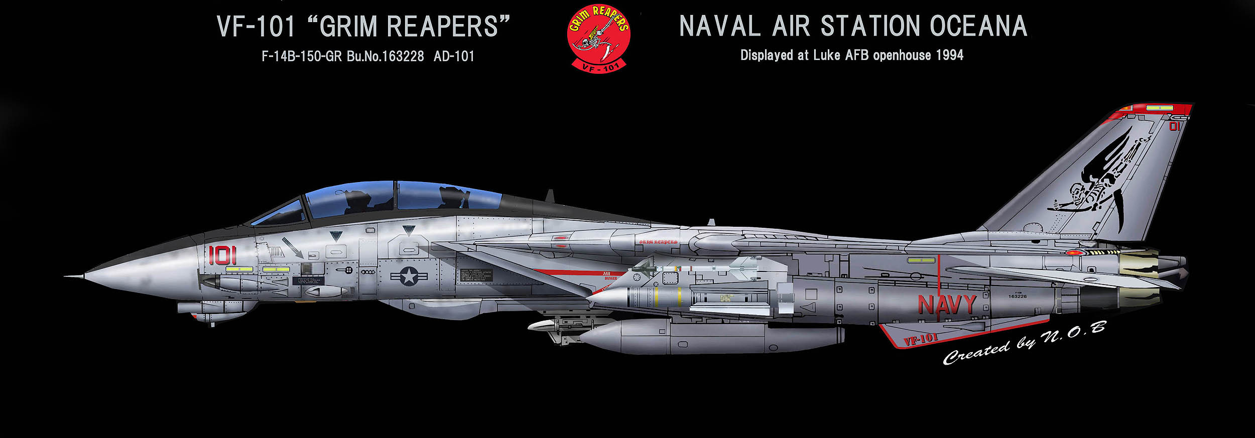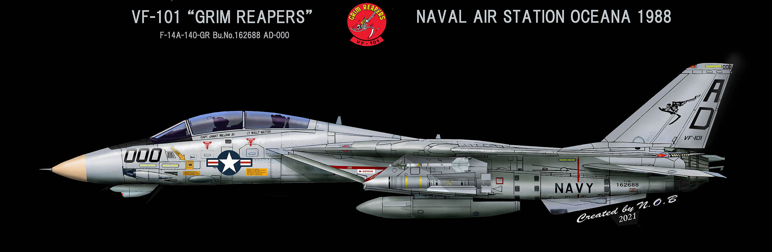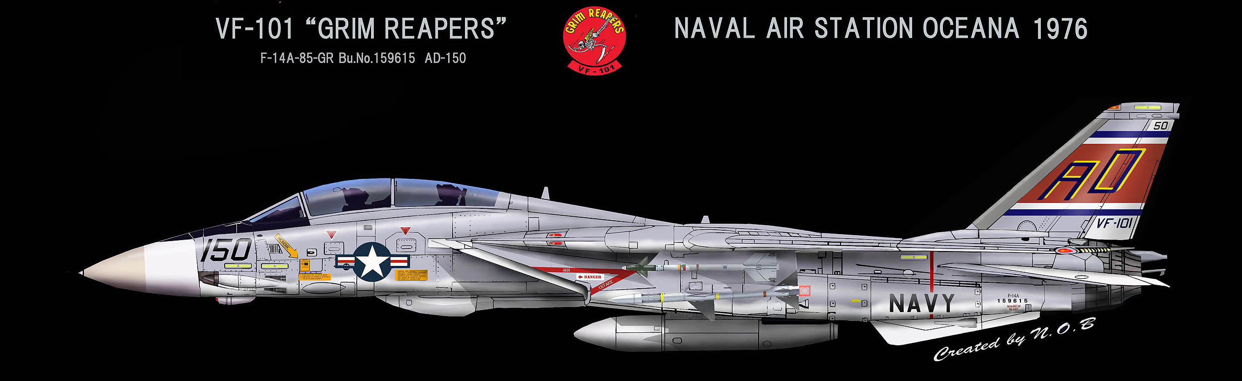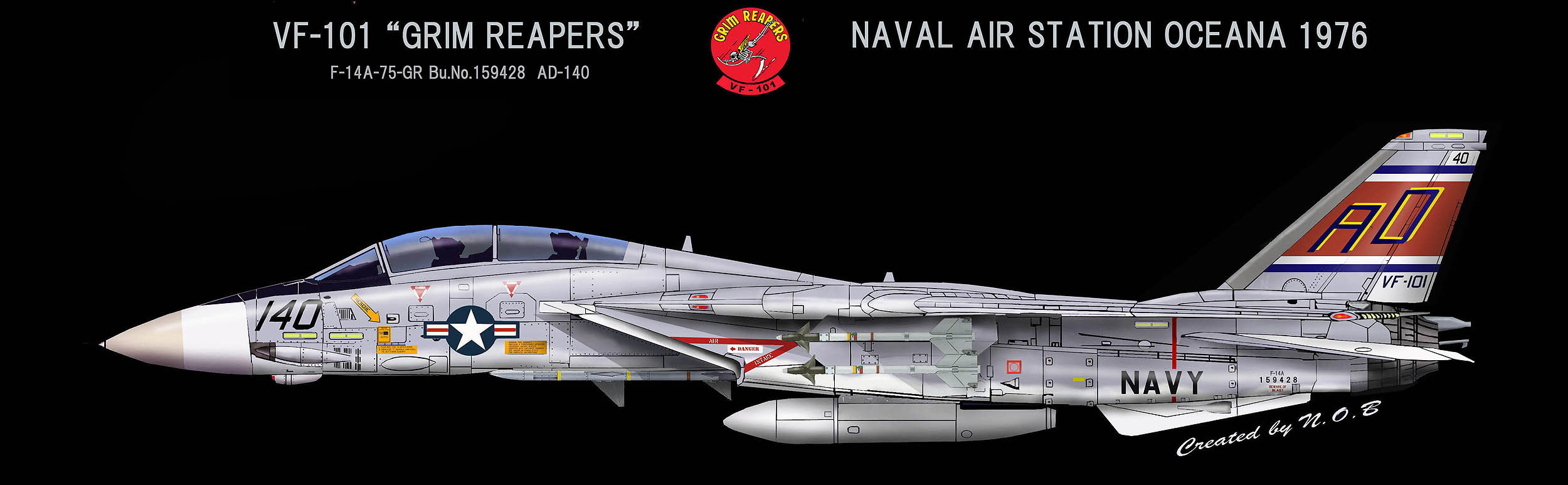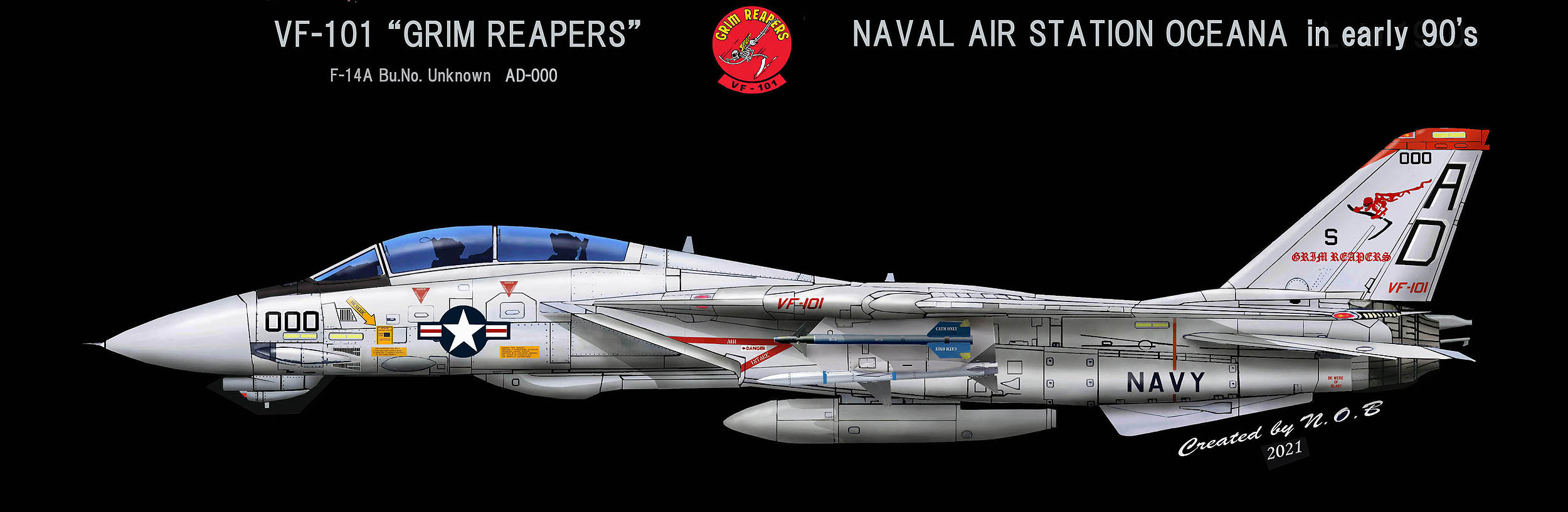 ↑ イラスト制作の参考とした写真の撮影時期が確認できないが、1990年代初めのマーキングと思われる。トリプルナッツ機のマーキングがフルカラーに変わったものがこれで、オールドイングリッシュの赤文字で「GRIM REAPERS」と書かれ尾翼を飾っている。おそらく司令官指定機と言うことで死神を赤く描いた機体であり、主翼前縁のエッジにVF-101の文字も入っていた。Bu.No.不明
