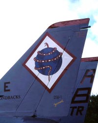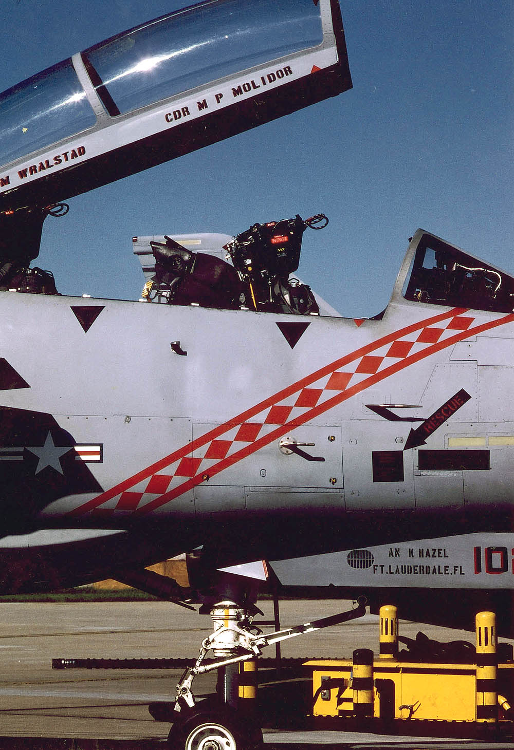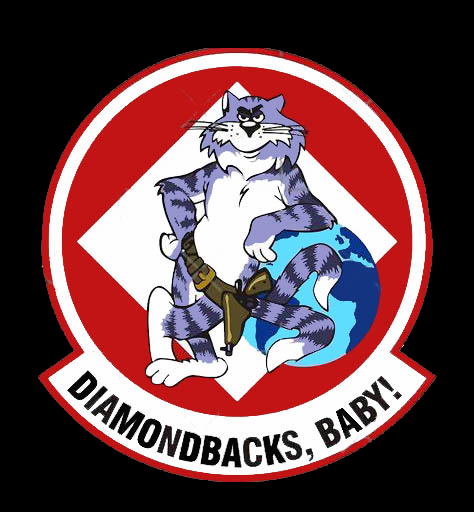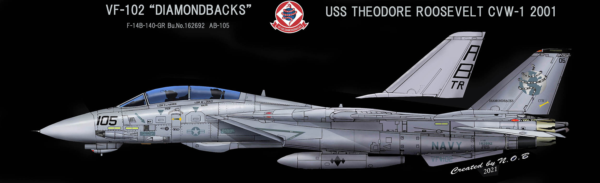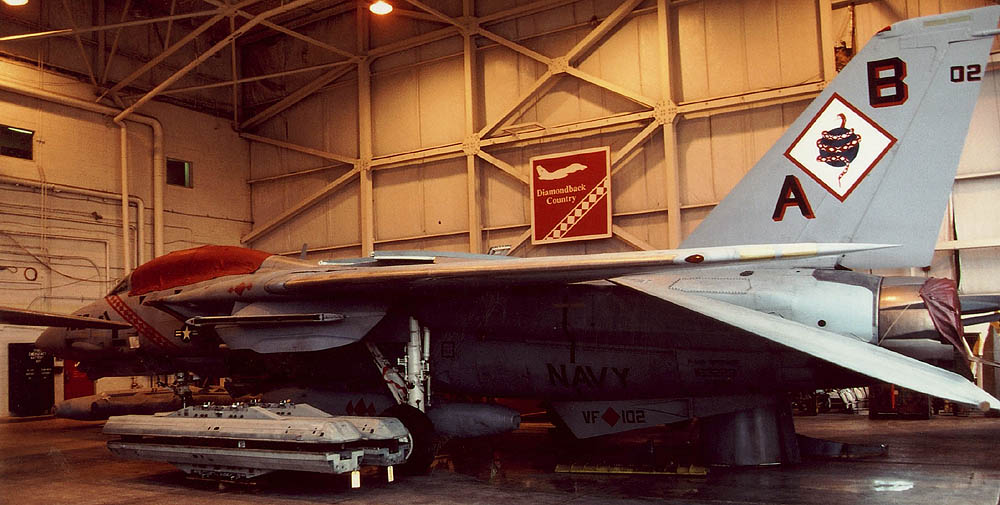 ↑ VF-102のF-14として最後を迎える数年前、ショーバード用として歴代最も派手なマーキングが2002年に施された。インシグニアは、フルカラーのままダイヤ自体を尾翼全体に納まるよう配置され、テールレタ「AB」は、尾翼内側に書かれるようになっている。ABのレター下に書かれた「TR」は、当時 CVW-1を搭載していた空母トルーマンを指すものだと思われる。