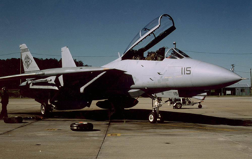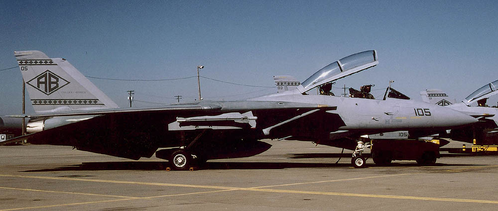 ↑ 上のショーバードとは対照的に、部隊所属機の標準塗装はロービジ規定に忠実な地味なものであった。このイラストのAB-105はF-14B/Bu.No..162692のもので2001年10月頃の塗装例である。機首のコックピット下にレーザー誘導爆弾のシルエットと「Operation Enduring Freedom」の文字が入っており、2001年9月に起こった同時多発テロに対するアフガニスタンへの報復攻撃参加を示している。