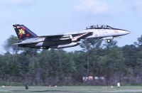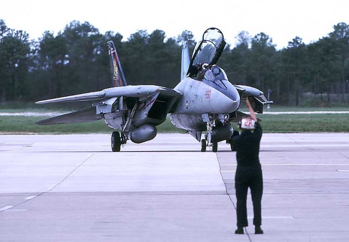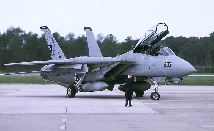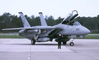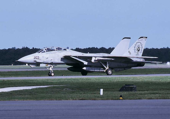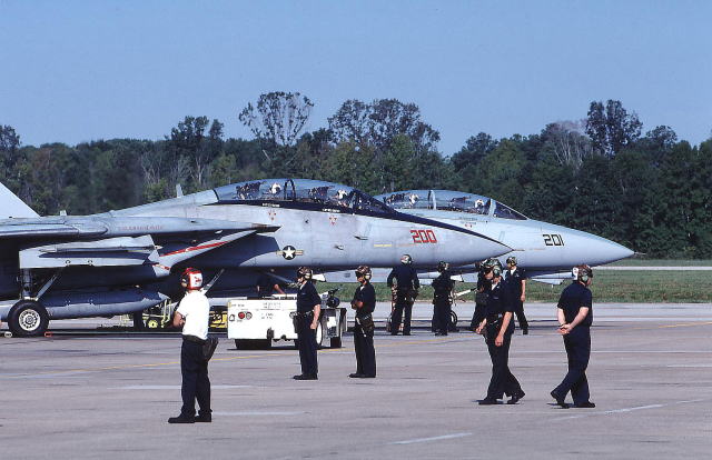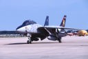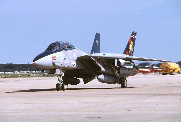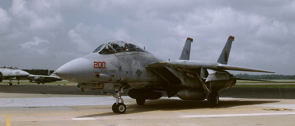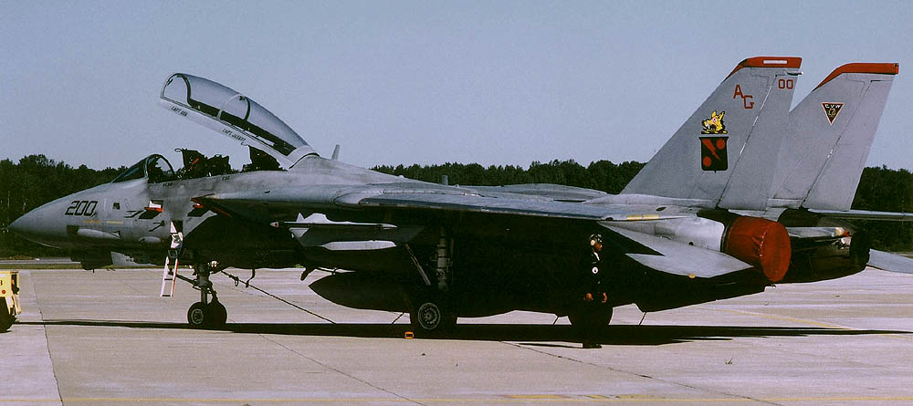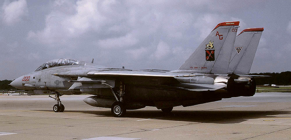 1998年のオシアナにおいて、ギャラリーの前をタキシーしていくVF-11のF-14A ”AG-200”。この後”AG-204"続いたが、何とフィルム切れで撮れなかった。尾翼には、USSジョン・C・ステニスの艦名、それに尾翼内側にはCVW-7のインシグニア