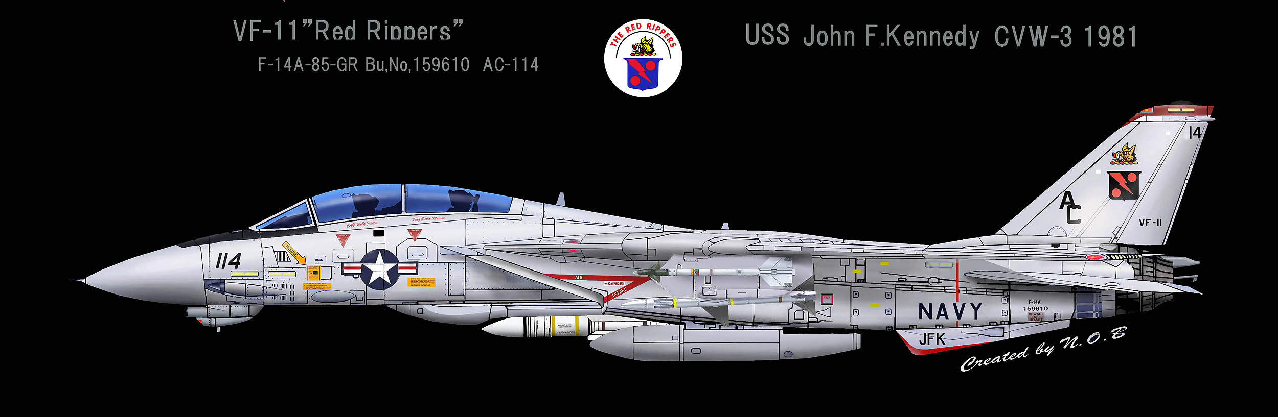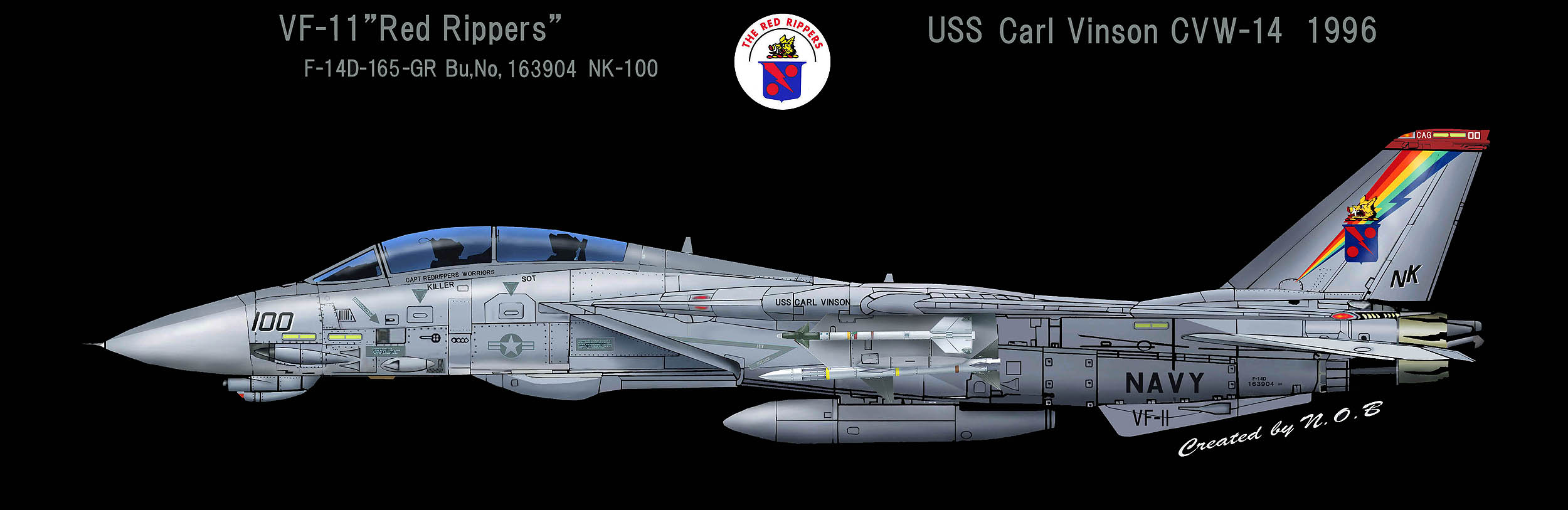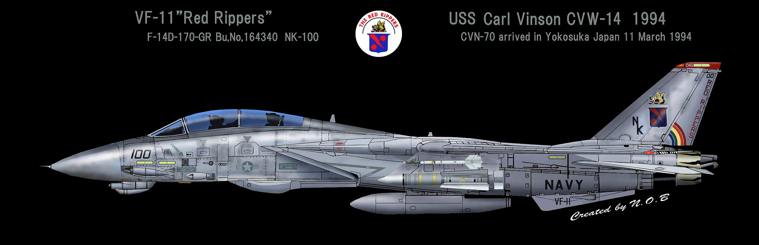 VF-11は、F-14トムキャットの飛行隊の中で、A型B型D型の3種類をすべて使った飛行隊だった。1980年に最初のA型を受領し、1992年にD型に更新、その後 1996年にF-14B型を受領してバージョンダウンしている。空母フォレスタルが引退するまで、VF-11はUSSフォレスタルかUSSジョンFケネディに載って航海することが多かった。1994年と1996年にカールビンソンのCVW-14に搭載され太平洋方面に進出、横須賀にも寄港しているので、報道関係には94年3月11日公開された。下図は、CVW-14所属時の1994年と1996年のCCAGマーキングを再現してみた。