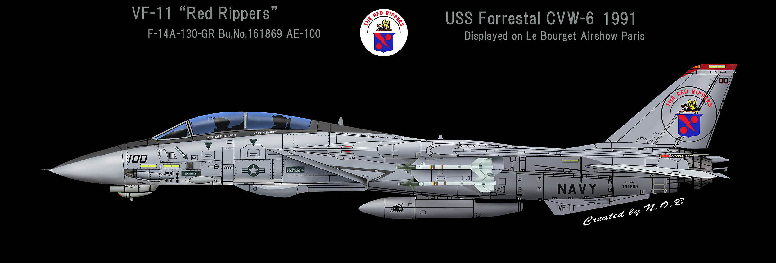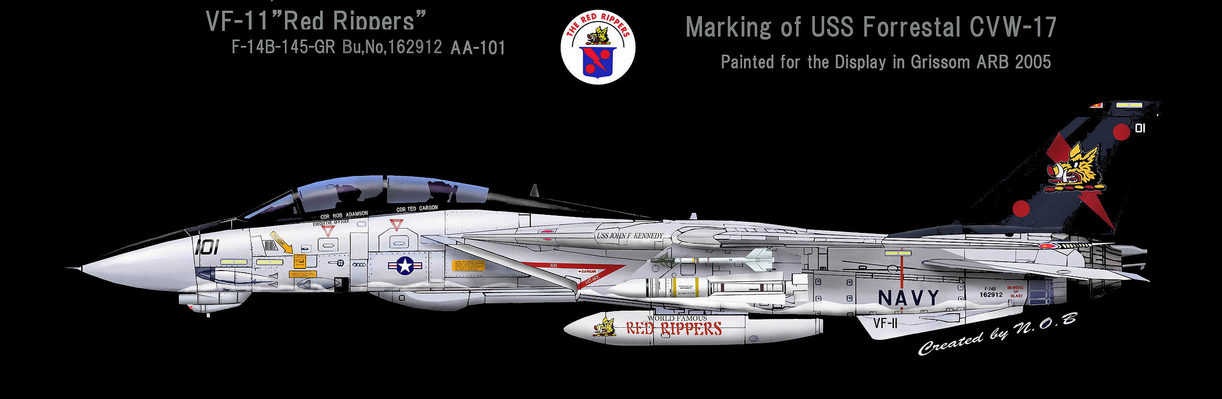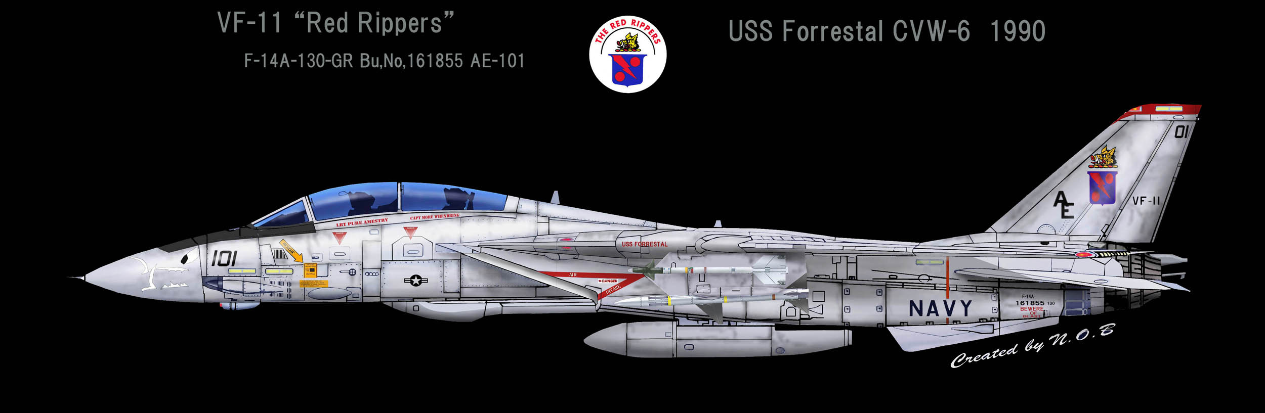 VF-11は、F-14トムキャットの飛行隊の中で、A型B型D型の3種類をすべて使った飛行隊だった。1980年に最初のA型を受領し、1992年にD型に更新、その後 1996年にF-14B型を受領してバージョンダウンしている。空母フォレスタルが引退するまで、VF-11はUSSフォレスタルかUSSジョンFケネディに載って航海することが多かった。1994年と1996年にカールビンソンのCVW-14に搭載され太平洋方面に進出、横須賀にも寄港しているので、報道関係には94年3月11日公開された。下図は、CVW-14所属時の1994年と1996年のCCAGマーキングを再現してみた。