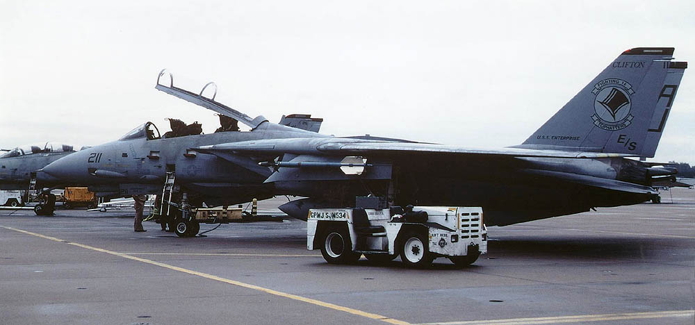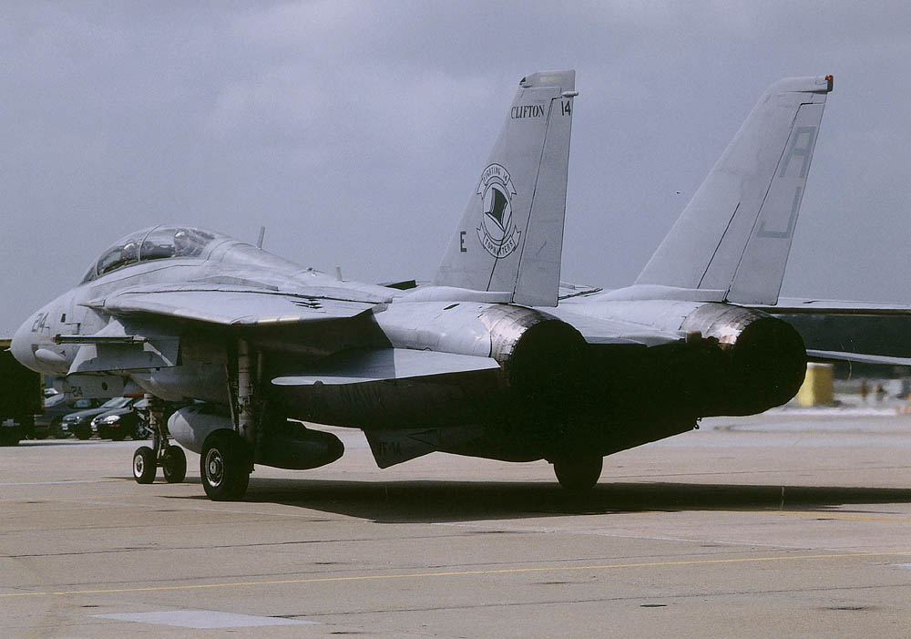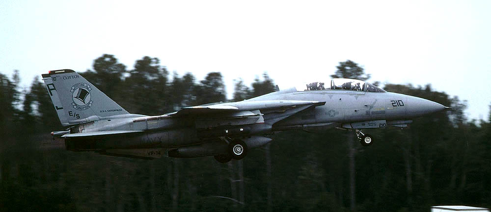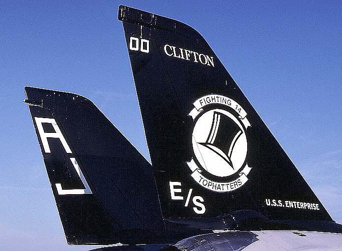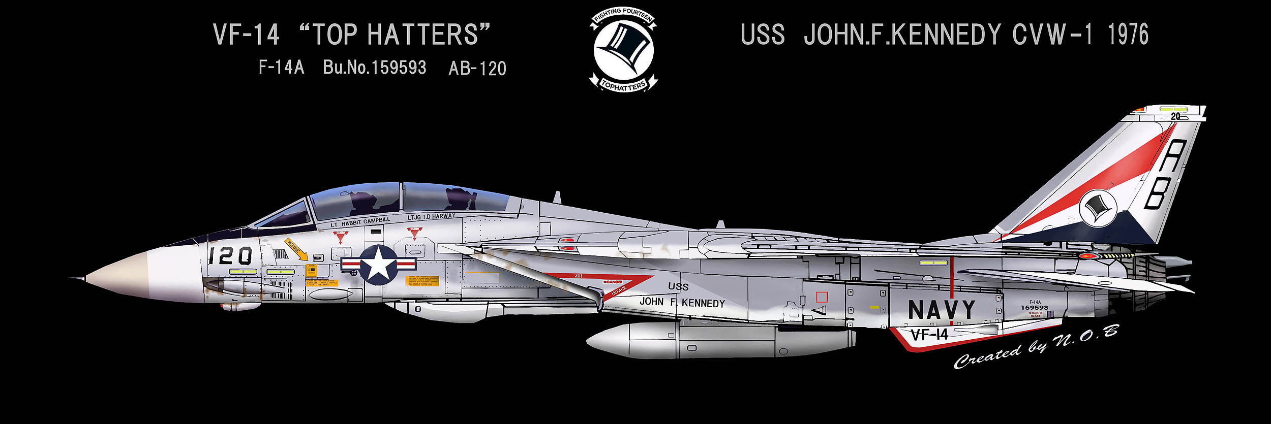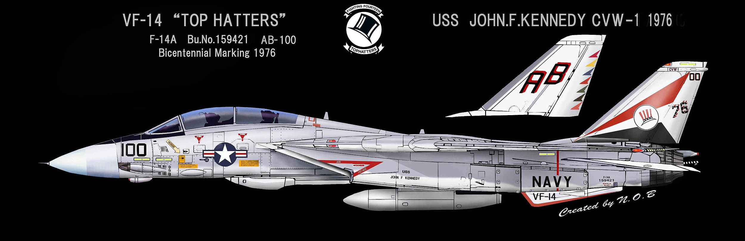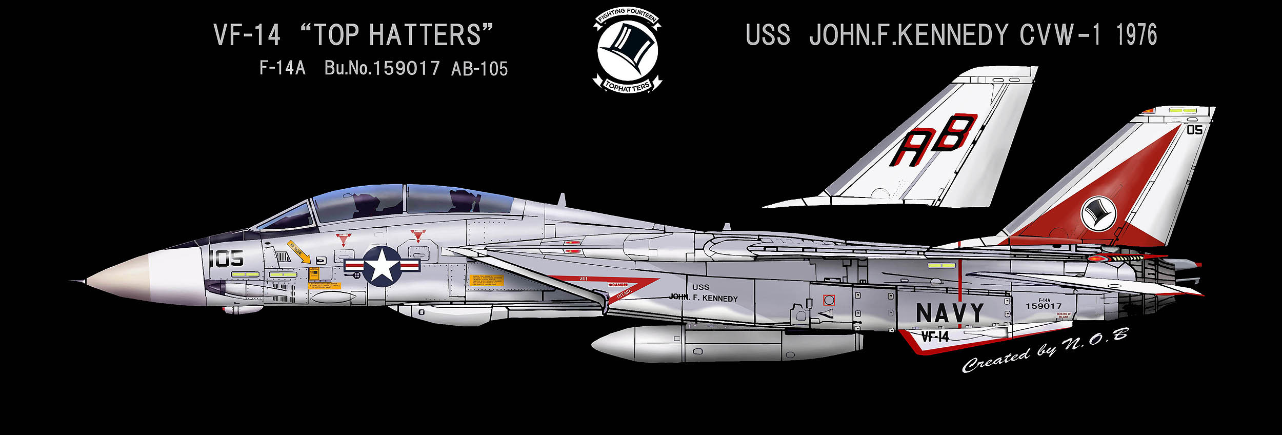 F-14Aへの転換は大西洋方面で最初の実戦VFで、1974年である。東海岸の部隊である為、太平洋方面に出てくる機会はなく 航空雑誌でしかお目にかかれない飛行隊だった。私が米海軍機写真に興味を持ち出した後は、まず海軍航空隊の部隊編成を一生懸命頭に入れ、テールレターでどの部隊かある程度分かるようになった。VF-14はVF-32と長らくコンビを組んでCVW-1”AB”のレターをつけている印象が強く、当時搭載されていた空母はジョン・F・ケネディーだったと言うことは今でも記憶している。最近は守備範囲も広くなり、海軍部隊の改編のスピードにも頭が対応できず、どのVFがどのCVWに所属し、どの空母に乗っている等さっぱり判らなくなっている。私が最初に彼らを見たのは1998年のオシアナOHであり、その時彼らのテールレターは”AJ”で 空母ジョン・F・ケネディーだったが、2000年に再び彼らに出会ったときは、同じ”AJ"をつけてはいたものの空母はエンタープライズに変わっていた。