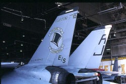 アメリカ海軍の航空隊としては最も古い歴史をもつ飛行隊で、F-14に機種転換したのは1974年である。以来大西洋方面に展開したままでF-14飛行隊としては日本に飛来したことはなかったが、部隊がFA-18に更新され始めた2001年の12月に余剰になった機体が、VF-154の機体交換の為厚木に飛来し、マニアを沸かせた。F-14AのままB/D型には更新されず、2001年末に新しいF-18E/Fに機種交換され、太平洋方面に移動した。F-14Aを使用した初期の頃の塗装は、白地に赤のシェブロンとシルクハツトを描いた極めて派手なマーキングであったが、ロービジ化以降は小さなシルクハツトのみ尾翼に書かれることが多く、味気ない印象が強い。F-18Eに転換される前は、下の写真のように部隊インジクニアそのものを尾翼に入れ、なかなかセンスの良いデザインでロービジながら私が大変好きなマーキングであった。1999年に部隊創設80周年のスペシャル塗装でF-14受領時を再現したが、残念ながら私は撮影するチャンスに恵まれなかった。