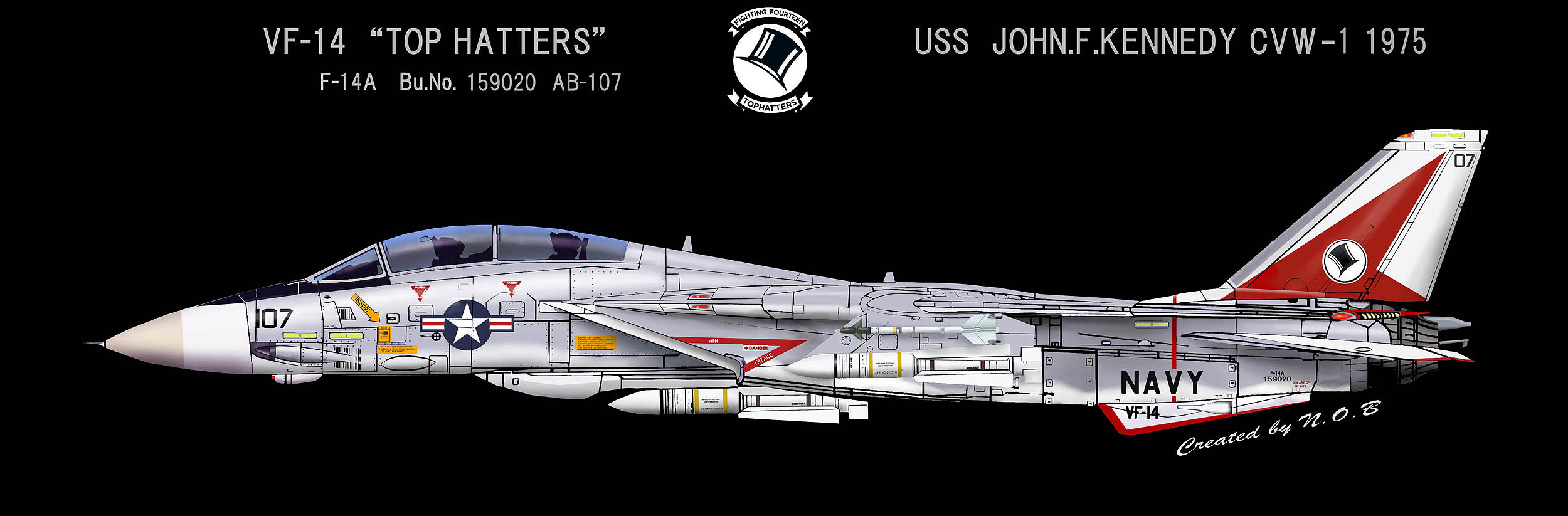 ↑ 1974年それまで使っていたF-4BファントムからF-14Aを受領し、 NASオシアナに配備された頃のVF-14のマーキングで 真っ白尾翼に真っ赤なシェブロンとシルクハットと言う何とも派手なマキングで登場、エプロンでは一際目立つ存在だったはずだ。