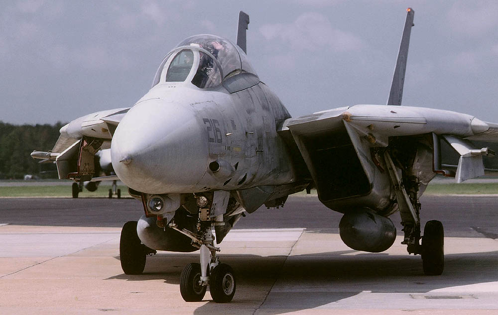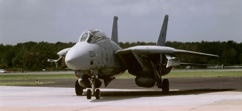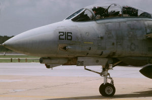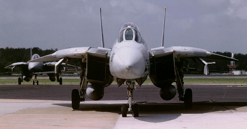 F-14A ”AJ-216”は、カメラの直前を左手に折れてタキシングしていく この角度であるとマーキングは見えにくいが 機首の光学センサー類ははっきり見えている。トムキャットの特徴の一つでもある機首レドーム下のテレビカメラセット(AN/AXX-1)、F-5E/Fクラスの小型戦闘機でも18Km先から探知できる機能を持つ。1998年オシアナにて