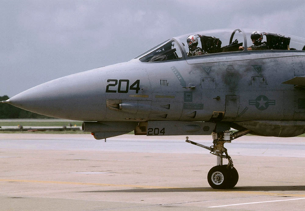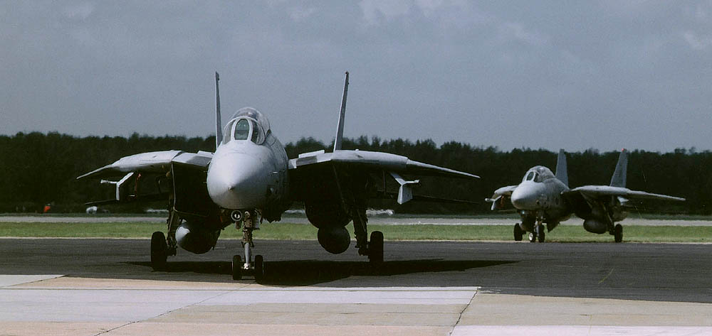 フォーメーションフライトを終え、観客の前をタキシングするVF-14のF-14A ”AJ-216”。後方の列線はカナダのスノーバーズである。Oct./1998