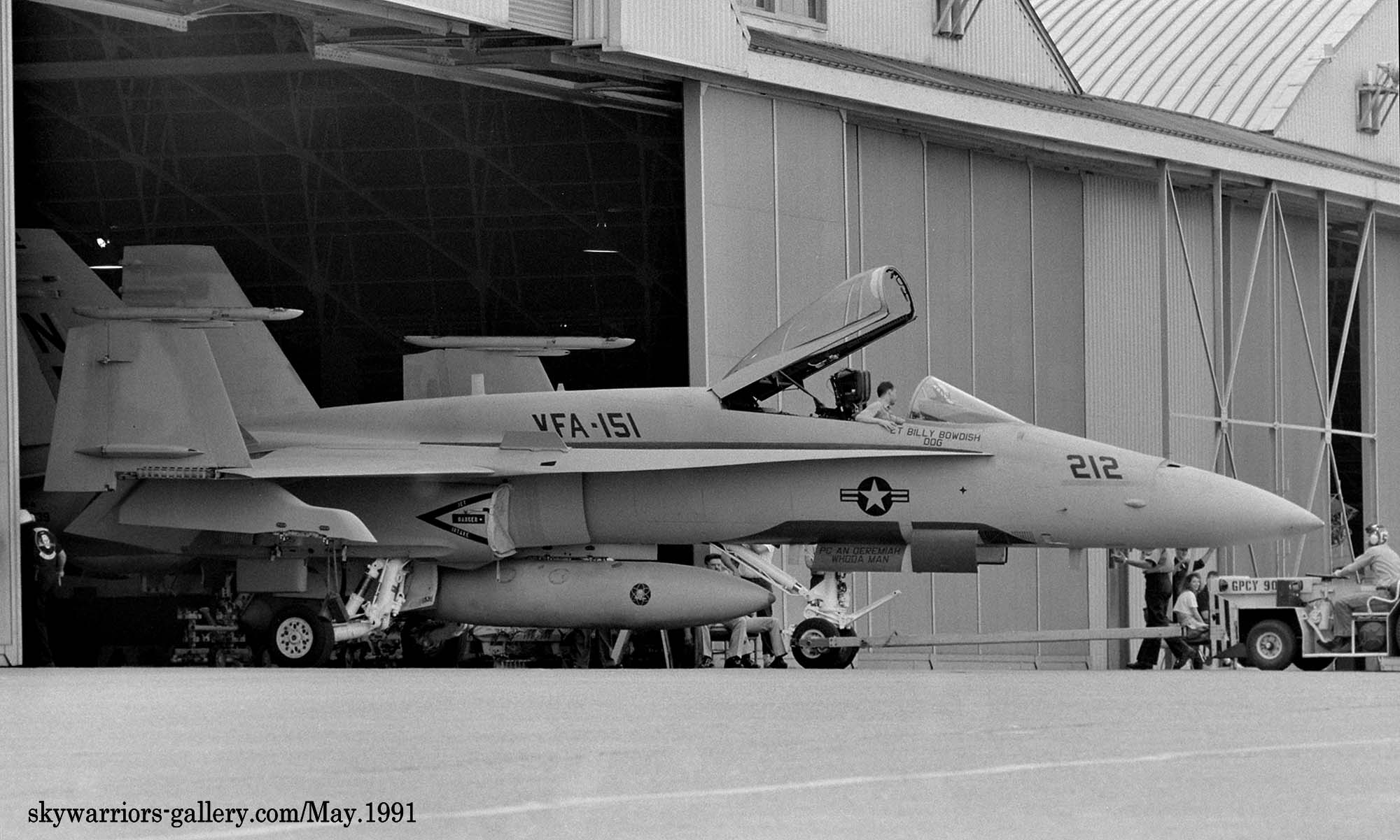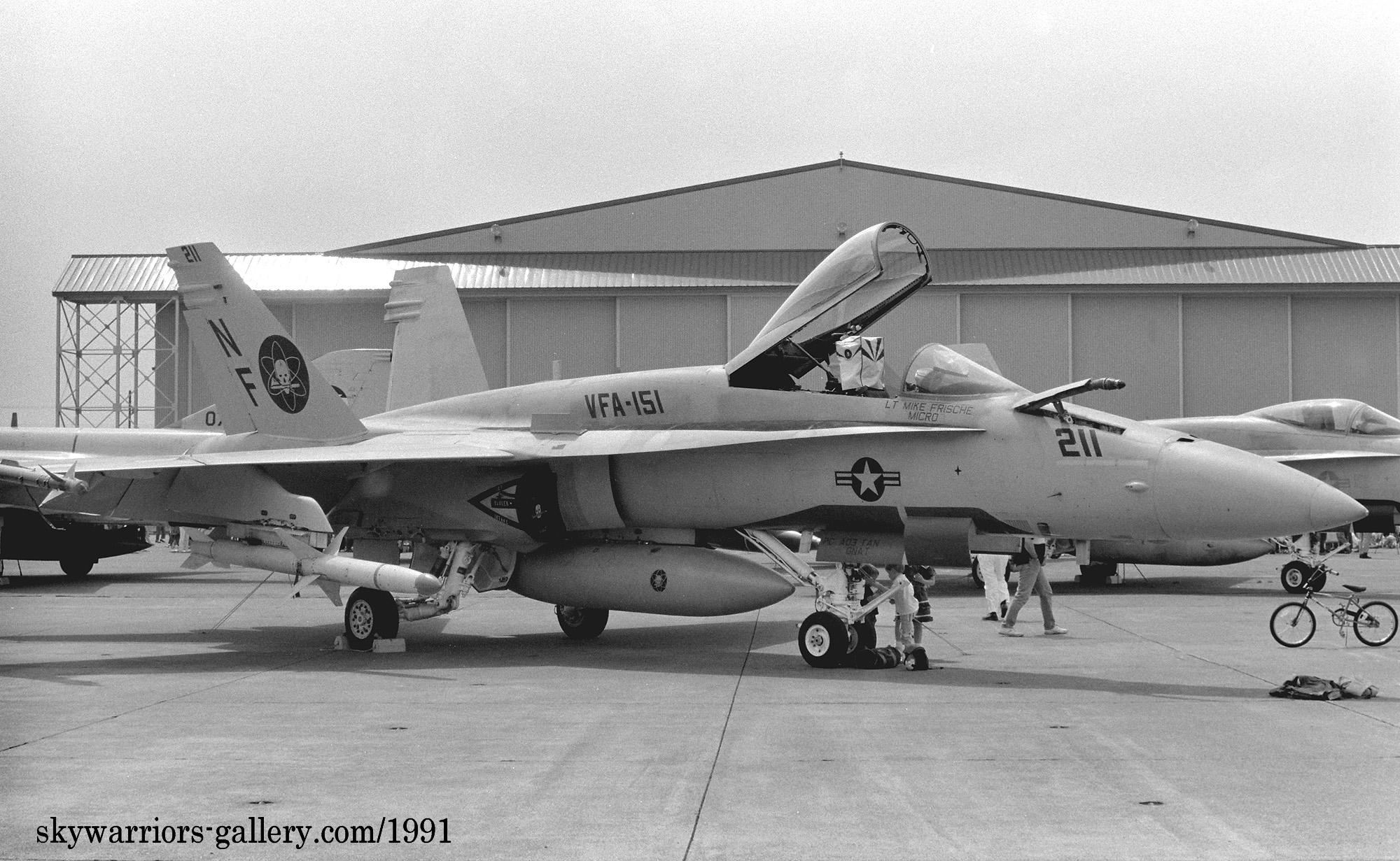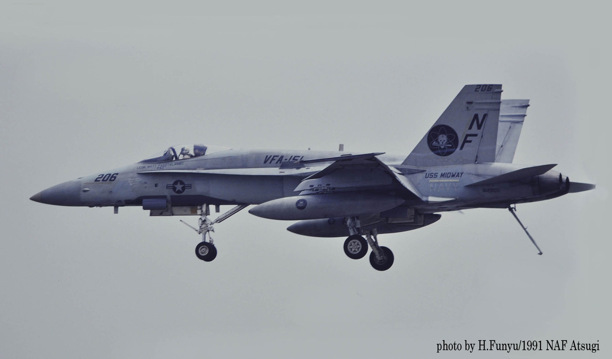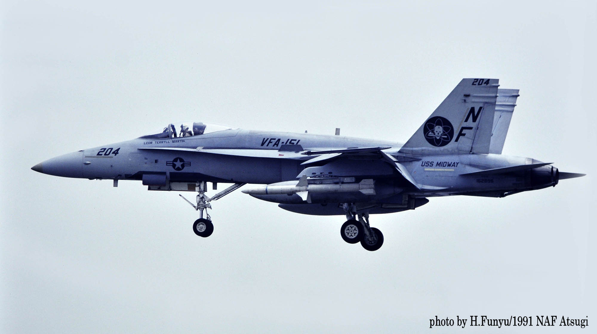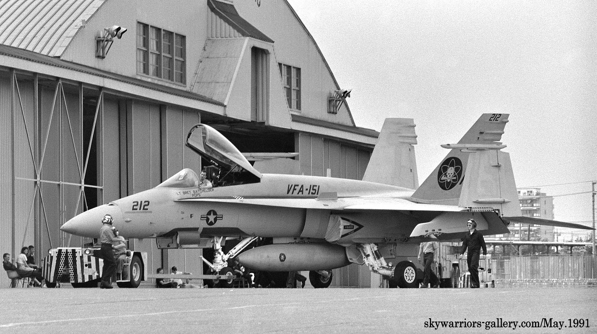 ↑ フニュ君が厚木基地で撮影した母艦インディペンデント入港時にフライインするVFA-151のFA-18A各機。ラックには母艦から持ち帰った兵装などが付いている。