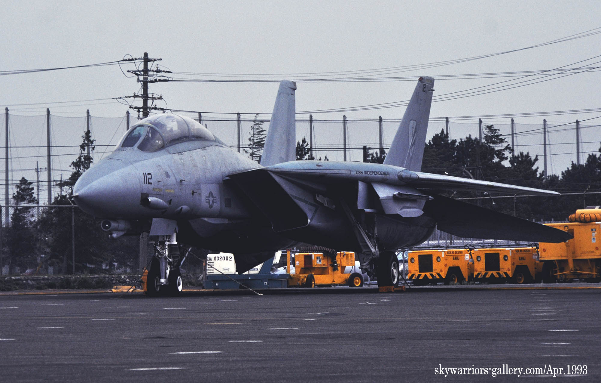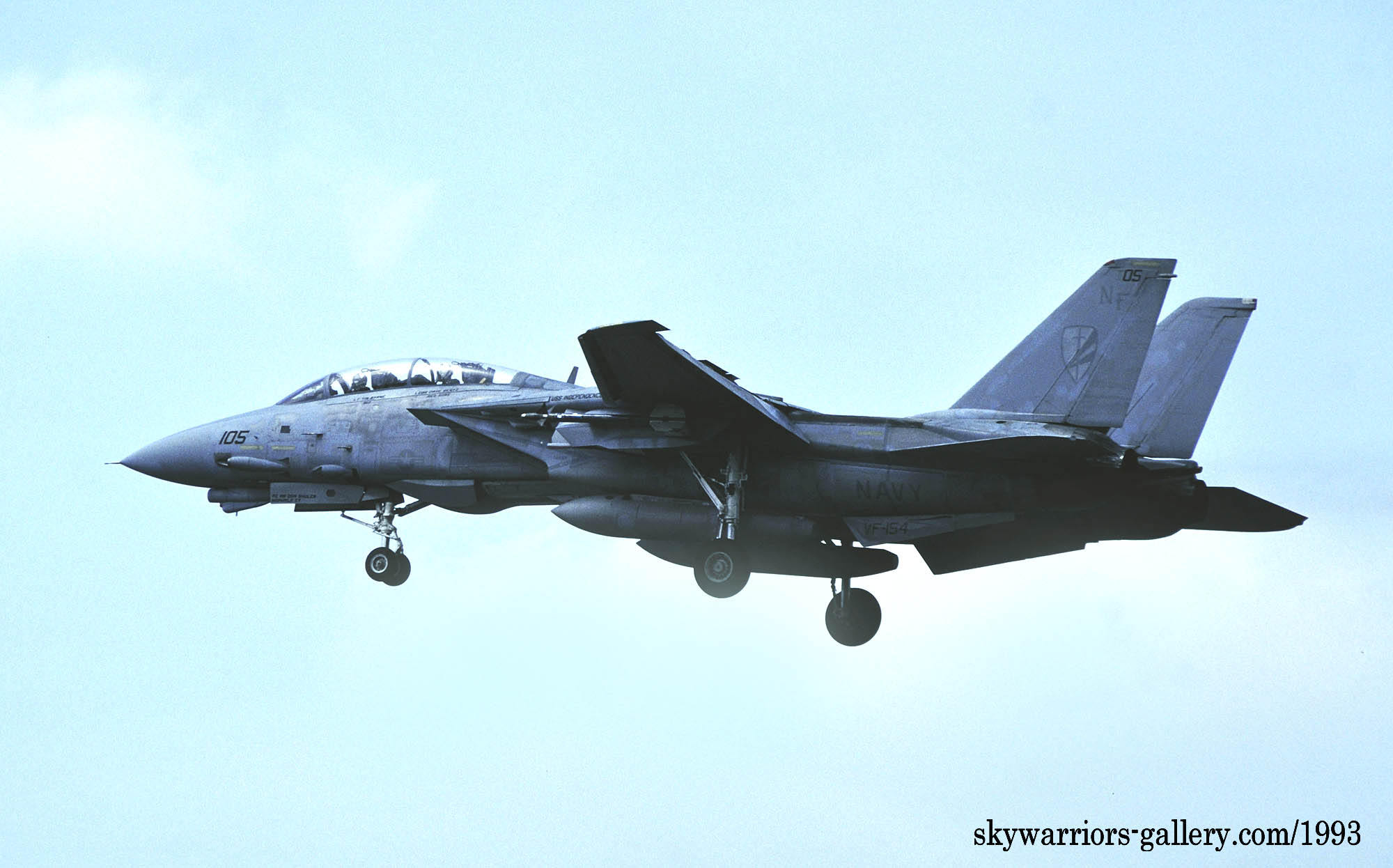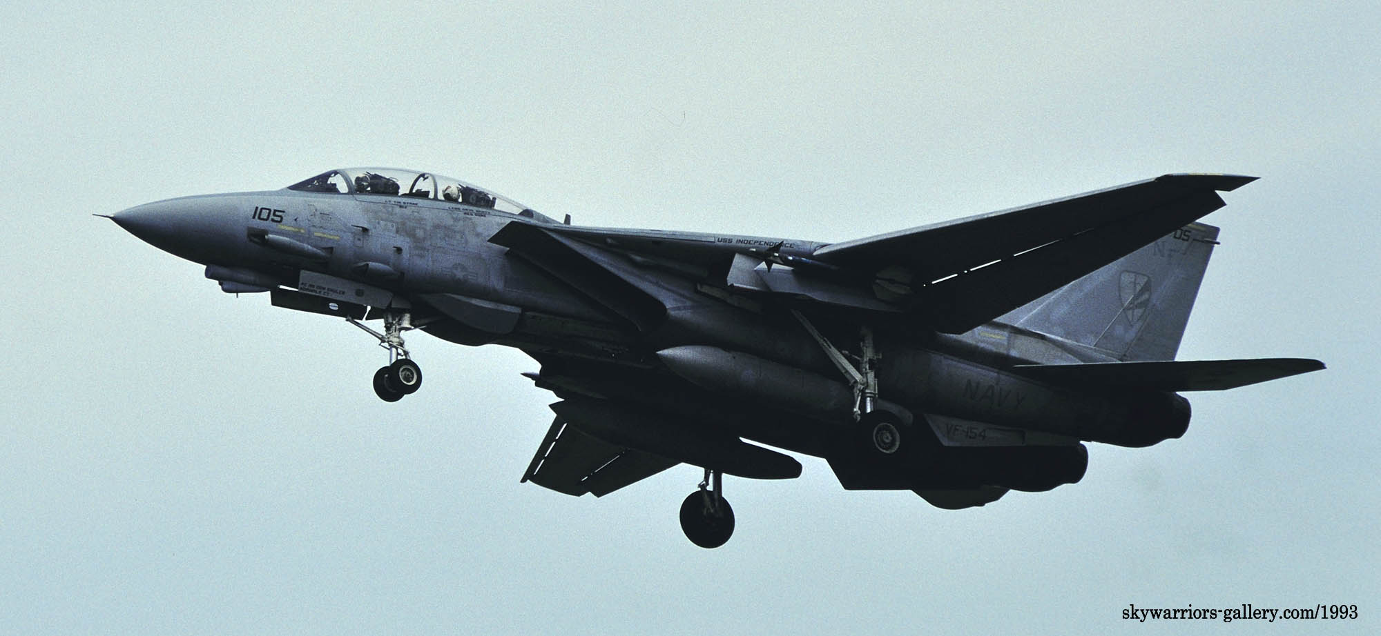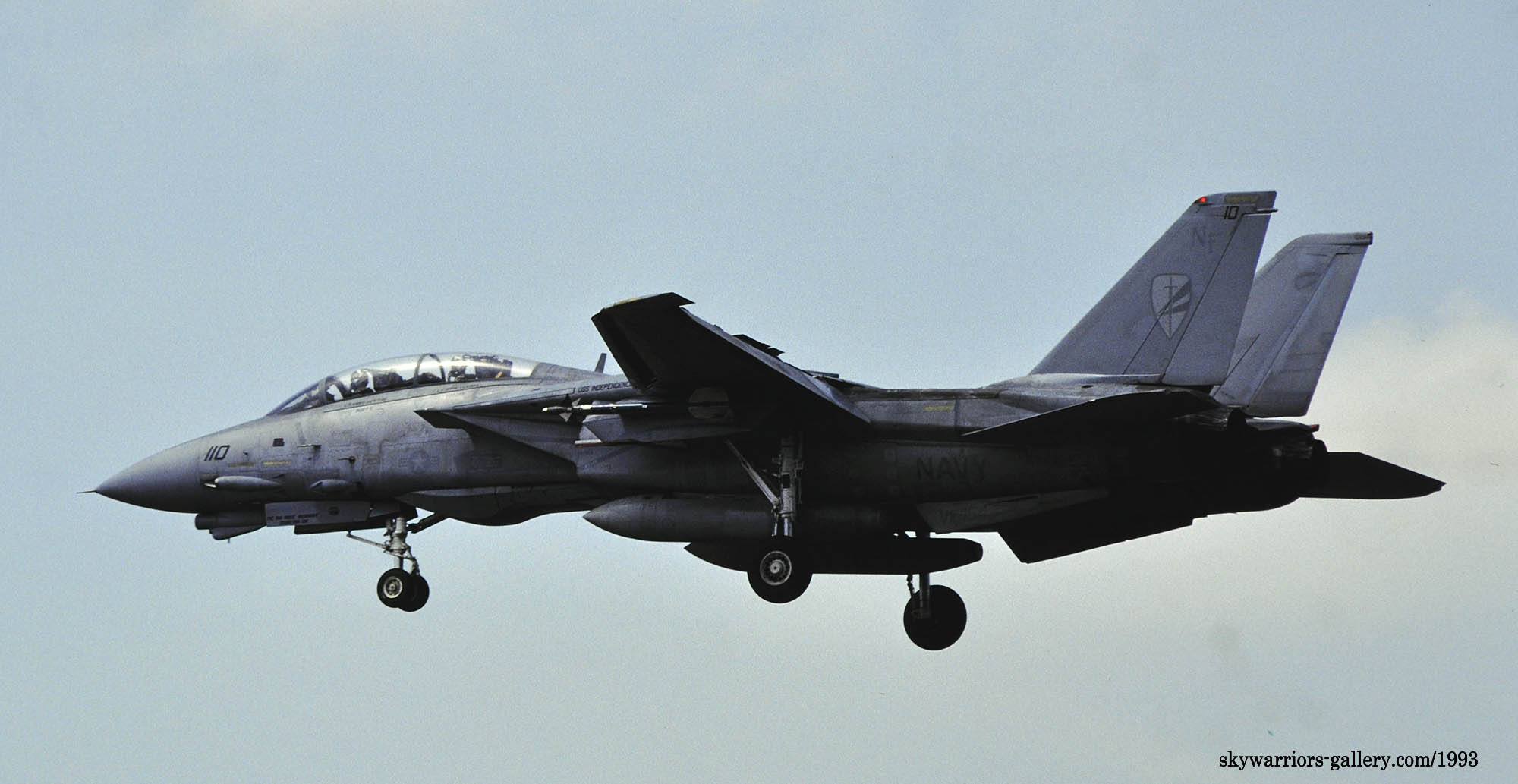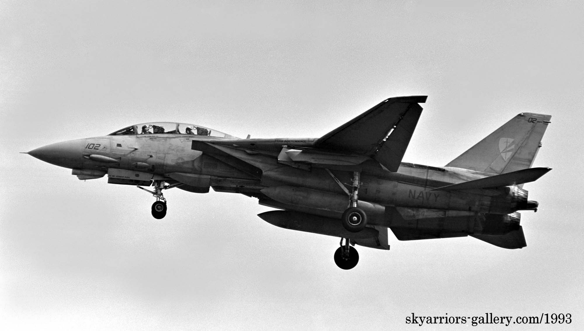 ↑ 厚木基地でローカルフライト訓練するVF-154のF-14A/NF-102。1993年がこの地味な尾翼のマーキングの見納めとなった。