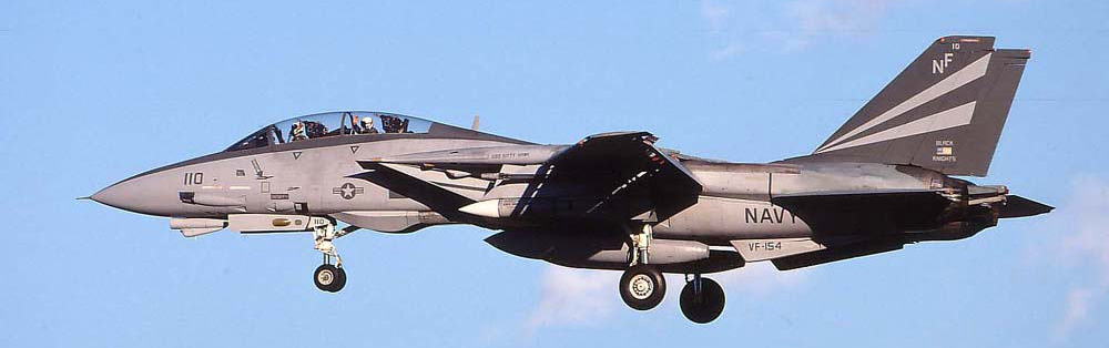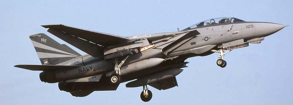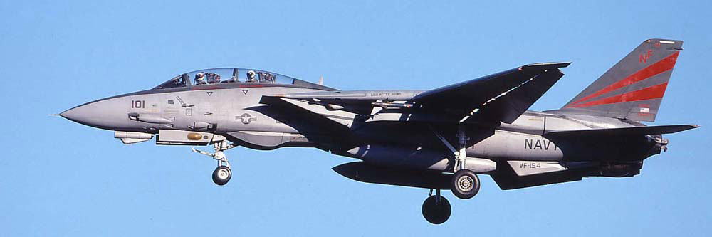 ↑ 左翼にフェニックスミサイルのイナート弾をぶら下げて厚木で訓練中のNF-110。このマーキングは2001年11月頃から見かけられ 2002年にはほぼ全機に施された。1996年に対地攻撃用の改装が行われている為 純粋な邀撃戦闘機ではなく すでに戦闘攻撃機としての役割が大きいトムキャットであった。