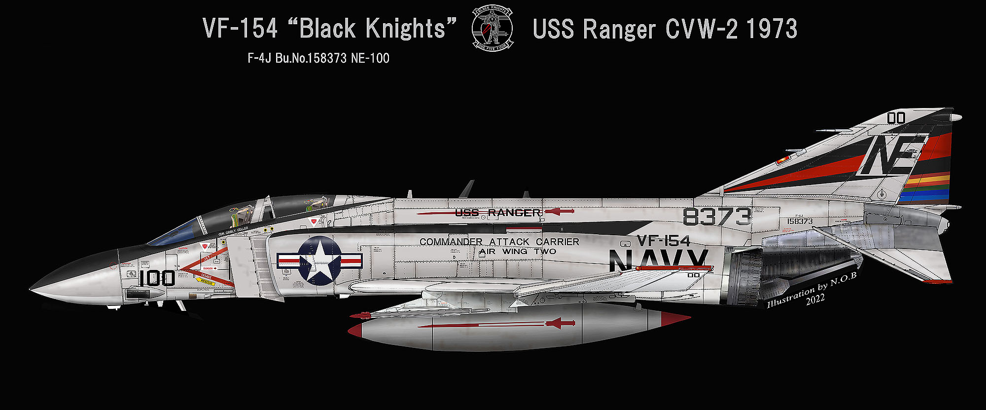 ↑ 1973年時のVF-154 F-4J(Bu.No.158373) CAG塗装機で 尾翼のラダーがCVW-2の所属部隊カラーで塗り分けられ 胴体と増装タンクに同じサイズの剣が書かれた有名なマーキングであった。剣の意味は、平和と正義の敵を打ち負かす事が込められている。