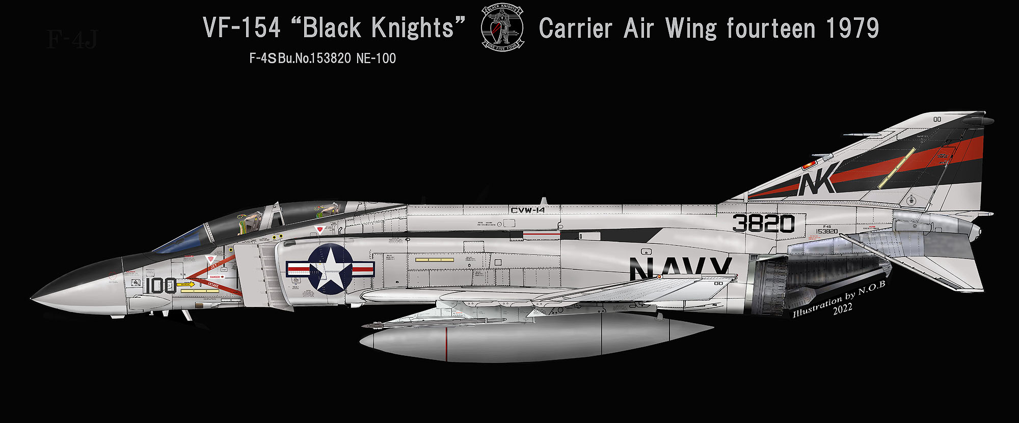 ↑ VF-154は、1979年にF-4の海軍最新型S型を受領して 機体をCVW-14のマーキングにしたが、1981年から載ることになったUSSコーラルシーが運用上S型が使えなかった為 再びN型に交換された。そのため S型を使用したのはわずか1年少々である。イラストはその時の物を再現してみた。主翼前縁に戦闘フラップが増設されたS型後期(F-4S Bu.No.153820)。