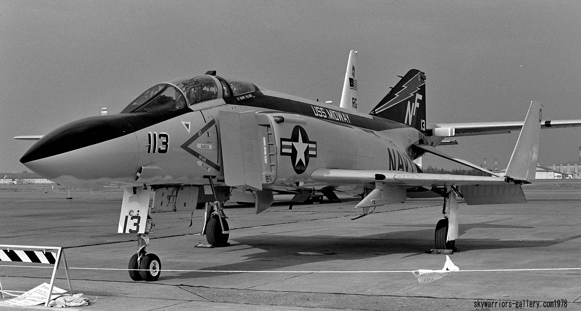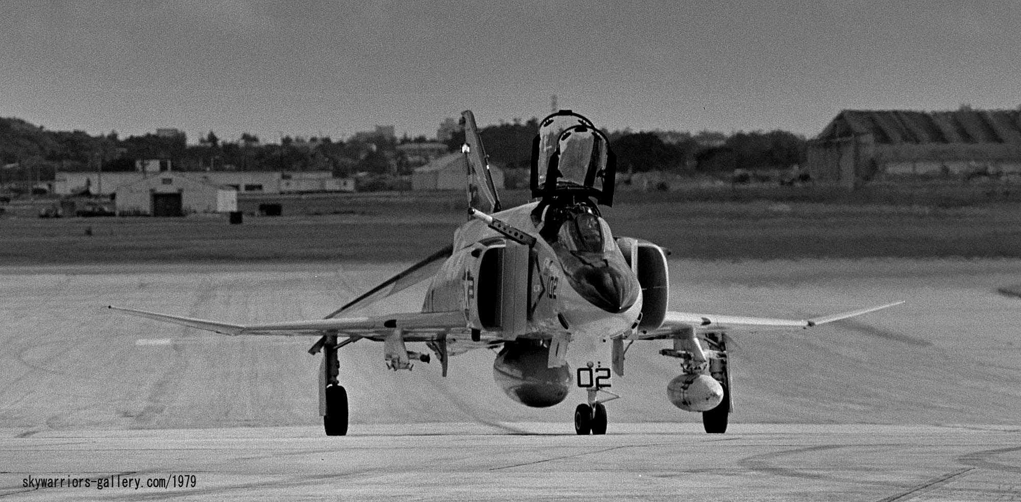 ↑ 厚木基地のR/W19で離陸の為滑走路へ向かうVF-161/NF-100。J型に交換された後の100番は、特にCAG機としての特別なマーキングも施されず、NF-200番機とのマーキングの格差は大きくなり注目を受ける事もなかった。