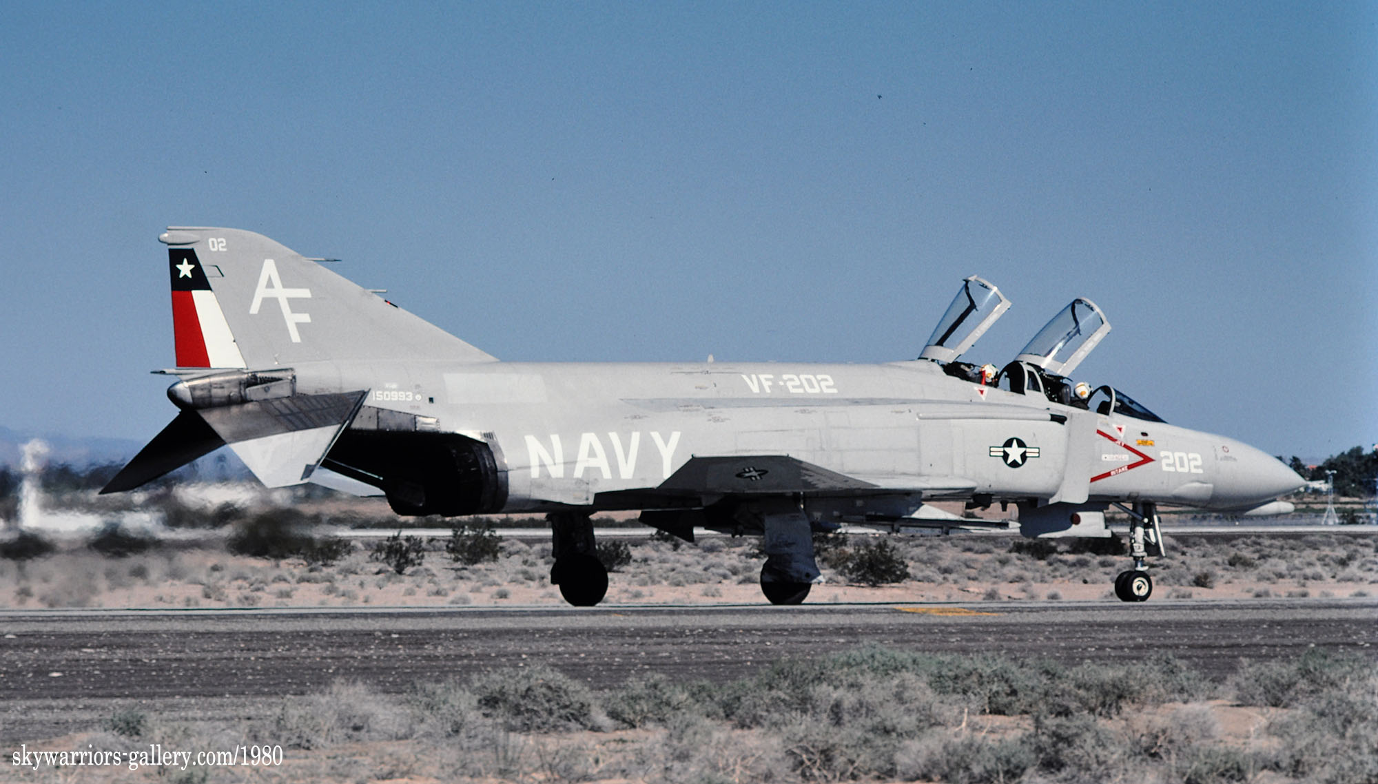 隣のVF-201のページでご紹介した通り、1970年7月VF-201より僅かに早くNASダラスで創設された予備役飛行隊でF-8Hクルセイダー戦闘機を配備されて訓練を開始している。1976年にF-4Nに機種交換し、私たちがユマでVF-202と出会った時は、ちょうどF-4N受領から4年目の春だった訳である。この頃のCVWR-20の構成は、戦闘機部隊が、VF-201とVF-202、攻撃機部隊が、VA-203とVA-204とVA-205の3個、偵察部隊がVFP-206、電子戦がVAQ-209、早期警戒隊がVAW-78の構成である。VF-302を除きCVWRに配備されたF-4Nの飛行隊は、何故かスタート当初レードームを一様に黒く塗っており、それだけにマニアでもマーキングでは良く知られた存在だった。姉妹飛行隊のVF-201と共にその後F-14A戦闘機に機種転換したが、VF-201がTARPS(写真撮影キット)の運用応力を持つことになり、それを譲ったVF-202は、海軍の削減計画に飲まれ1994年に解散の憂き目にあってしまった。VF-202解散で余剰になったF-14は、NASオシアナの訓練部隊VF-101へ移管された。(2021/5 記)