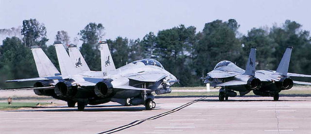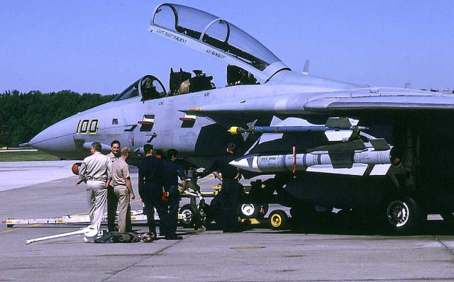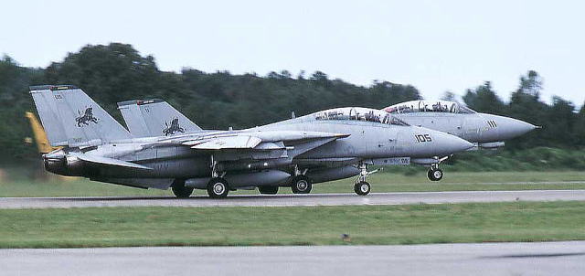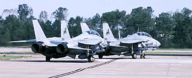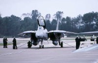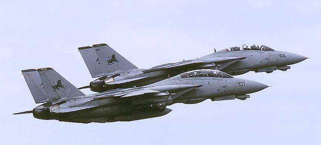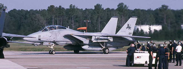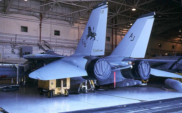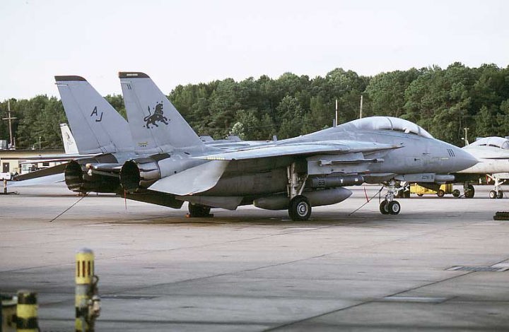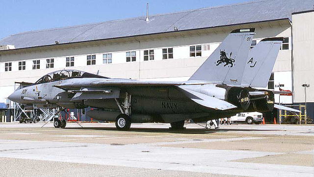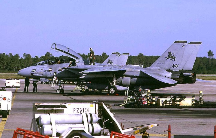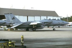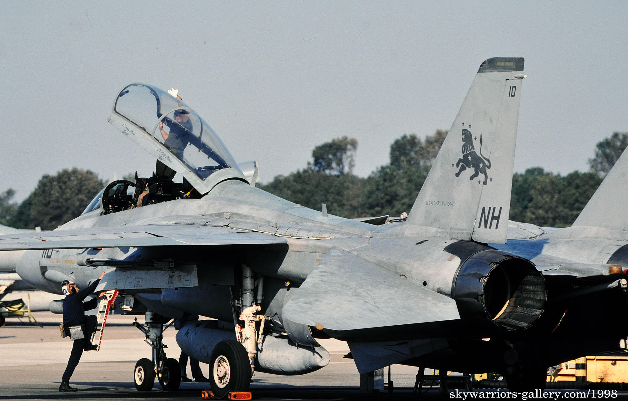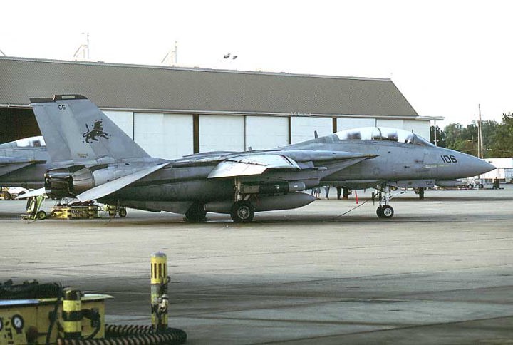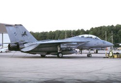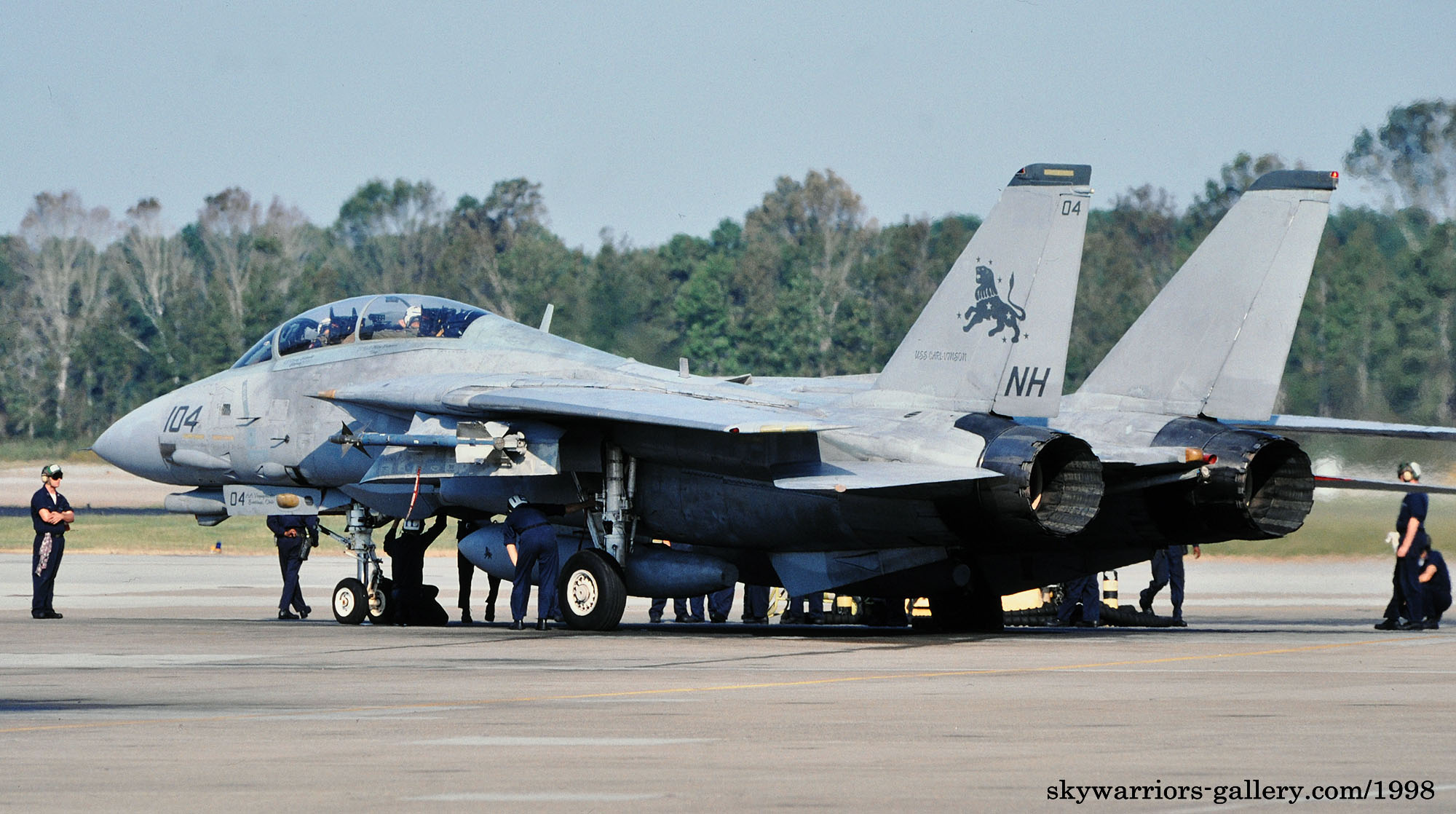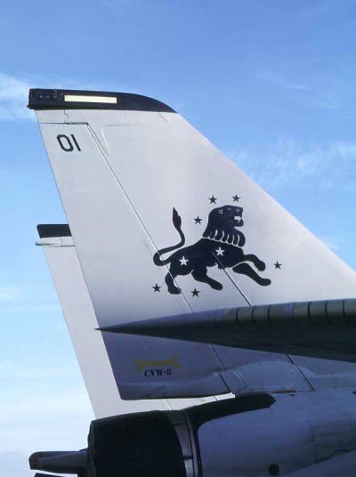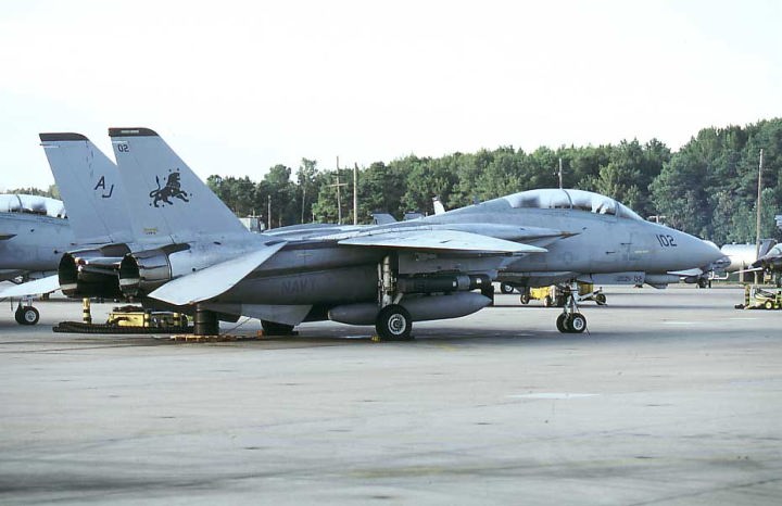 この飛行隊がF-14Aを受領したのは1976年。私が本格的に航空機の写真を撮り始めた年であった。翌年1977年11月に空母キティホークが横須賀に入港した際、私も含め厚木のマニア諸氏はこのF-14飛行隊の厚木基地飛来を大いに期待したものである。(その前の月、10月に寄港したUSSコンステレーションのVF-211/VF-24の厚木飛来とローカルフライトで、マニア諸氏は皆味を占めていた)。しかしA-7/A-6などが訪れたものの、F-14Aは空母に乗ったままで一度も厚木基地に顔を出さなかった。何年か後に厚木/嘉手納に何機か飛来しているものの、私にとって日本では殆ど縁の無い部隊になっていた。シスター・スコードロンのVF-114”蟻喰い君”など一度も目にしない内に解散してしまった。結局、彼らに会うことが出来たのは20世紀も終わりが迫った1999年、しかもNASオシアナと言うアメリカ東海岸のえらい遠い所である。大西洋方面のF-14部隊ならともかく太平洋方面の部隊で初撮りに23年もかかったなんて、よっぽど縁の無い飛行隊だったのだろう。(2002年10月 記)