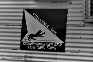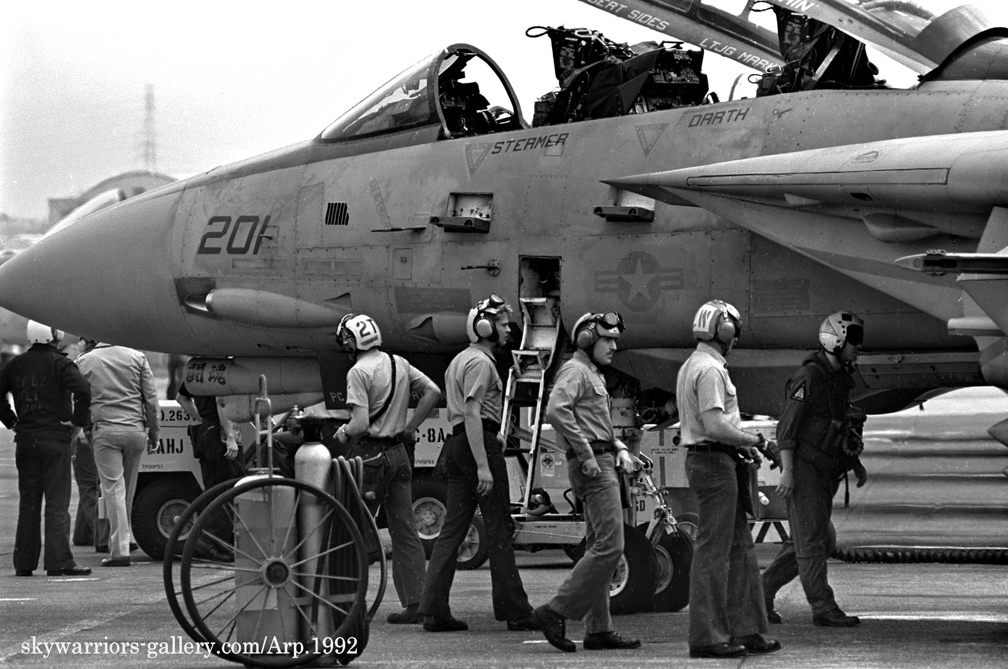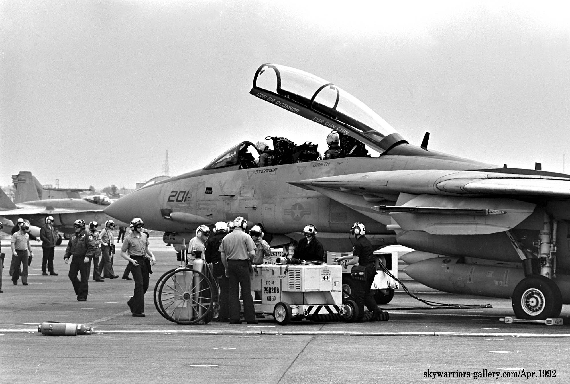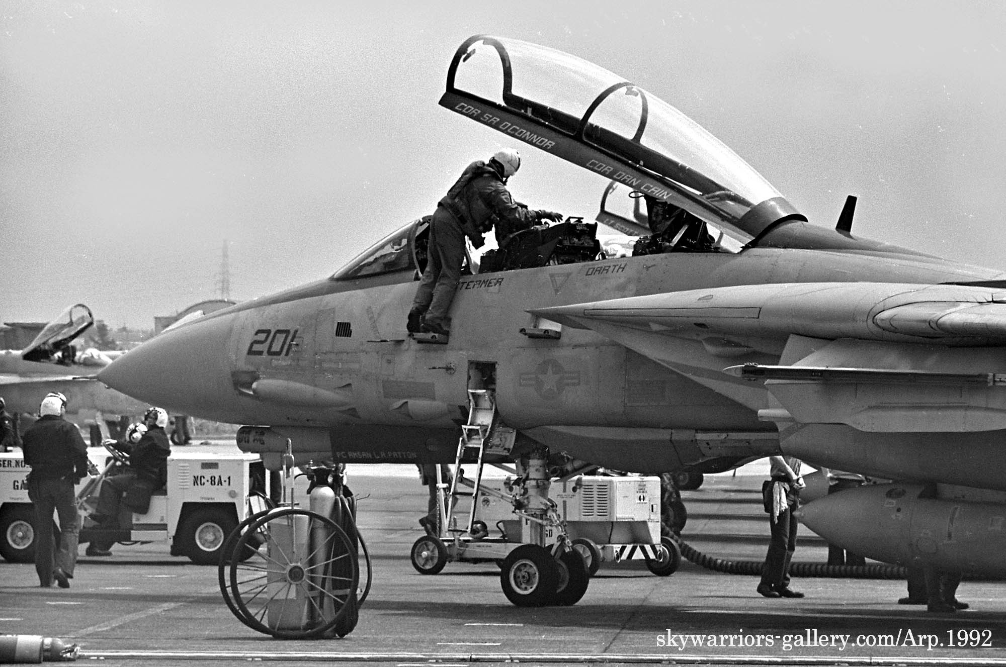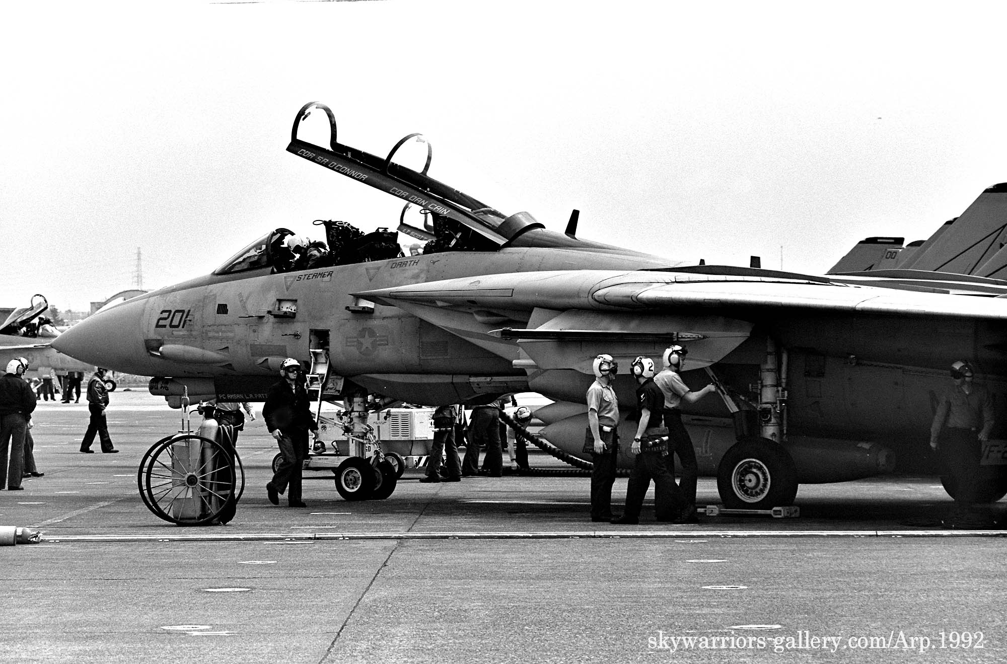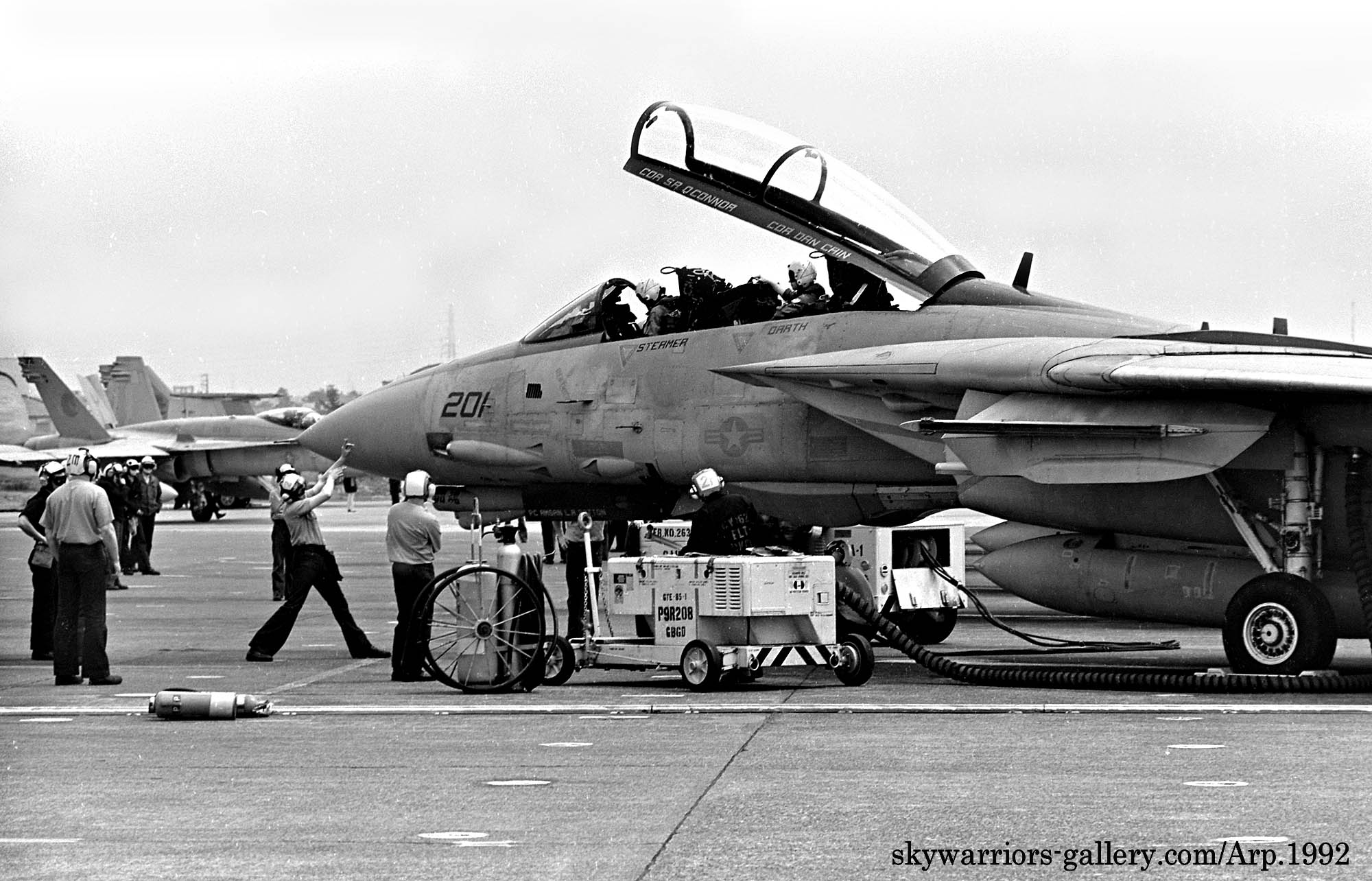 ↑ 確か金網越しに撮影したと思うが、VF-21のF-14Aのエンジン始動前準備風景から、始動⇒タキシングに至るまでの一連のシーンを間近に見る事が出来たのは幸運だった。私は、興奮しながら完全に自分自身の世界に浸って、一連のクルーの動きをファインダーに収めた。機首下面のカメラ筒に”闘魂”と書かれている。