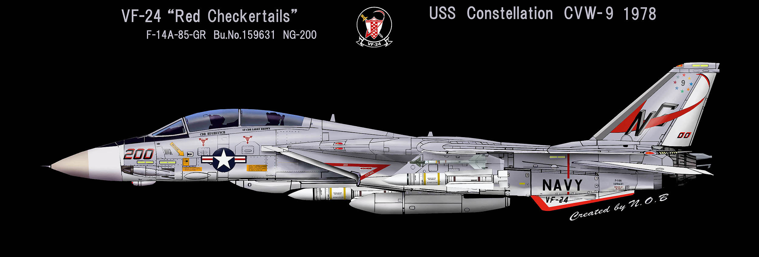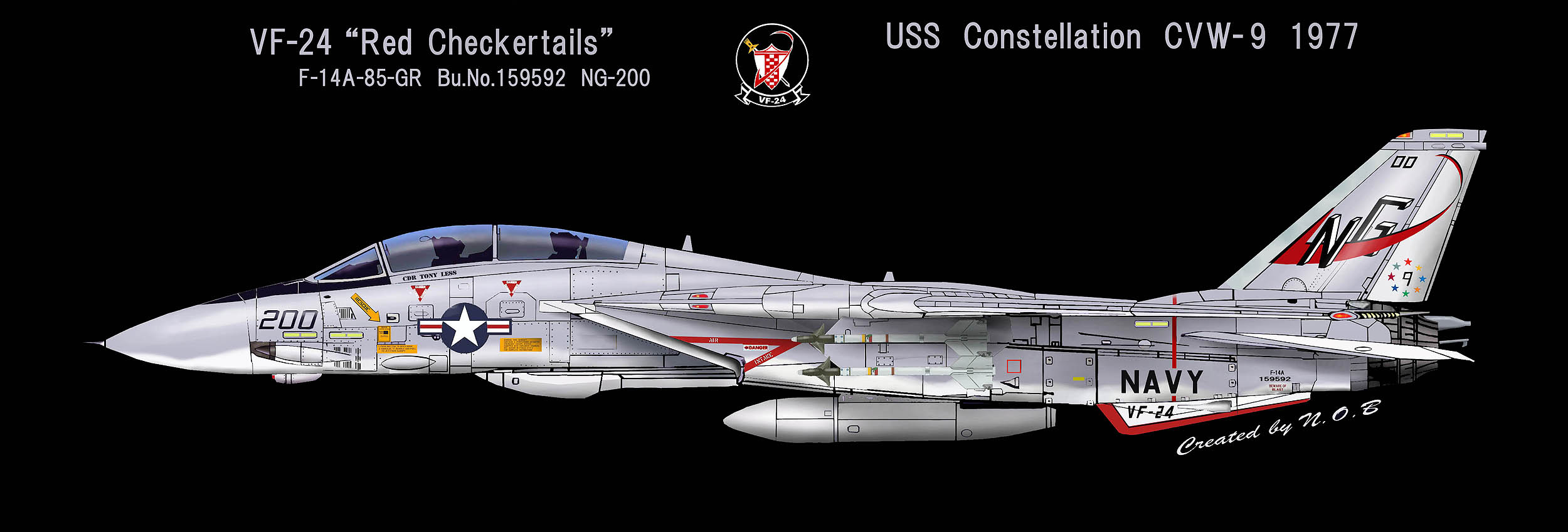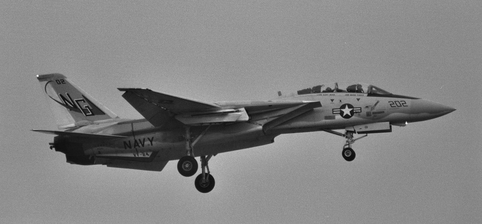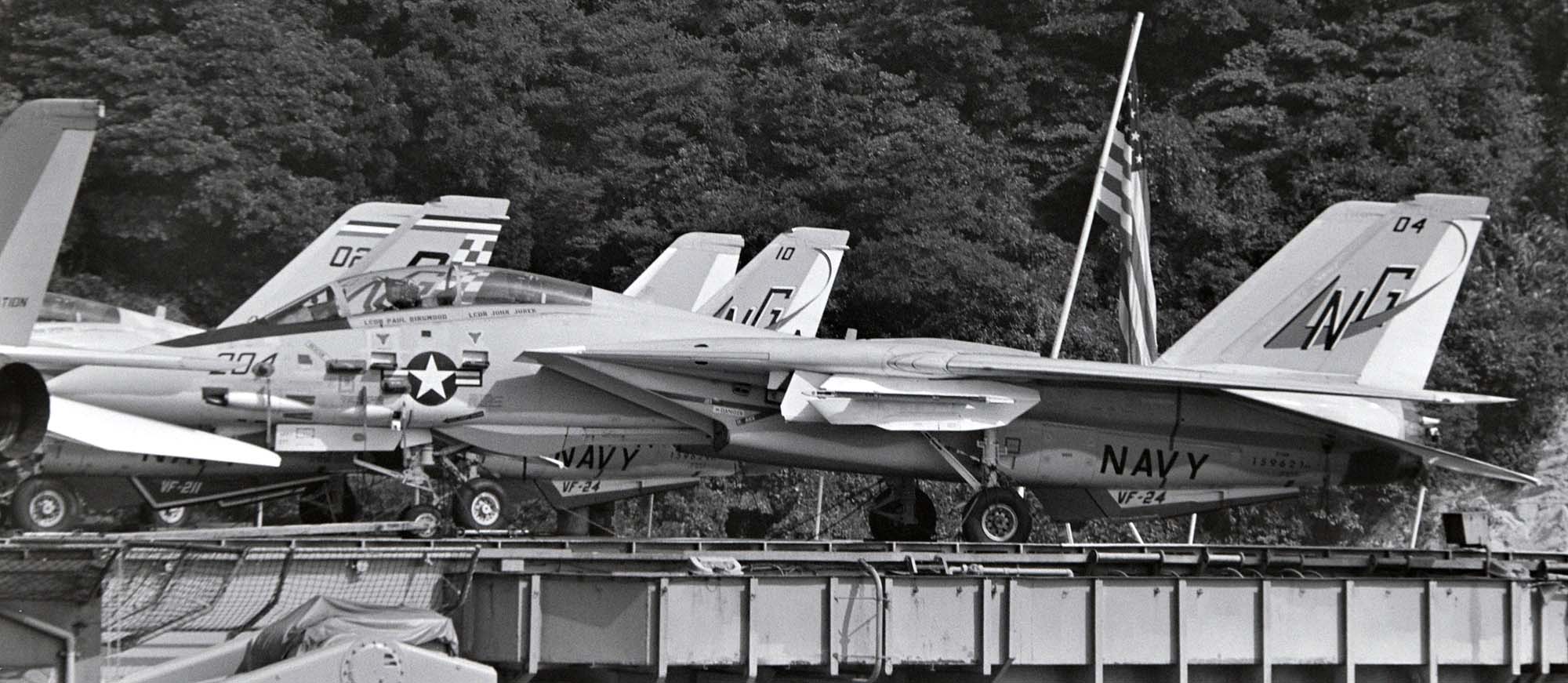1955年の部隊創設時には部隊名はVF-211「Red Checkertails」だったが、VF-24となってこの部隊名を引き継いだもの。シスタースコードロンのVF-211と部隊名を互いに交換した形になった。また、多くのF-14飛行隊がF-4ファントムからの機種転換だったのに対し、F-8クルーセーダーからF-14Aトムキャットに機種転換した珍しい部隊でもある。1977年10月10日〜25日の間USSコンステレーション横須賀寄港と共に厚木に展開したので、多くのマニアが目にする事ができた。また1977年9月15日の三沢基地のオープンハウスには、NG-200が飛来展示されている。