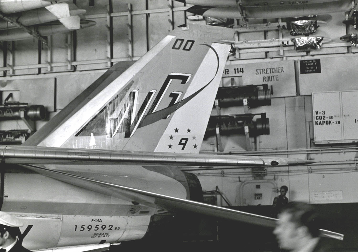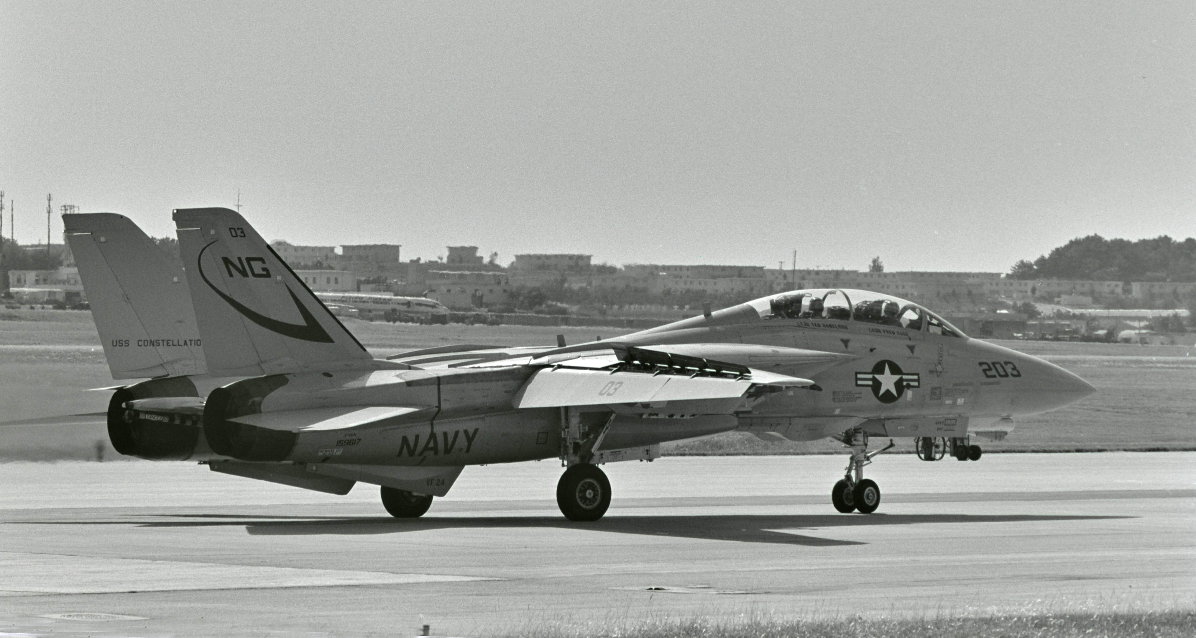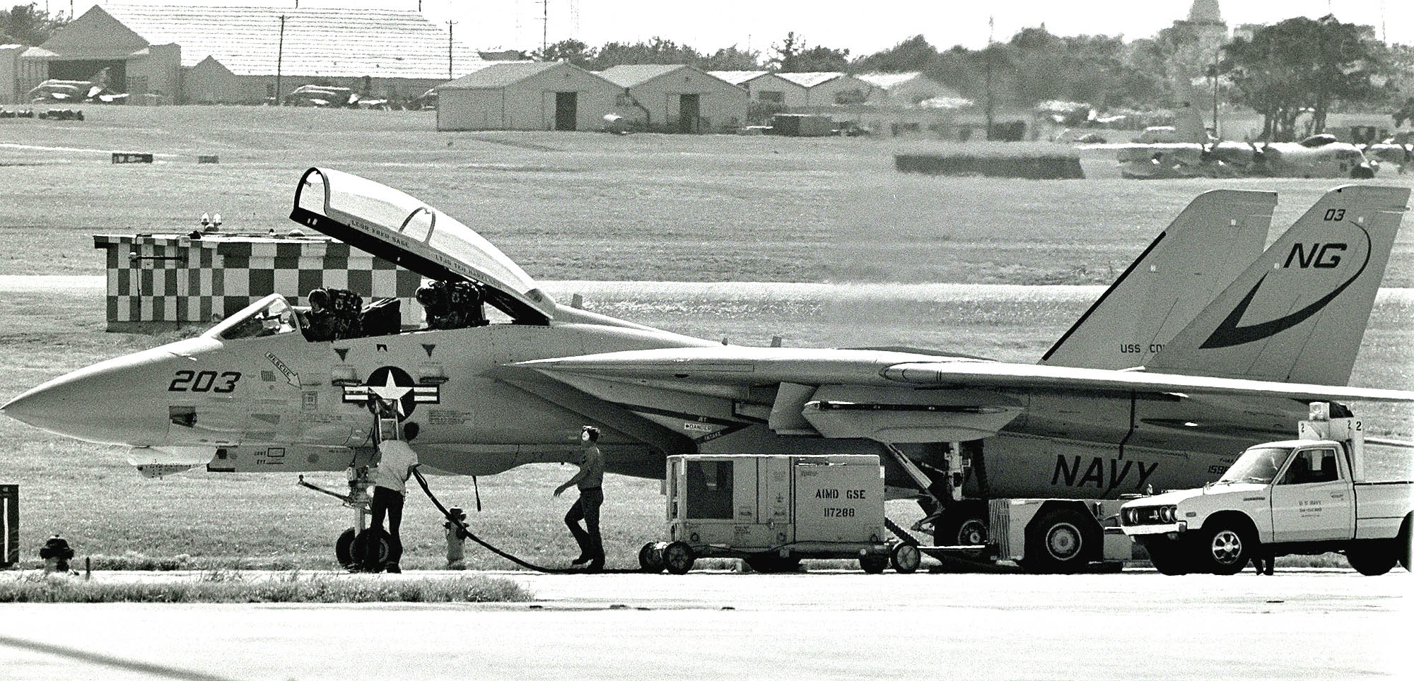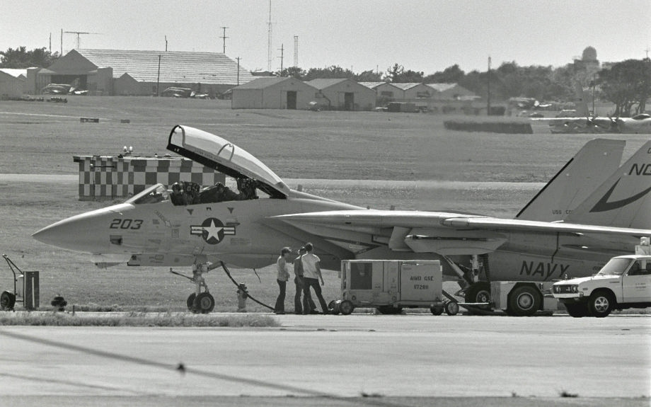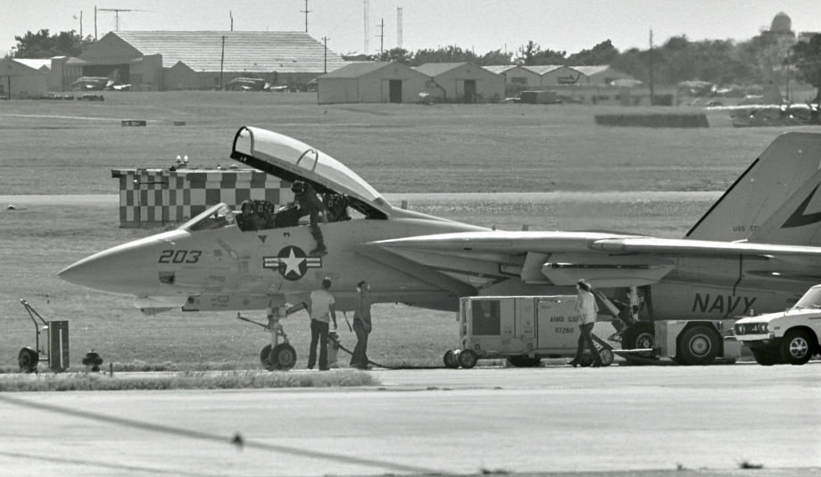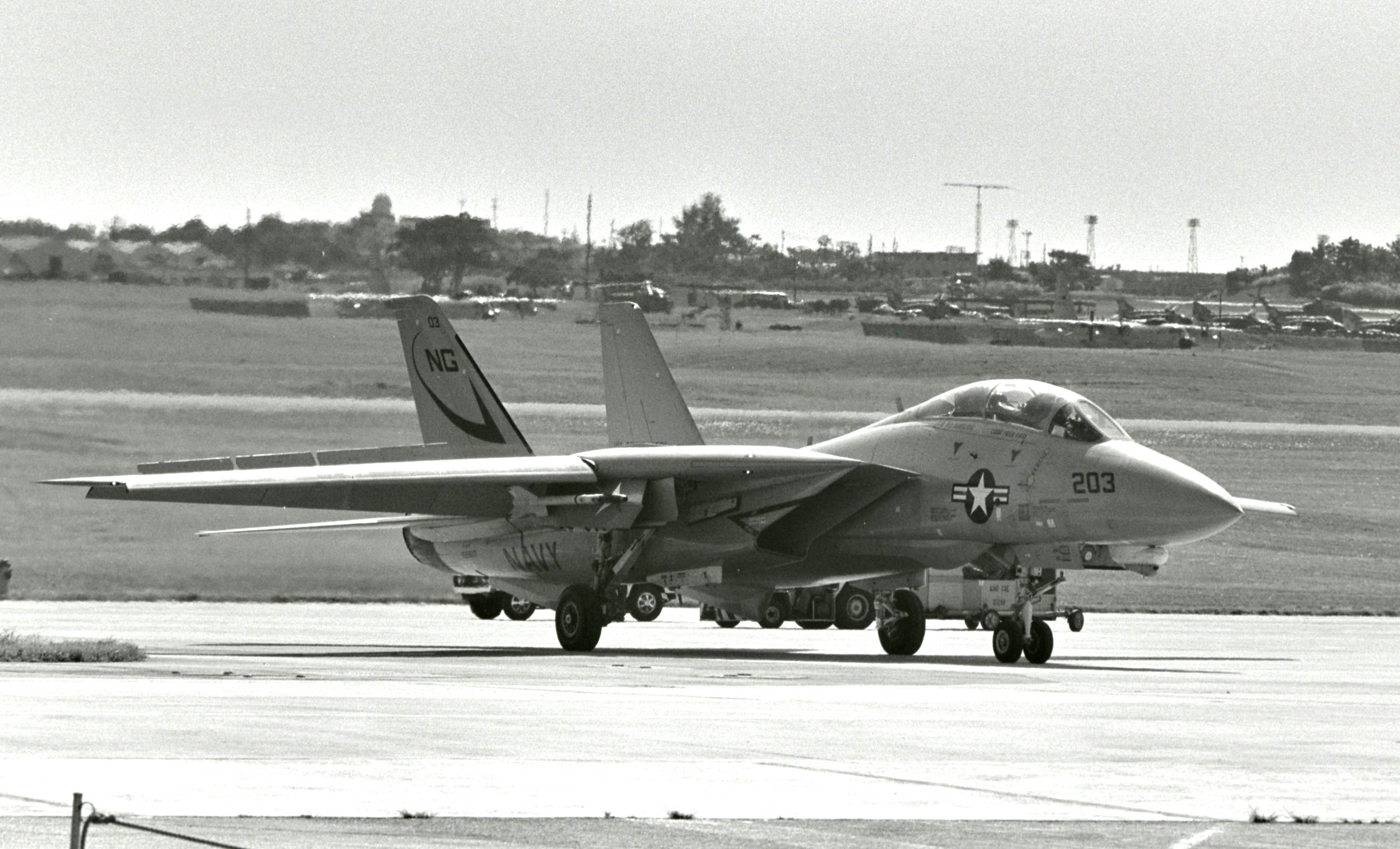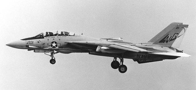 ↑ 1979年10月 Vf-211のF-14Aと2機で嘉手納に飛来したNG-200番 尾翼にCVW-9のマーク。