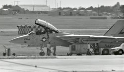 約10日近くの厚木基地における訓練飛行で、嘘か本当かは知らないが当時のランウェイがF-14のタッチダウンの重みでへこんでしまったとの噂が流れてきた。後にCVW-5にF-14Aが配備されると決定された後、滑走路のかさ上げ工事が行われたはずである。上写真はUSSコンステレーッション出港後、空母から飛来した3機のF-14Aの内 VF-24のNG-202.