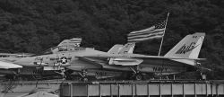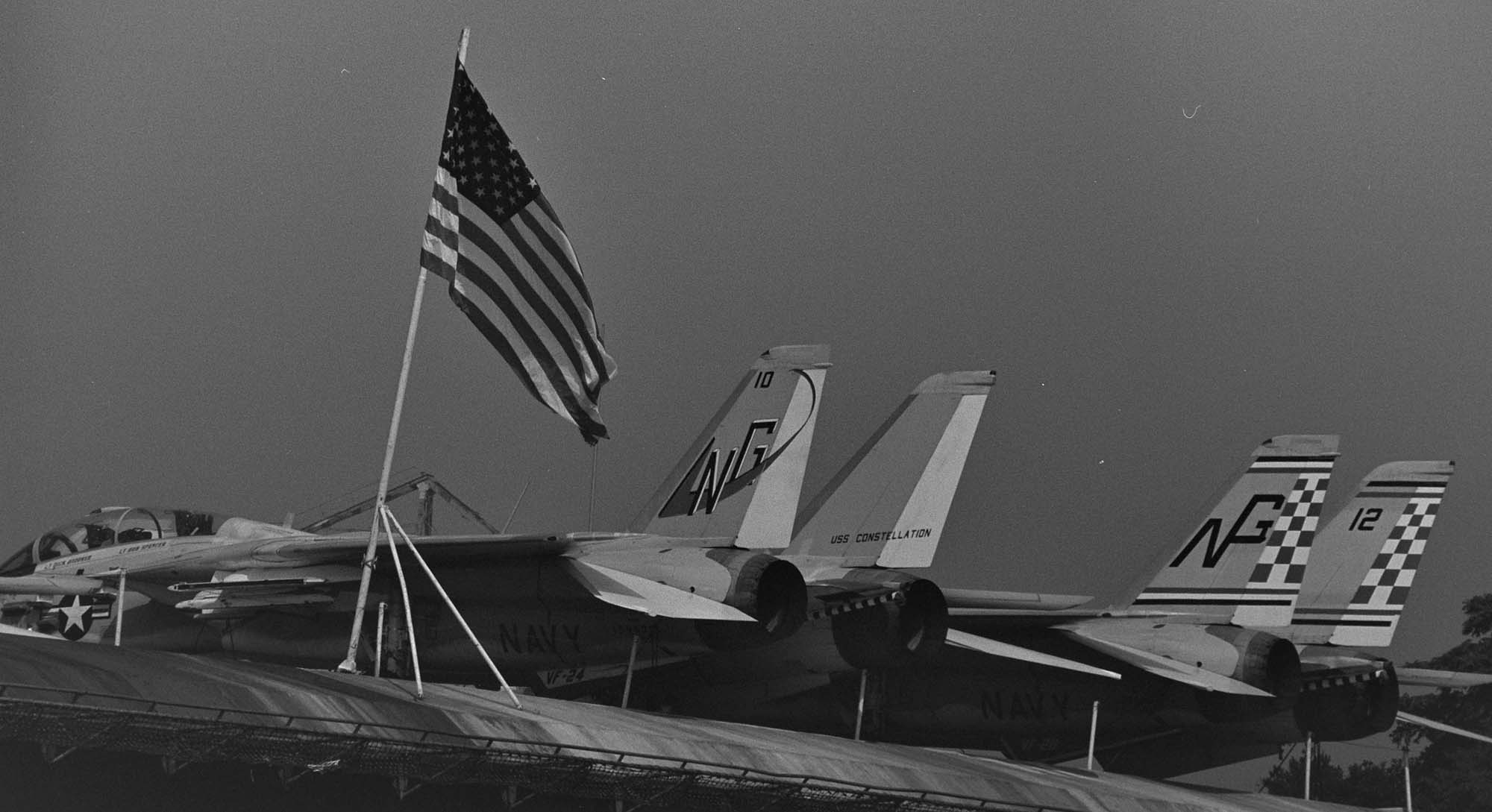 1977年10月10日横須賀基地に寄港したUSSコンステレーションの甲板上にワイアーで固定されたF-14A。10月16日公開当日は、航空母艦の格納庫のみが立入許可され、甲板に上がることはできなかったので、隣に係留された公開されていた護衛艦ひえいに乗って艦上から望遠でできるだけ撮ろうしたマニア諸氏が多かった。私もその一人であった。
