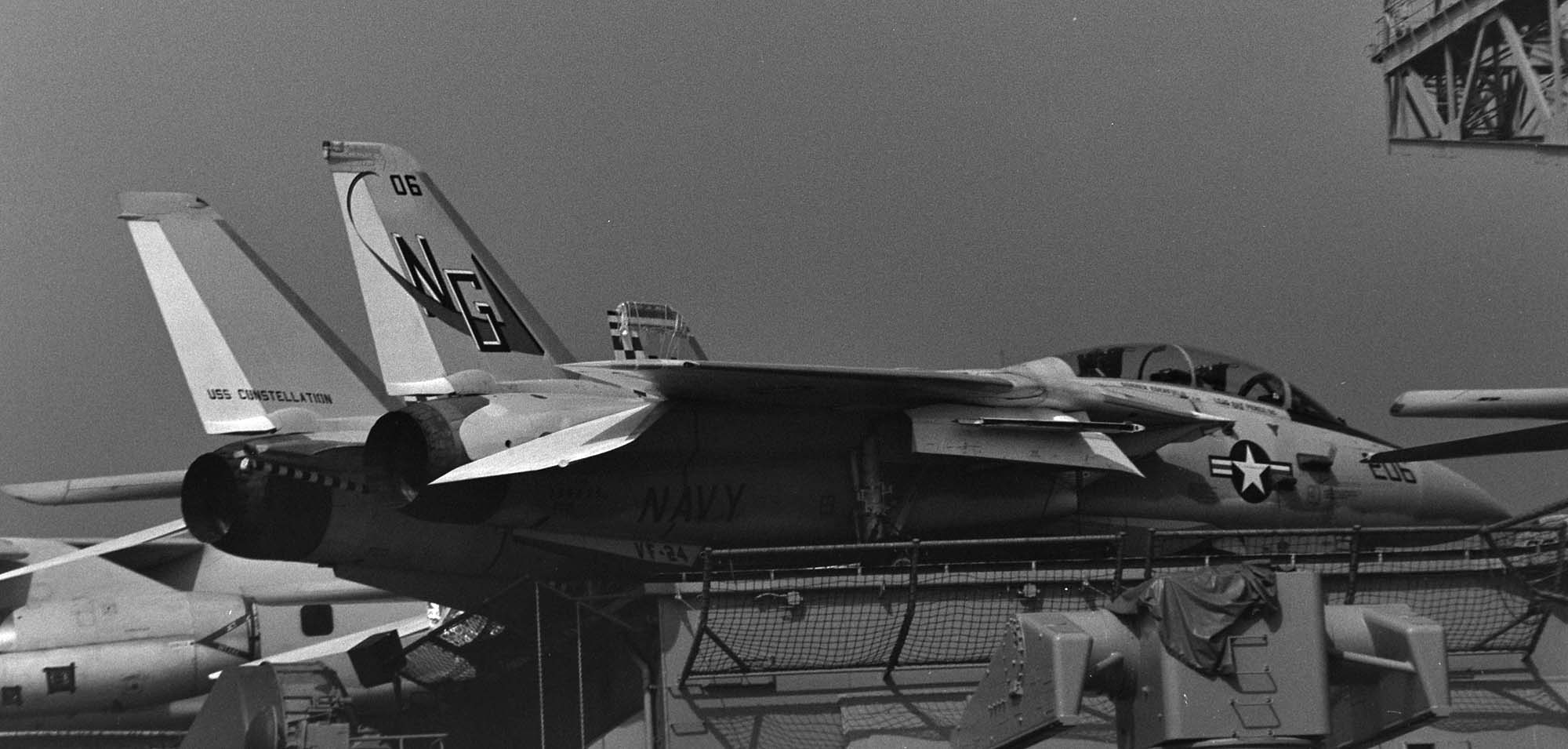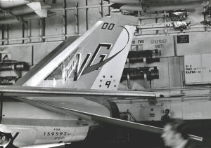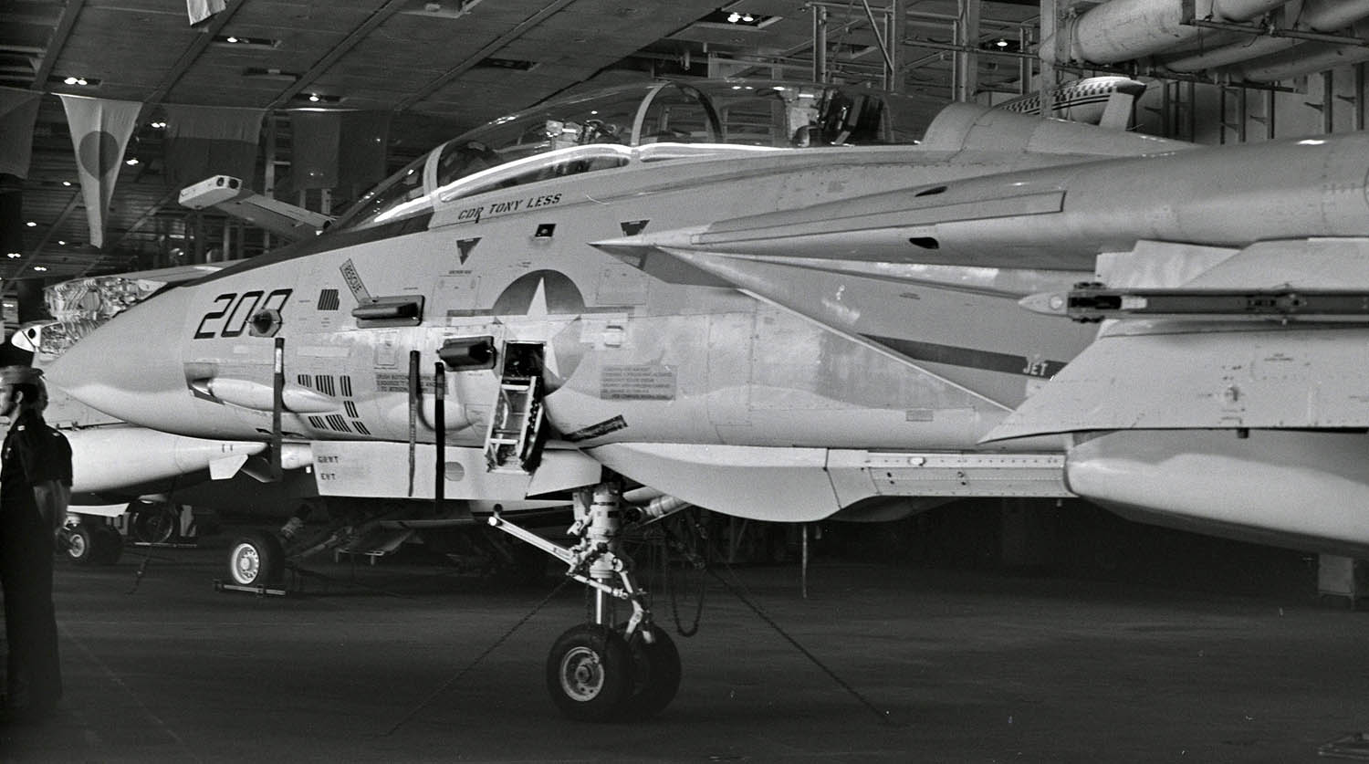 上は1977年三沢の公開日に展示されたVF-24のCAG機 コックピットには、CDR TONY LESS中佐の名前がある。同年USSコンステレーションの一般公開の時も艦内格納庫で展示された。F-8Uクルーセイダーの尾翼に合わせて考案されたチェッカーはF-14の尾翼にもよく似合った。