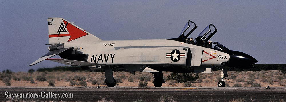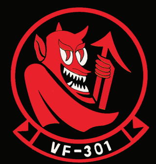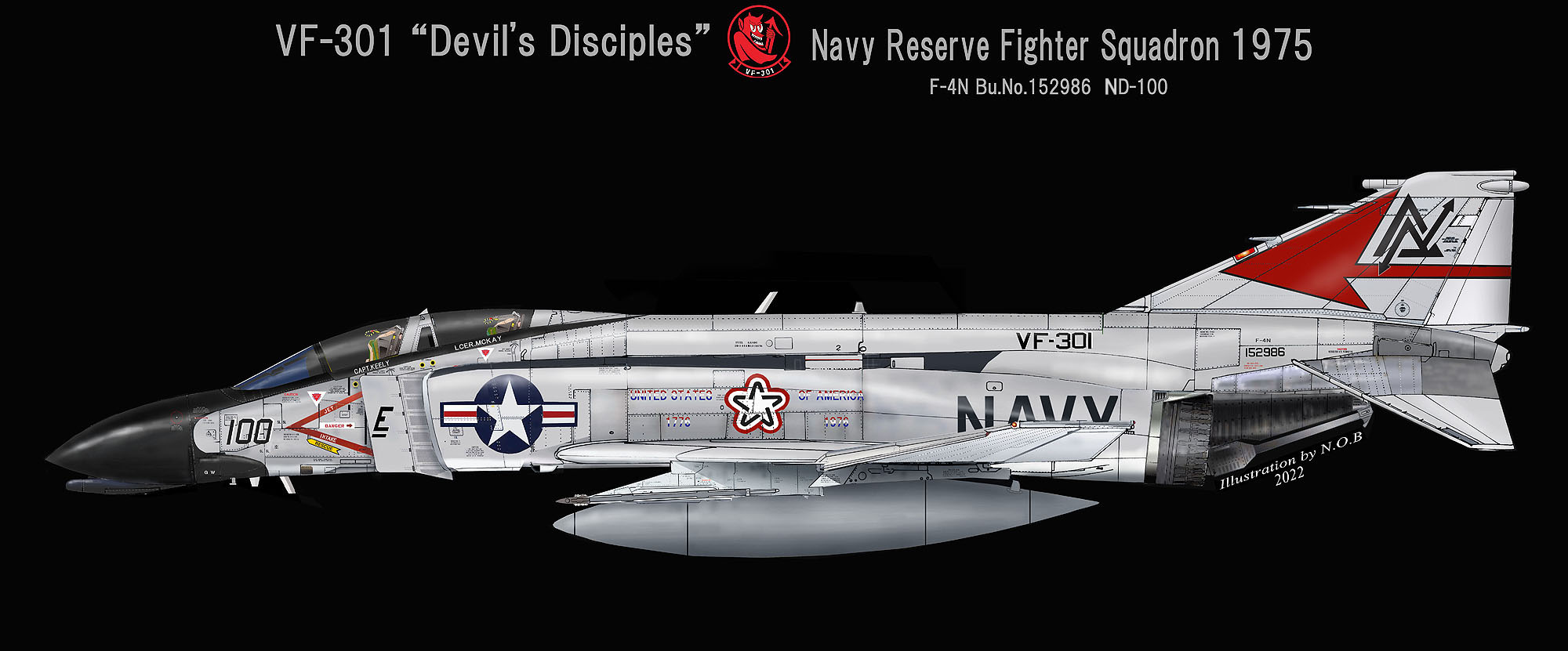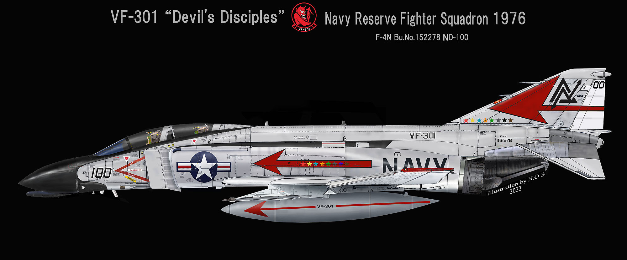 海軍予備役飛行隊のひとつで シスターSQのVF-302と共にNASミラマーに本拠地を置いていた。下の写真はMCASユマで1980年に撮影したものだが、日本ではその当時見られなくなったF-4N型を使用していた。この時MCASユマで開催された「Reserve Fighter Derby 1980」に参加していたF-4ファントムのリザーブ飛行隊は全てN型を使用していた。レードームをグロスブラックに塗りこみ、尾翼には悪魔の真っ赤な銛をデザインして描いており実に美しいお姿である。予備役と言う事もありJ型への更新も遅いかと思いきや、当時USSコーラルシーにF-4Sが搭載できない事が判明し、この空母に乗る予定のVF-154/21に急遽VF-301とVF-302のN型を提供したため、変わりにS型を受領する事になったのである。従ってこの部隊は N型から一挙に新鋭のS型を揃える予備役としては実にラッキーな飛行隊でもあった。後にF-14Aを受領するが残念ながら1994年に解散した。