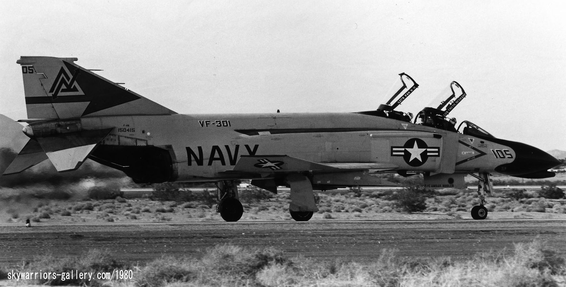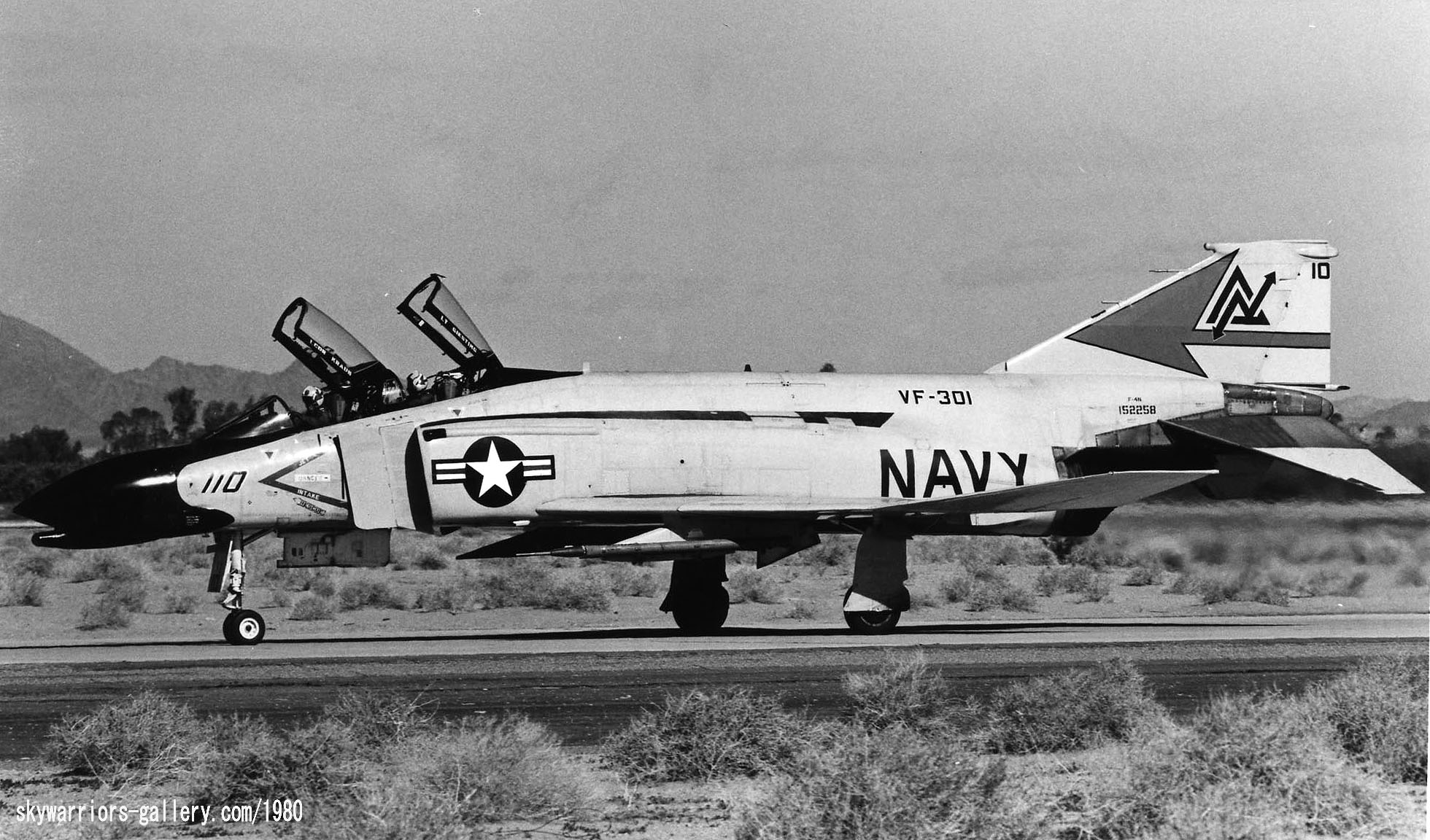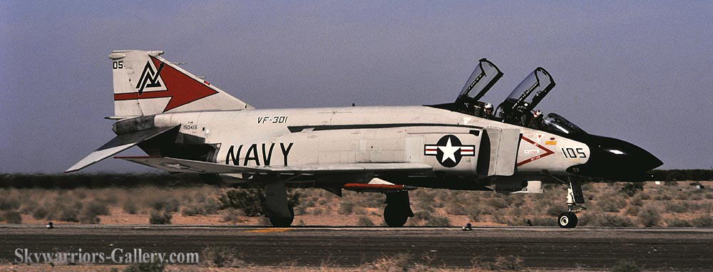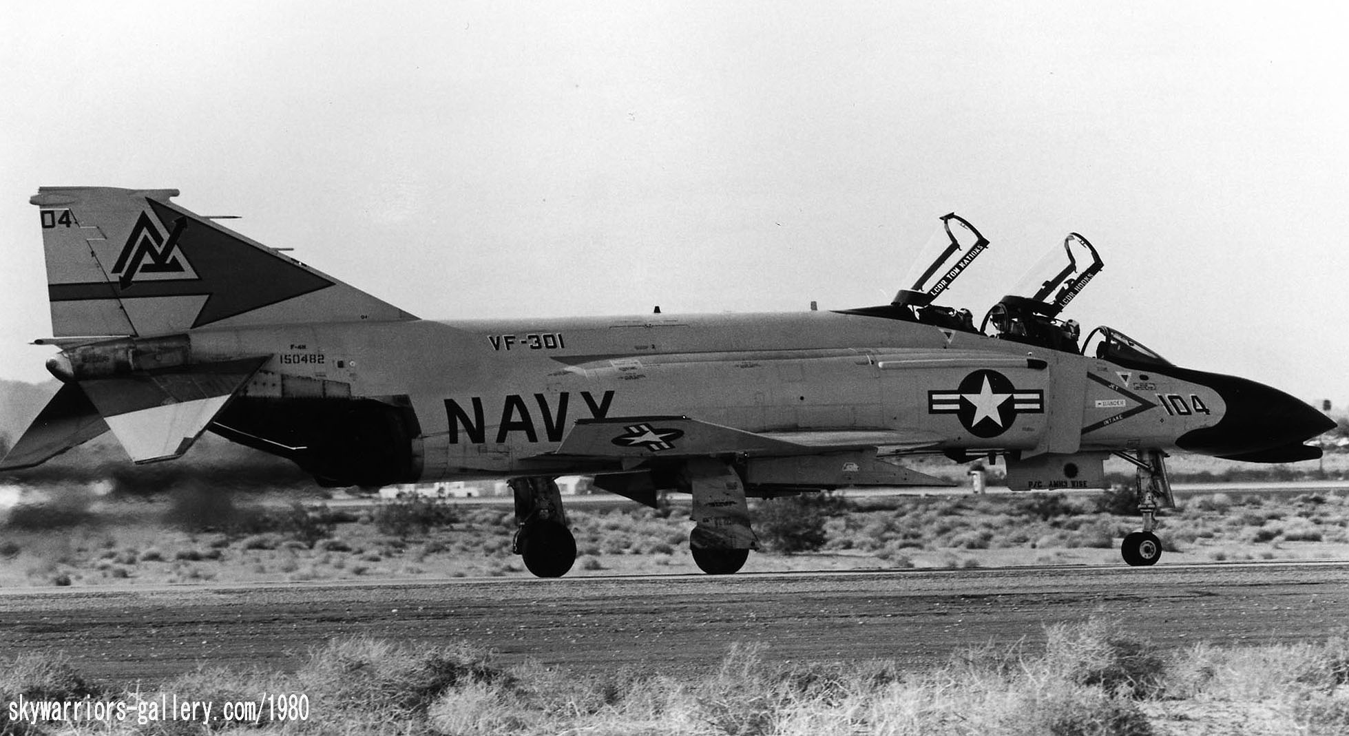 海軍予備役飛行隊のひとつで シスターSQのVF-302と共にNASミラマーに本拠地を置いていた。下の写真はMCASユマで1980年に撮影したものだが、日本ではその当時見られなくなったF-4N型を使用していた。この時MCASユマで開催された「Reserve Fighter Derby 1980」に参加していたF-4ファントムのリザーブ飛行隊は全てN型を使用していた。レードームをグロスブラックに塗りこみ、尾翼には悪魔の真っ赤な銛をデザインして描いており実に美しいお姿である。予備役と言う事もありJ型への更新も遅いかと思いきや、当時USSコーラルシーにF-4Sが搭載できない事が判明し、この空母に乗る予定のVF-154/21に急遽VF-301とVF-302のN型を提供したため、変わりにS型を受領する事になったのである。従ってこの部隊は N型から一挙に新鋭のS型を揃える予備役としては実にラッキーな飛行隊でもあった。後にF-14Aを受領するが残念ながら1994年に解散した。