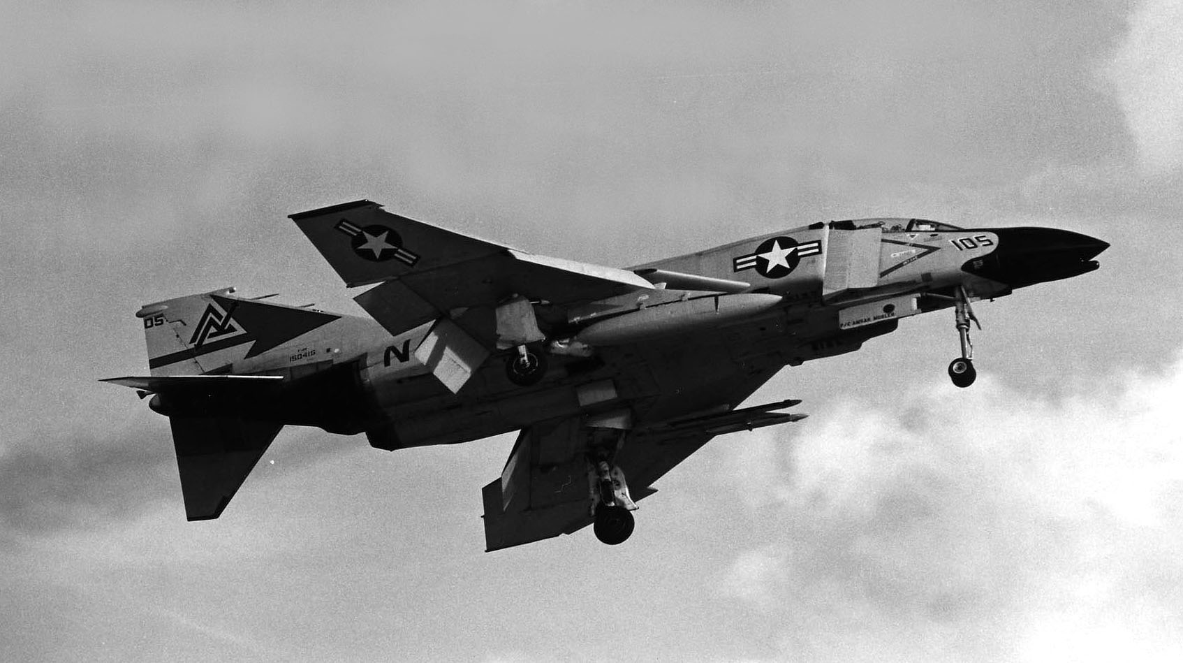 ↑ ファントムS型を受領した後のマーキング、1984年はロービジビリティ一全盛時代であり、この規則に沿った低視認性の高いマーキングに塗り替えられた。このパターンはグレー系とブルーグレーの4色迷彩で、赤い矢尻の線が書き込まれている点は救われる部分。尾翼付け根の胴体に書かれたMig-Killerマークは、この機体がベトナム戦時代に挙げたものであり、この部隊の成果ではない。F-4S