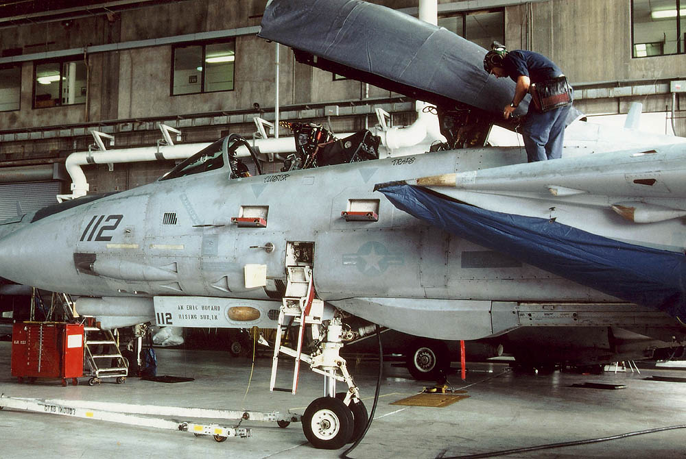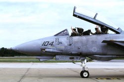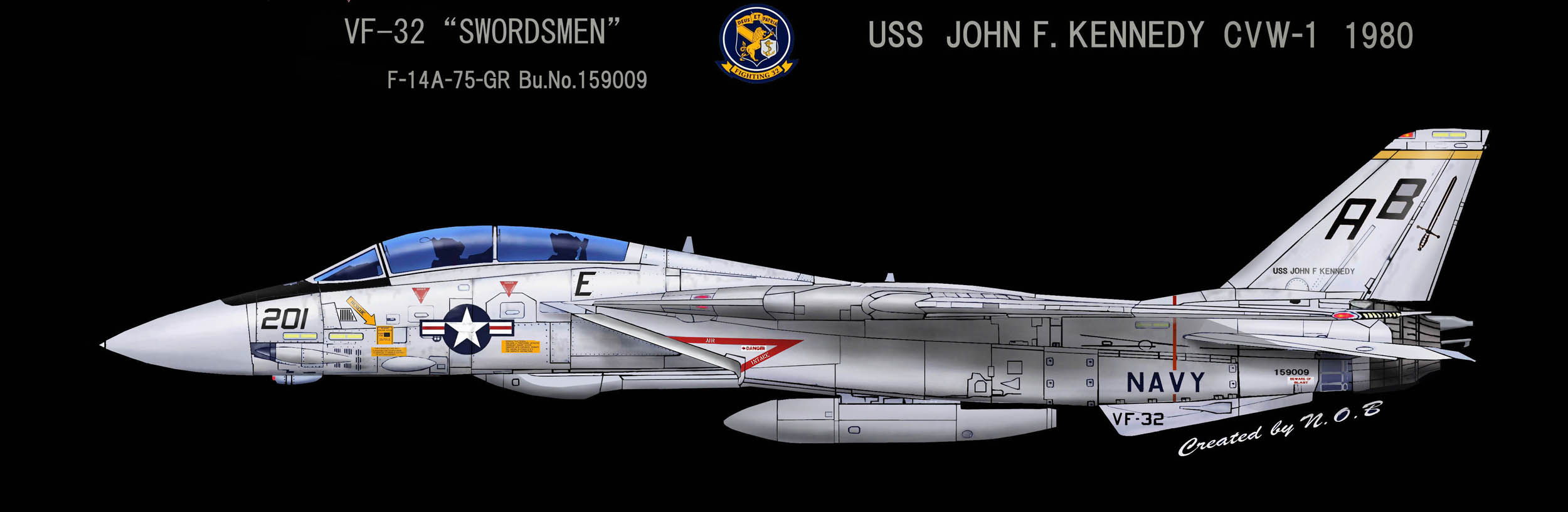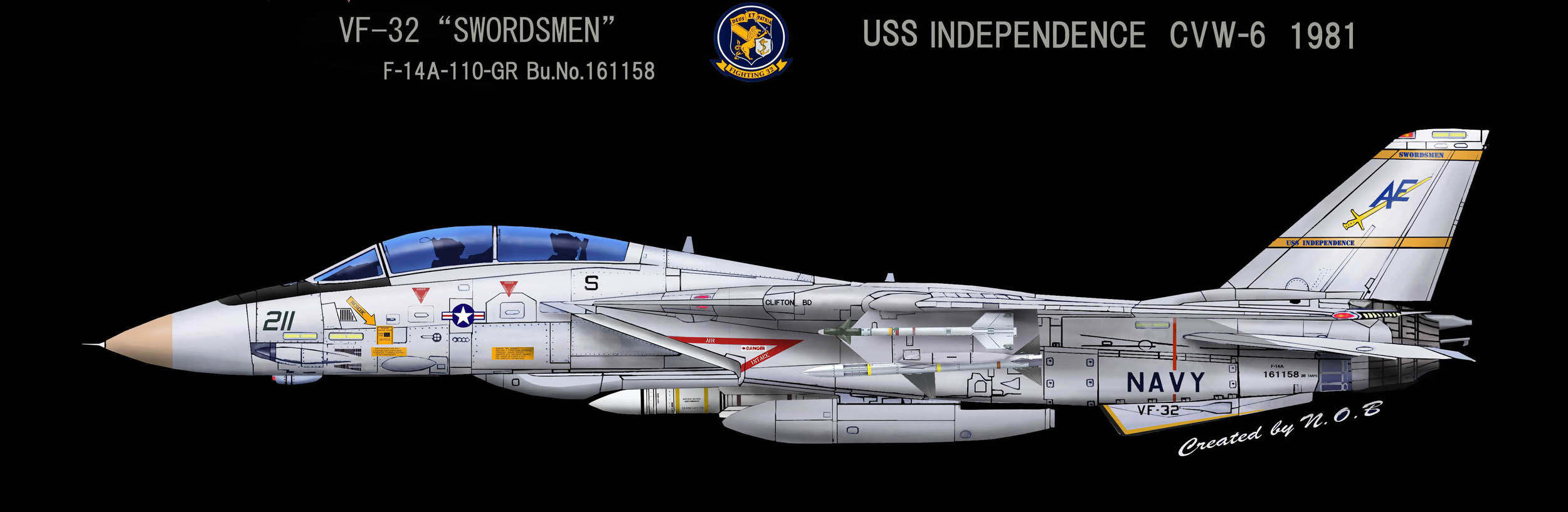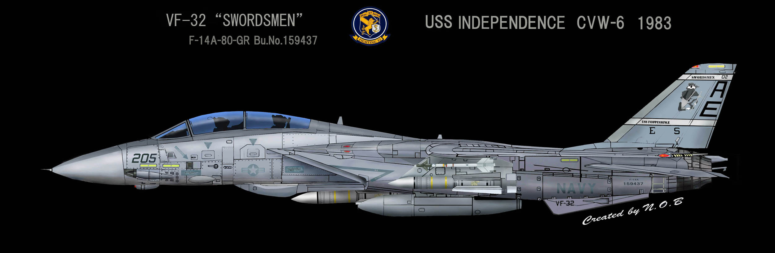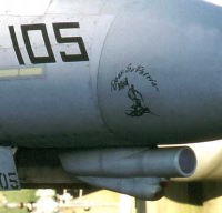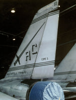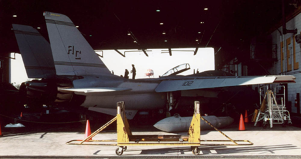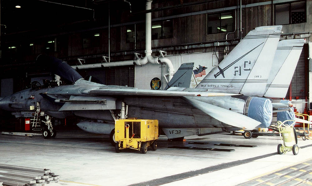 VF-32の創設は1945年2月なので、太平洋戦争が終了する間際に生まれた飛行隊というわけだ。VF-32と言う部隊ナンバーになったのは創設後3年の1948年、創設5年後の1950年には朝鮮戦争に参加している。1957年に海軍航空隊の中で、初めてF-8U-1クルーセーダー戦闘機を受領した飛行隊で、次のF-4Bは1965年から受領している。1974年からは当時最新鋭のF-14Aへ更新。この年彼らは10年間無事故達成、17000時間の無事故記録を残している。1982年VF-32のF-14Aは長らくペアを組んでいたVF-14と別れ、その後F-14の空母1飛行隊運用への変更の際、部隊のF-14はTARPSの運用能力を得たが、このデジタルカメラ・システムは、後にリビヤ危機やその後の作戦で大いに活躍している。1996年頃からF-14Bへの転換を図った。