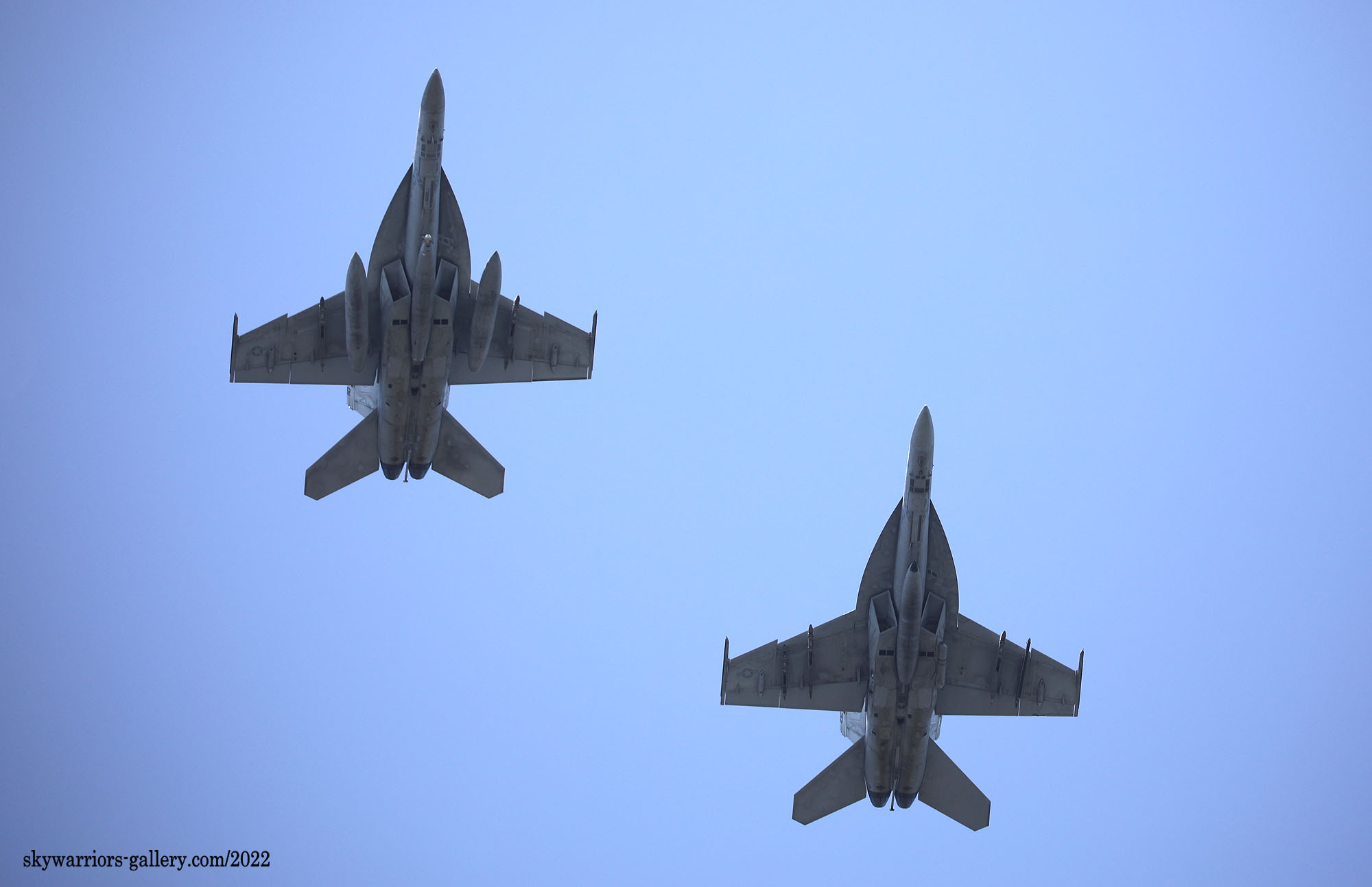 ↑ 2022年4月22日 翌日予定されている厚木公開(関係者のみ)の展示の為に、岩国基地から飛来したVFA-102のFA-18F。11時30分と言うTOP光の中であったが、岩国に移動し、しかもコロナの関係もあって厚木では珍客となってしまったCVW-5の戦闘攻撃機は、集まった多くのギャラリーを喜ばせた。