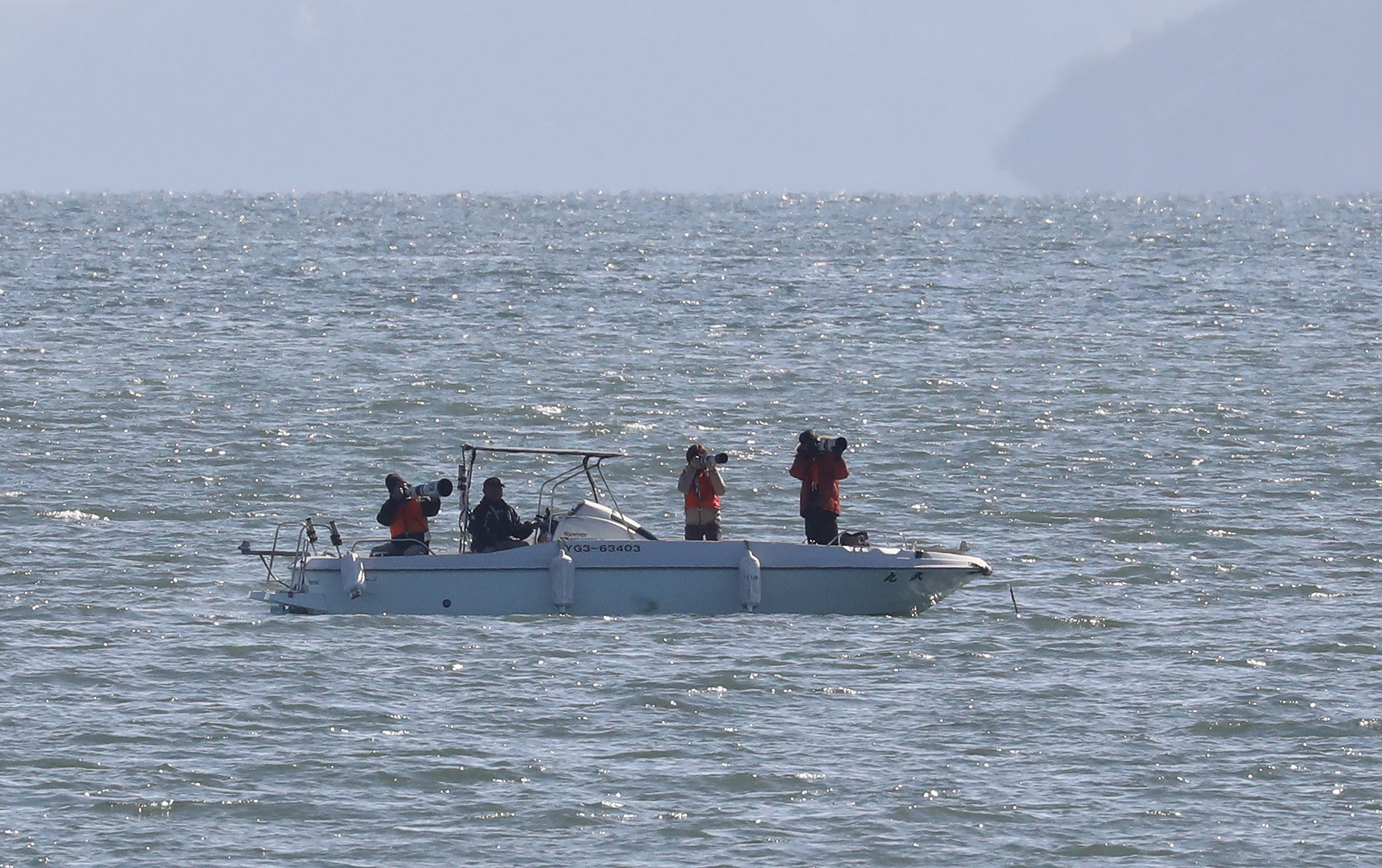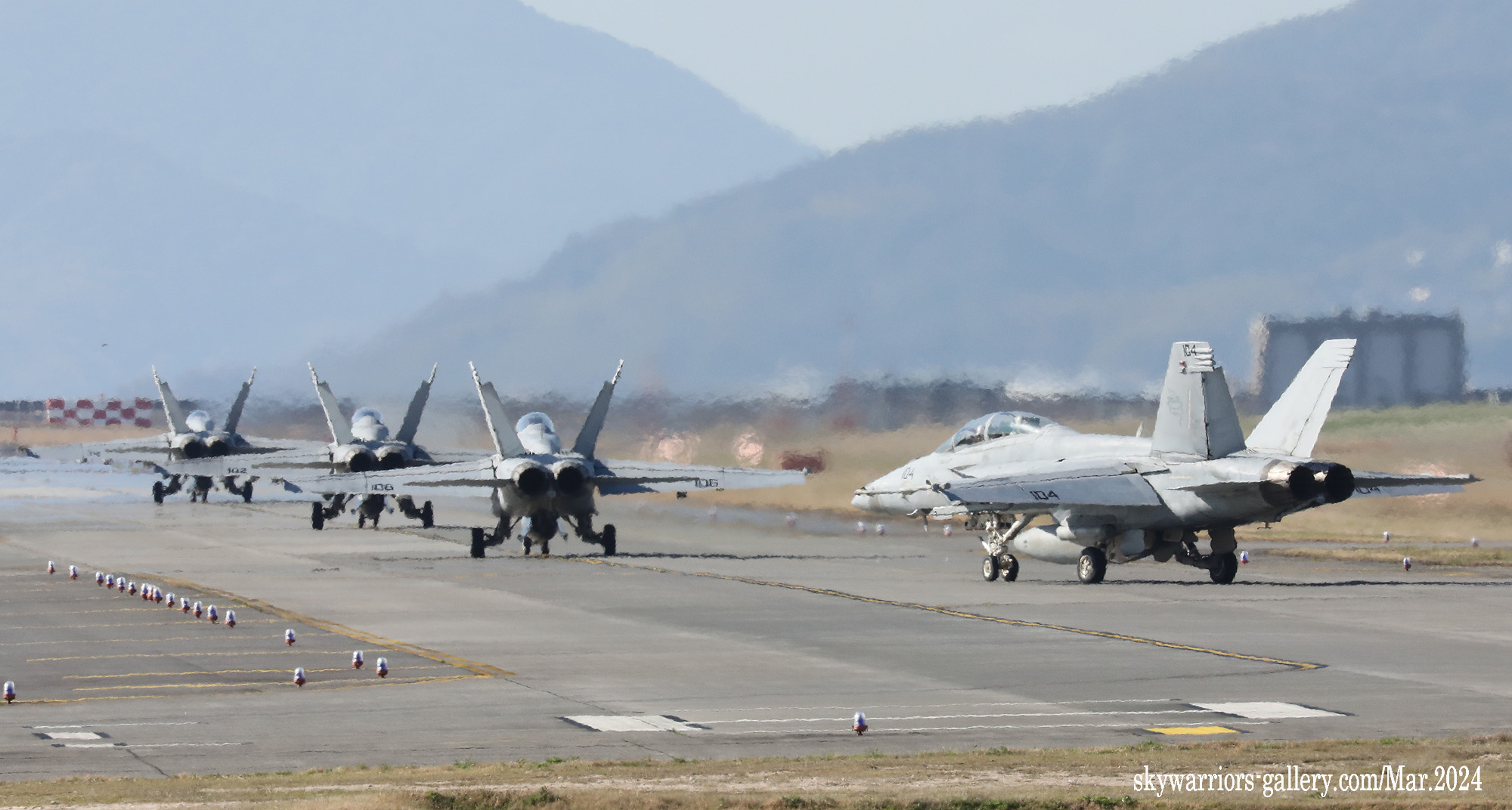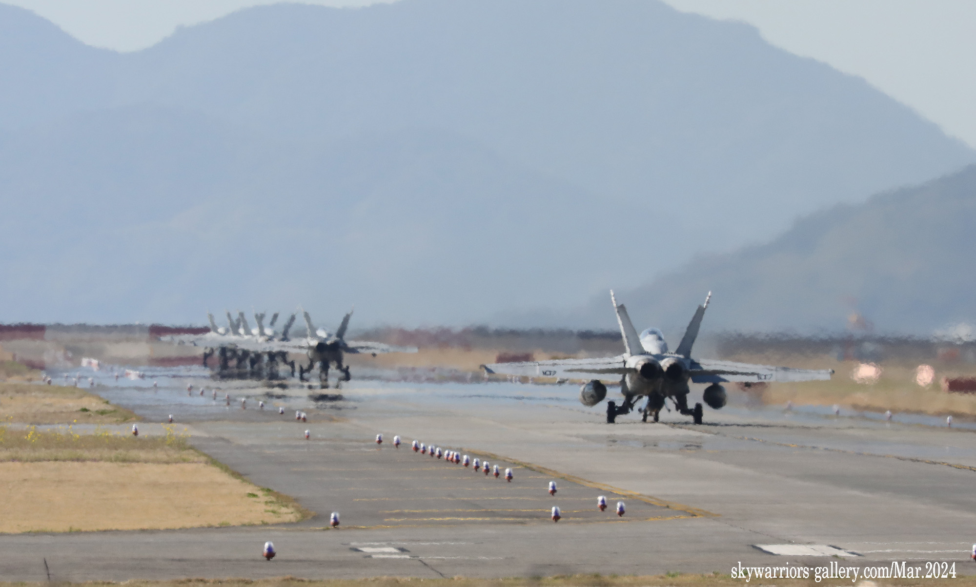 ↑ 2024年3月27日 当日は朝から晴天ではあったが、風向きはR/W-02。次々に離陸の為にランウェイエンドに向かうスーパーホーネットの群れ。彼らの離陸は、海側へ大きくバンクする所謂”岩国上がり”となる。しかも逆光であるから、晴天時の堤防側からでは離陸シーンは殆ど絵にならない。ベテランのマニア諸氏はボートをチャーターして沖に出て、順光で”岩国上がり”を堪能する。海に出て撮影すると言う手法は1970年代から一部のマニアが行っていたが、その時代は、滑走路の反対側に回りR/W-02での着陸を狙ったものだった。現在は、滑走路沖合移転後撮れなくなった地上からの”岩国上がり”を海に出て再現する方法だ。午前中のR/W-02で離陸を狙った”沖撮り”で、これは晴天時の午前中は非常に有効である。