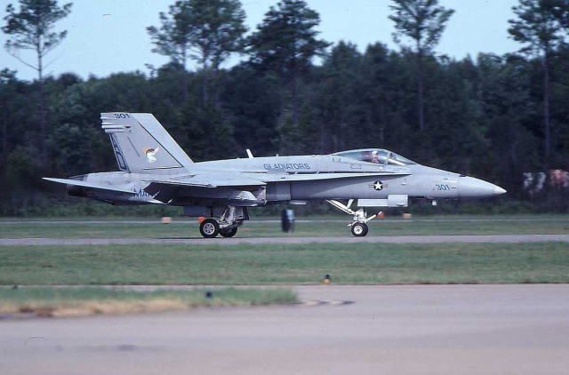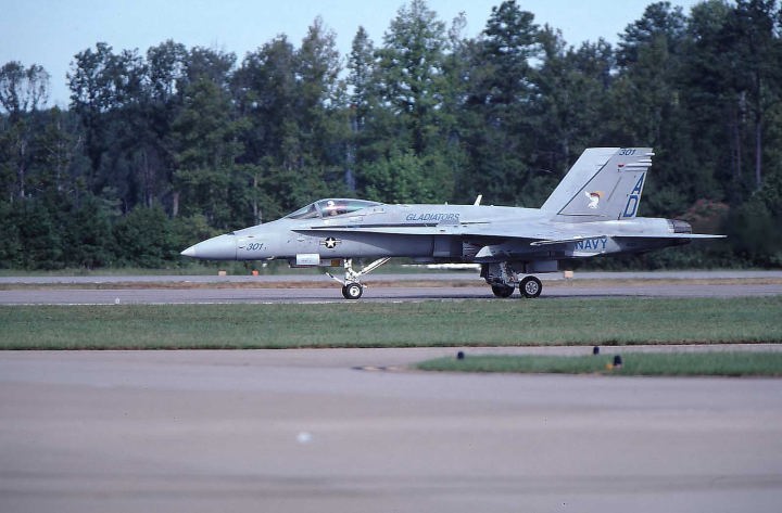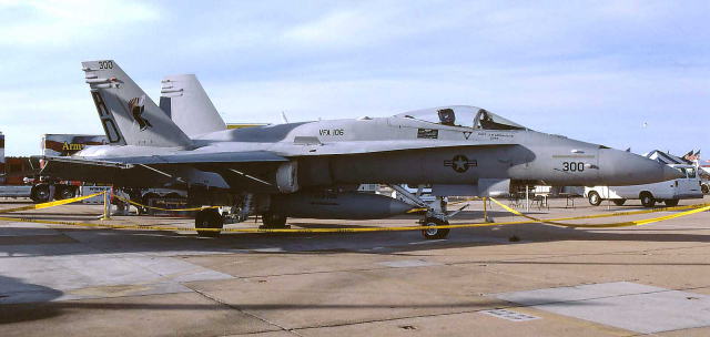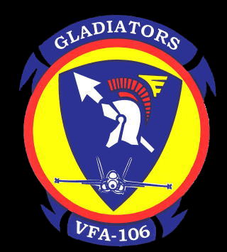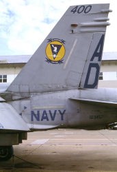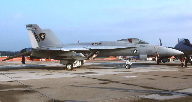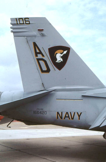 現在 アメリカ海軍航空部隊を埋め尽くすFA-18ホーネット一族の訓練を担当する部隊で、NASオシアナに本拠地を置く。元々は、太平洋戦争末期の1945年1月に、グァム島のアガナ海軍基地で誕生したVBF-17と言う飛行隊の流れを汲むスコードロンである。このVBF-17と言う飛行隊、南太平洋海戦で日本海軍に撃沈されたCV-8ホーネットの2代目として完成したCV-12ホーネットに艦載され、硫黄島戦、沖縄戦に参加。また初めて大規模な九州・四国爆撃に従事した部隊として記録されている。1946年に東海岸のノーフォーク海軍基地に移動するが、朝鮮戦争にも参加し主要な橋梁の爆撃などを担当したとある。1958年にはダグラスA4D-2スカイホークを受領、ベトナム戦でも複数の空母を乗り換えて1967年から1968年にわたる戦闘に参加している。1984年、NASセシルフィールドで現在のVFA-106に名称変更となり、新鋭のFA-18A/Bを受領、その後オシアナに移動して2005年当時F-14の影が薄くなったオシアナでは、既に主のような存在になっていた。(2004/1 記)