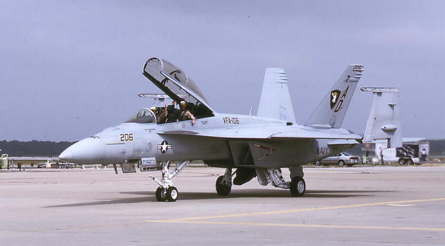 VF-106も遂にスーパーホーネットを受領して転換訓練を担当するようになった。上写真は2005年9月オシアナOHの展示機FA-18E(166420)。FA-18E/F配備に反対する地元住民の運動の影響で、中々東海岸のスーパーホーネットの拠点として、この基地の運用を本格化できなかったが漸く配備も完了した。しかし、当初は反対運動が根強くあり、基地を閉鎖して他の基地への移転も考慮されていた時期もあった。