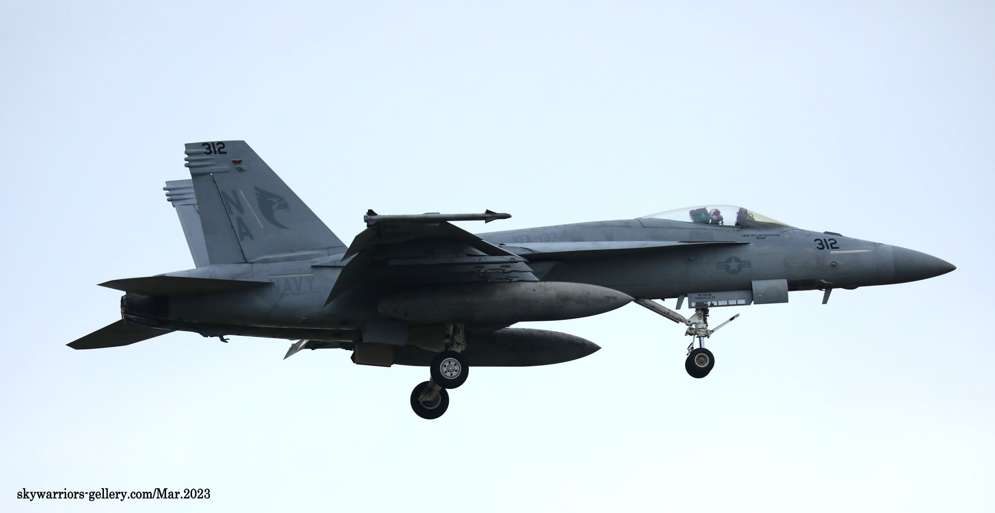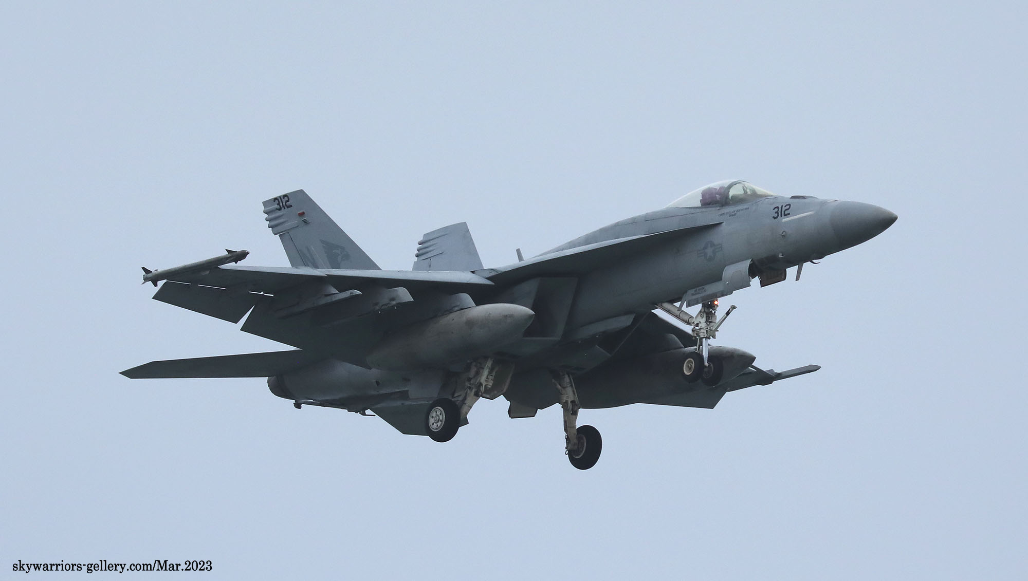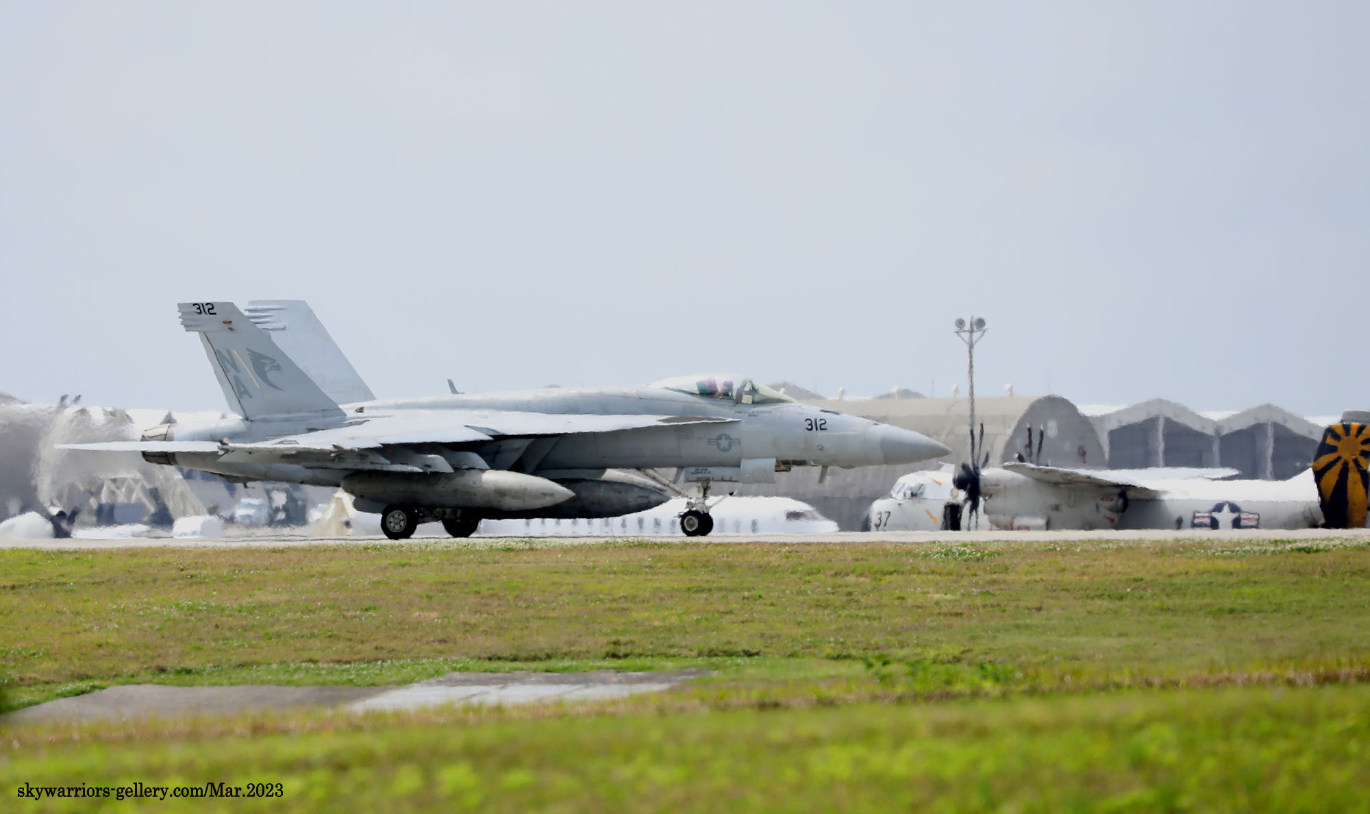 2023年3月某日 嘉手納のR/W05に降り立つVFA-137のFA-18E NA-312。恐らく調子の悪かったNA-313のアシストで続いて降りてきた。