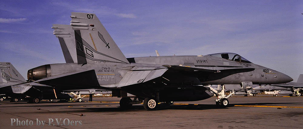 ベトナム戦たけなわの頃、空母打撃群の攻撃力を高めるため多くのA-7コルセア攻撃機中隊が創設された。しかし冷戦終了後は飛行隊の数が大幅に縮小されると共に、軍縮で生き残った攻撃飛行隊も次世代機に取り替わっていった。VA-147も軍縮時代を生き残り、A-7Eとして1988年のソウルオリンピックの周辺警戒任務を最後に1989年FA-18Cに機体交換をした。今までの攻撃専門部隊から制空戦闘機の役割も負えるFA-18Cを受領したことから部隊名もVFA-147に変更された。このFA-18Cは特に夜間任務での機能強化が図られた型だそうだ。