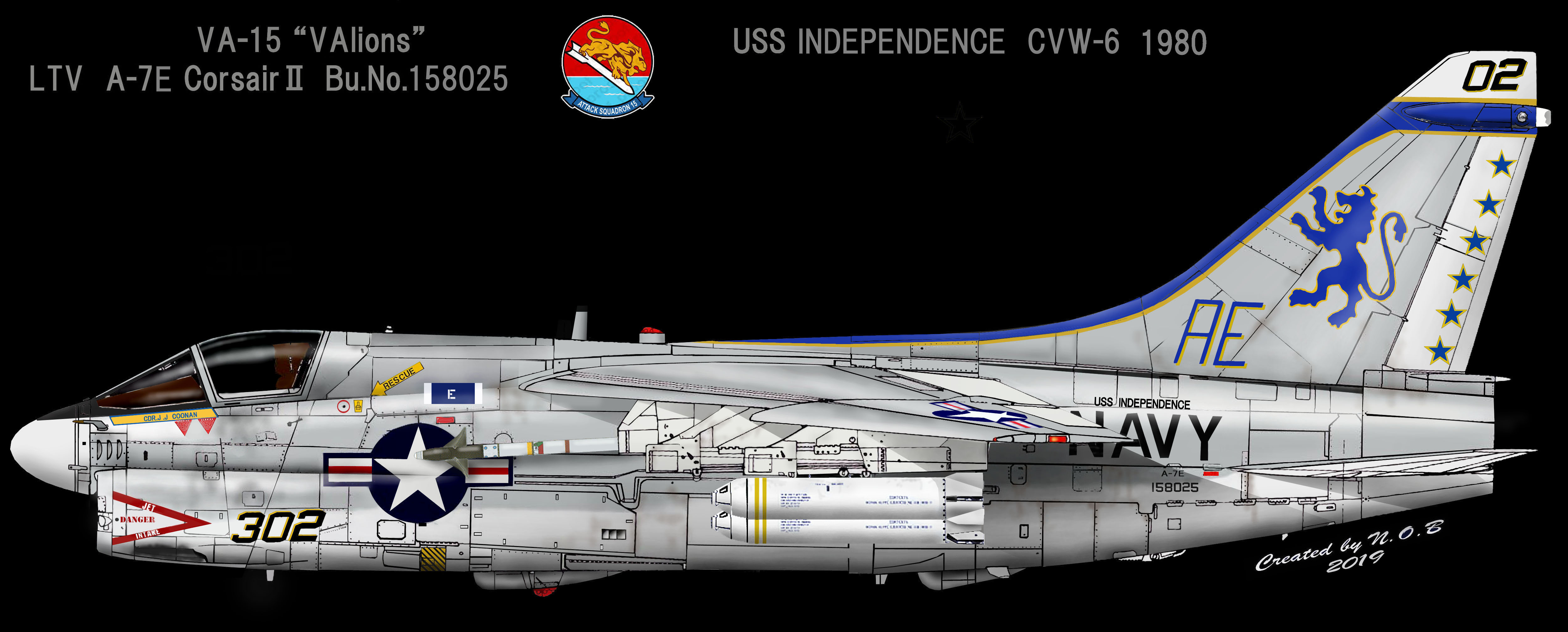 1979年からUSSアメリカからインディペンデンスの搭載に変更されたが、CVW-6所属のままで”AE”のテールレターをずっと使っていた。但し従来の真っ白な尾翼の下地は、海軍上層部の低視認性の要求に押されて無くなってしまった。イラストに描いたMk-20 クラスター爆弾は、対戦車用小型爆弾を247発収容できるもので、投下後時限信管により殻が2つに分離して子爆弾を一定地域にばら撒く仕掛けである。空対空ミサイルは、1978年頃から使い始めたAIM-9L。
