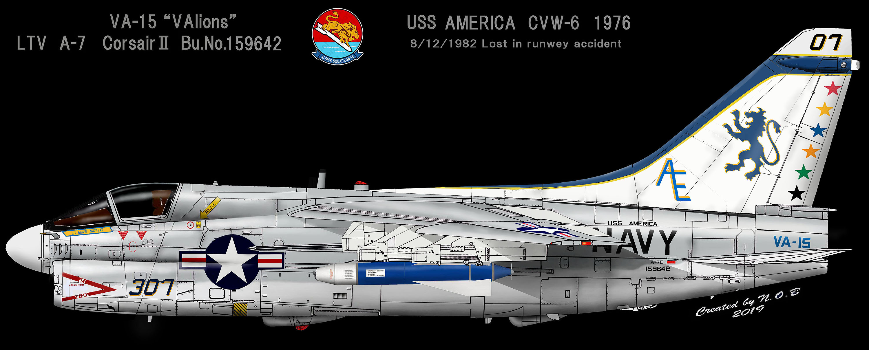 この部隊 1965年にA-4スカイホークを受領しベトナム戦を戦っているが、一度解散し1968年に当時新鋭のA-7Bを受領して再び復活している。翌年からVA-15と言う正式部隊名が与えられた。A-7Eの頃は、尾翼を純白に塗りこめ青いライオンを描いた塗装で、軍用機とは思えない美しい塗装であった。ロービジになってからだが、日本の枠に基地にMAG-12の配属となって来ているので撮影した方も多いことだろう。1986年の10月にFA-18Aホーネットを受領してVFA-15に改称されている。このページでは、まずVA-15時代のA-7B/EコルセアUのマーキングをイラストからご紹介する。(2004/1 記)