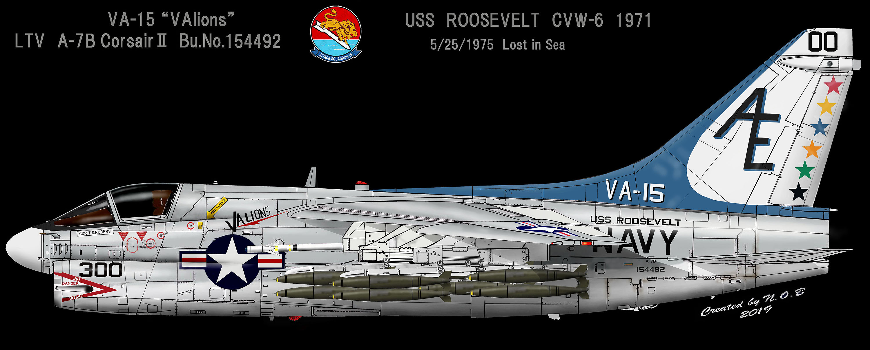 1969年から配備されたA-7B時代の塗装例。ライトブルーを基調としたマーキングで、時期は1973年ごろのもの。その時期はライオンの絵柄がなかった。但し 時期によって胴体国籍マーク上に”VALion”の文字が入っていた。空母ミッドウェイクラスの同型艦でCVA-42 フランクリンDルーズベルトに搭載されて遠征航海に出ることが多く、1975年の空母ルーズベルト引退までこの艦に載っていたが、大西洋方面に配備されていた時期が長い為、ベトナム戦での記録はない。装着している空対空ミサイルは、AIM-9B