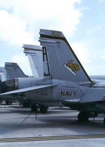 VFA-15は、1992年にFA-18AからFA-18Cに機種転換をした。搭載された空母は1993年から現在まで一貫してCV-71”USS セオドア・ルーズベルトであり、尾翼のエッジを飾る黒のラインは、A-7時代からのデザインの踏襲である。機首のModex-300の左斜め下に書かれたマークは、これである。↓