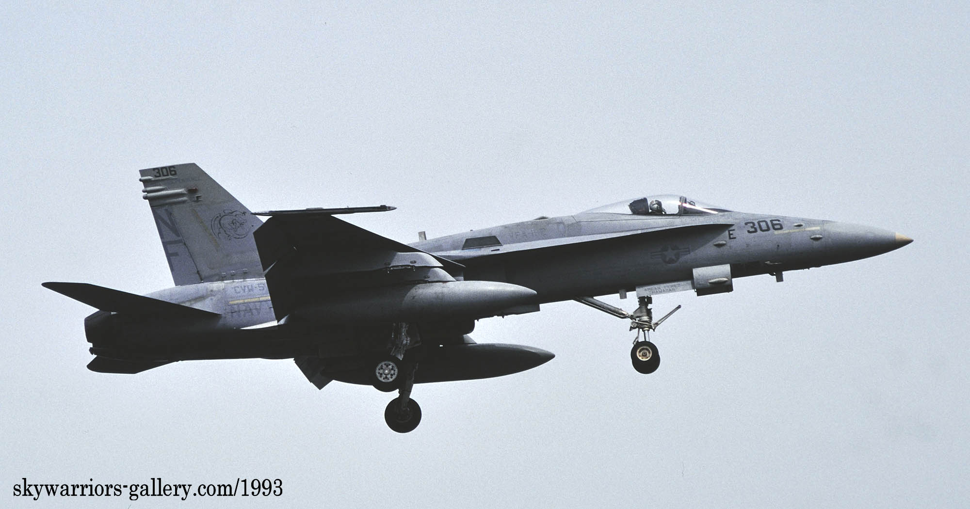 ↑ 1991年までのマーキングと異なるのは、インシグニア等が薄くなっただけではなく、何と入れたばかりのフォールス・キャノピーを消してしまった事。つまり視界範囲での接近戦を想定した疑似コクピットはあまり意味が無いと判断されてきたのか・・・・翌1994年には年姉妹飛行隊VFA-195もフォールス・キャノピーを消すことになる。レーダーの性能が上がり、中距離ミサイルAMRAAMを使いことが多くなれば、視界外での空戦が主になるからかもしれない。