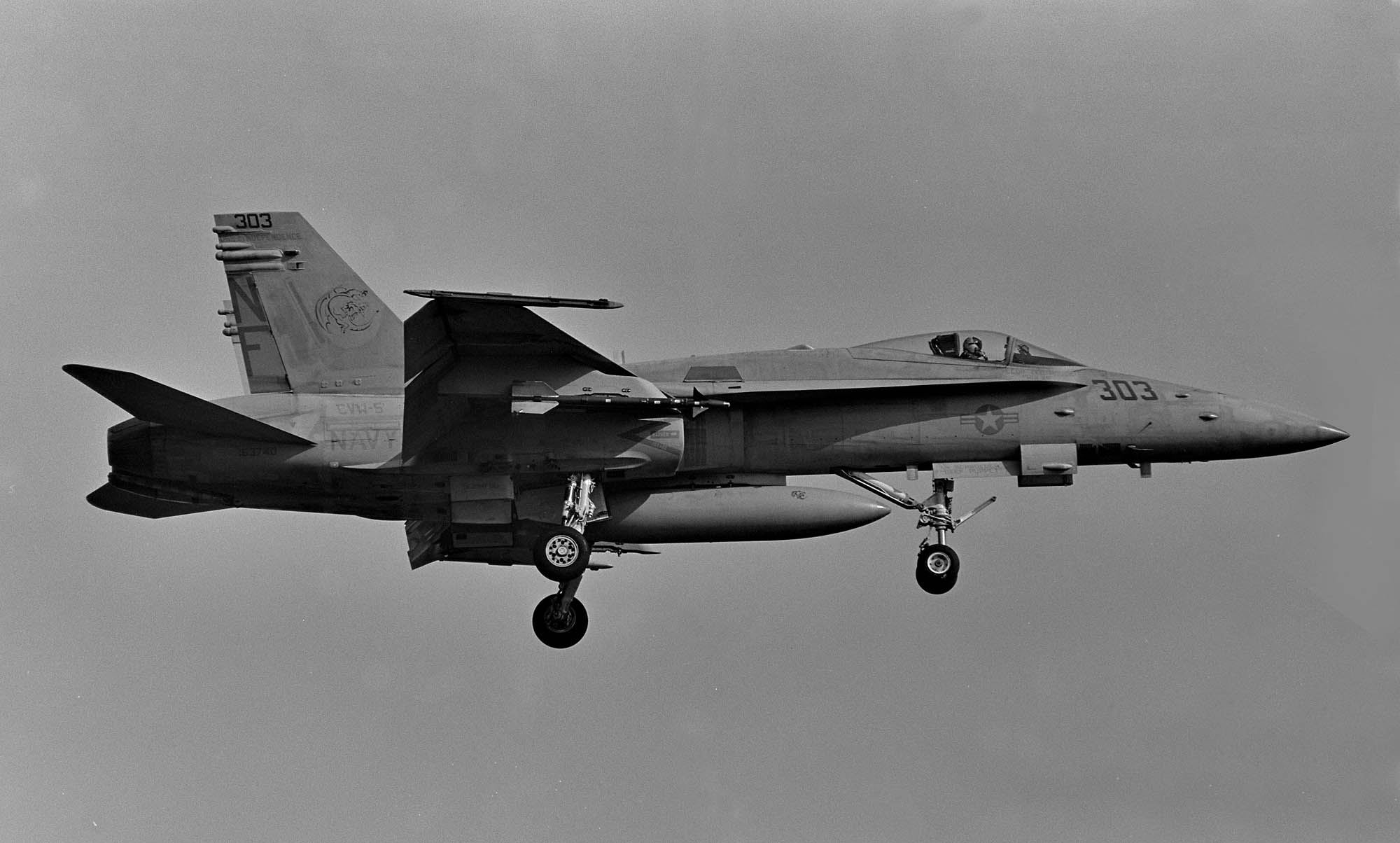 ↑ パイロンにサイドワインダーミサイルの模擬弾を付けているが、AIM-9Mと言う最新型のはずである。FA-18Cは、両翼端に2発、左右パイロンに計4発のAIM-9を装着でき、胴体下にAIM-7