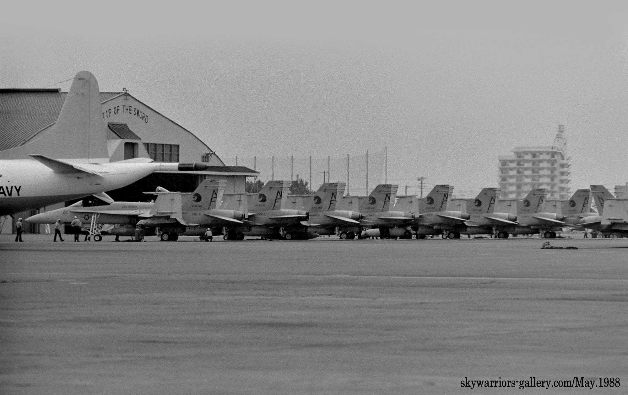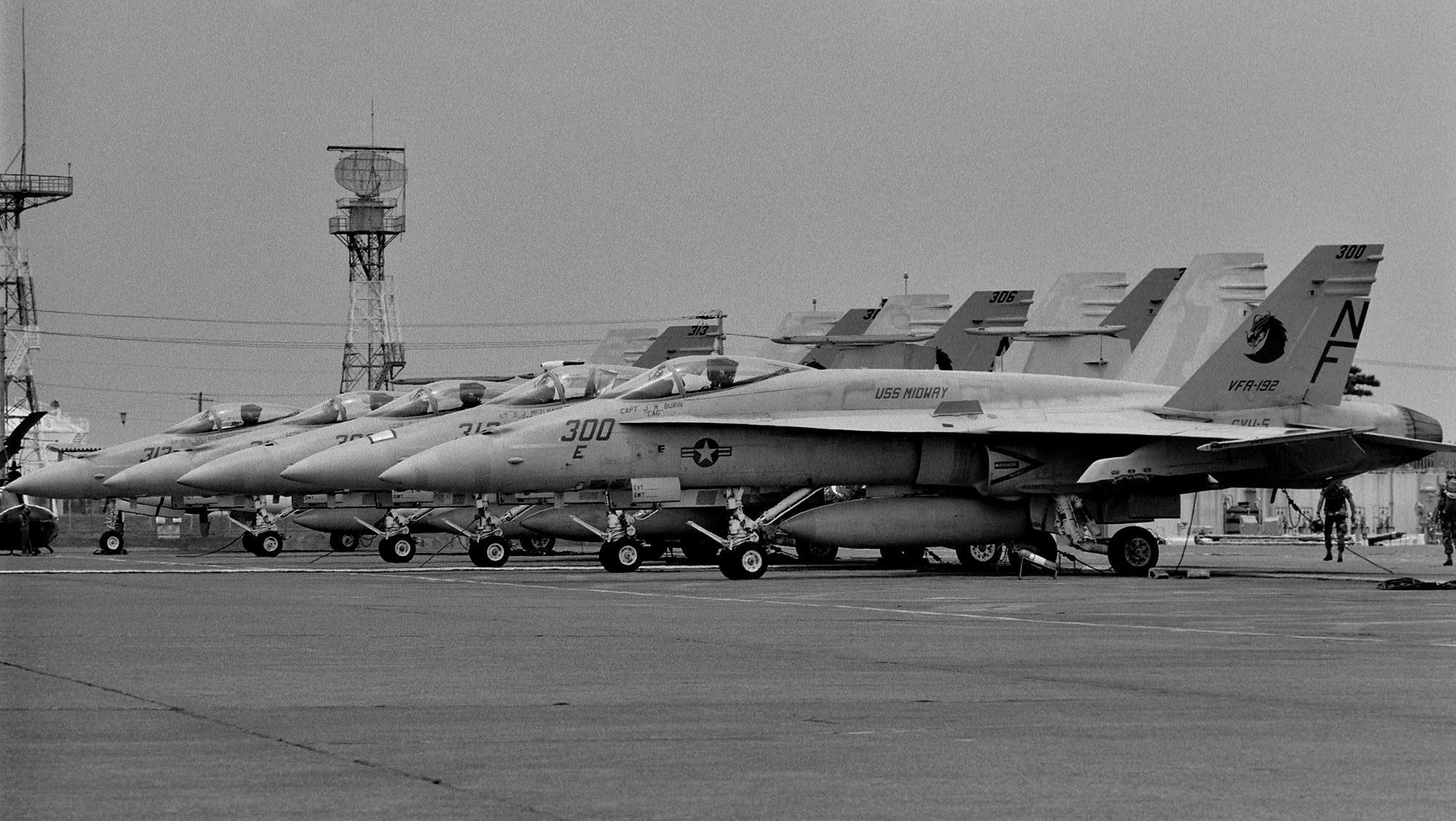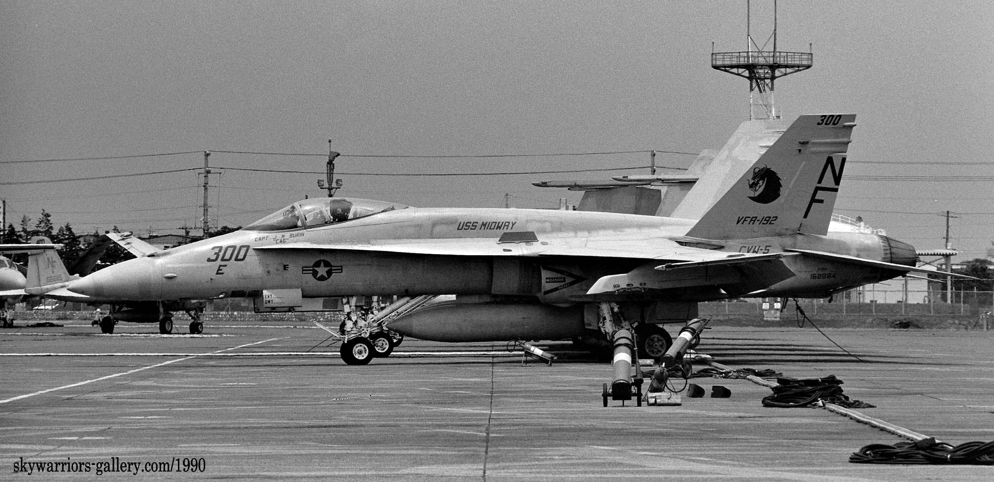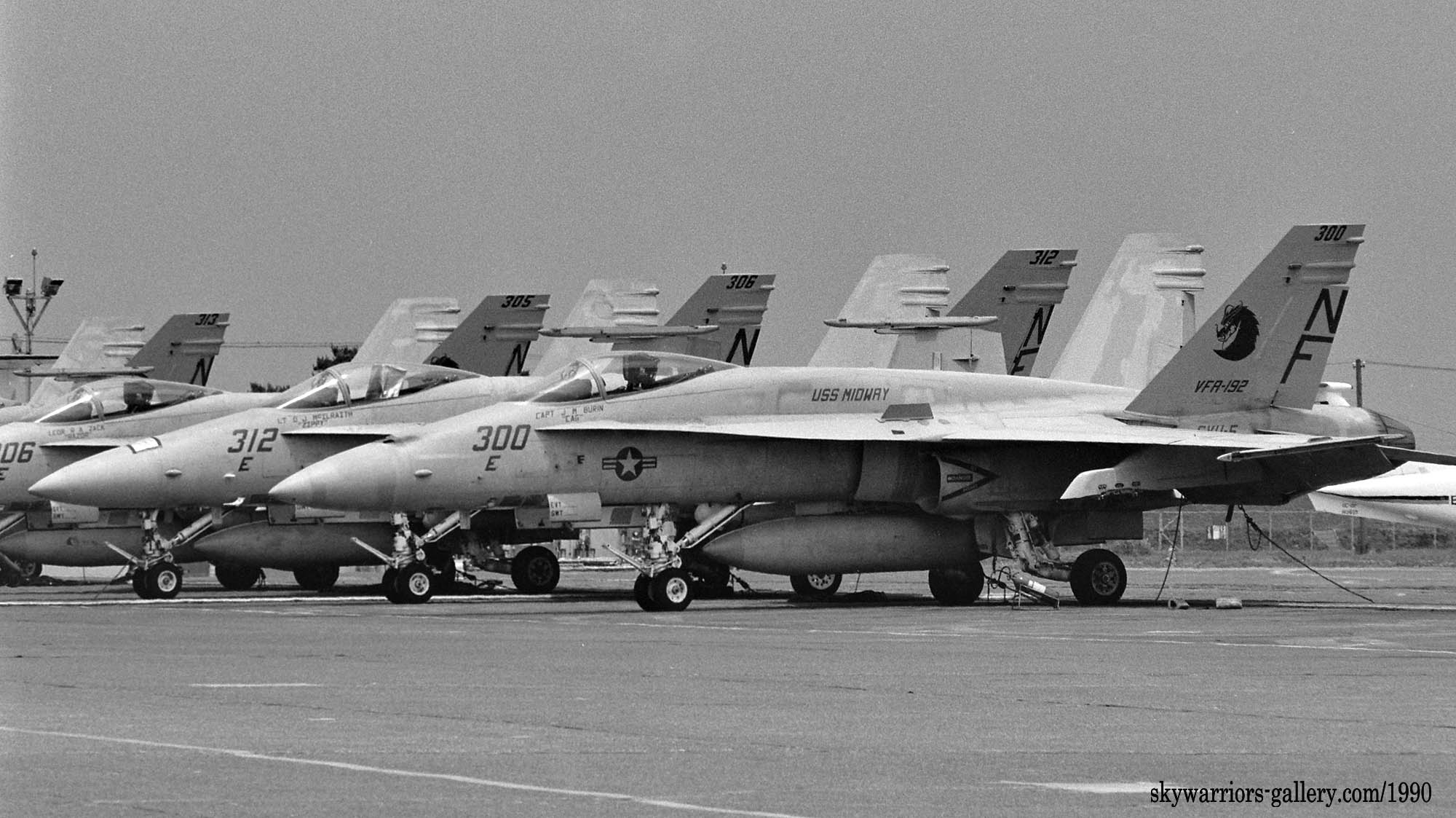 ↑ USSミッドウェイに配備されて間もないVFA-192は1988年の厚木基地公開日、遠方であったが列線を見る事が出来た。 NF-300.ドラゴンが暗いグレーで書き込まれ 胴体に”USS MIDWAY”の文字、もちろん配備当時はA型である。VFA-195と異なりテールレターは、最初からラダーに”NF”と描かれていた。
